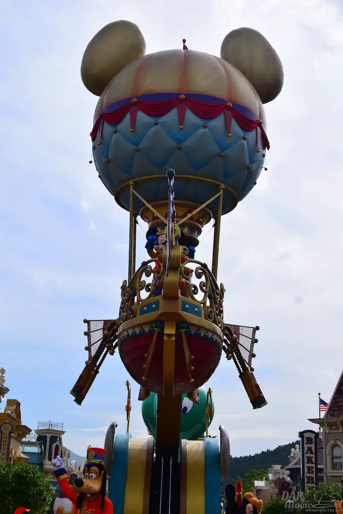 The moving show starts with Dumbo and the marquee. From behind him you can hear the live marching Disneyland band playing along to the lively music. It sets the stage for a lively parade and catchy tunes along the way. After Dumbo is Mickey and the rest of the Fab 5 on their own float. A steampunk style flying ship holds the main mouse, while Goofy, Donald, Pluto and Minnie are underneath. Mickey has an aviator outfit on, while the rest have some unique costumes for the occasion.