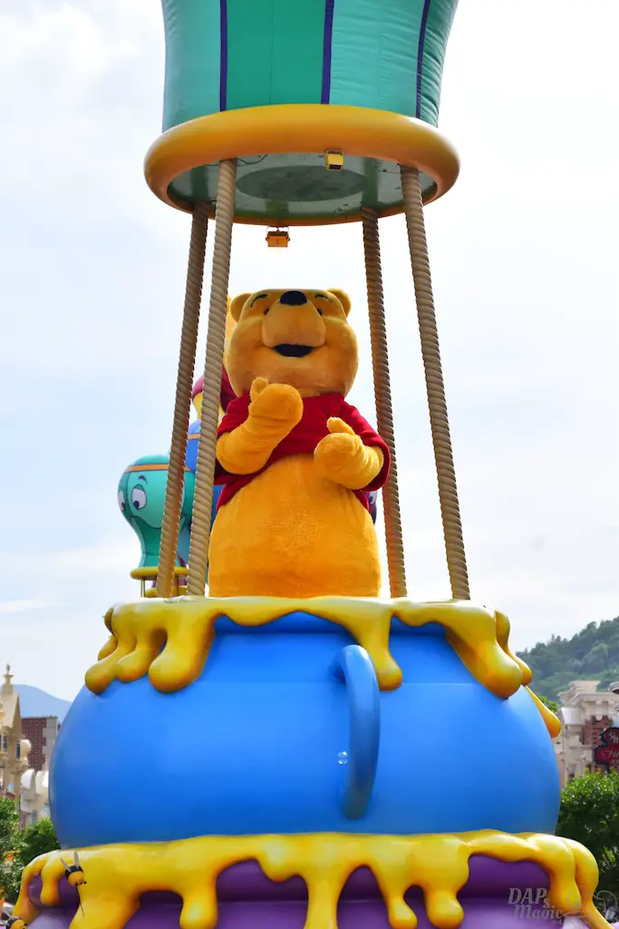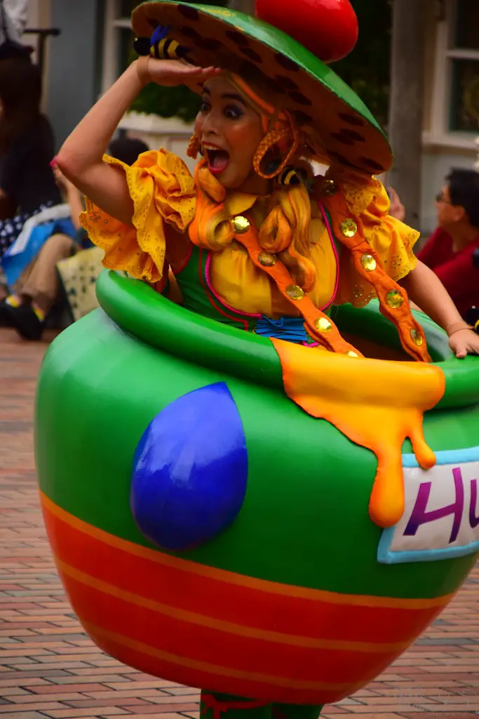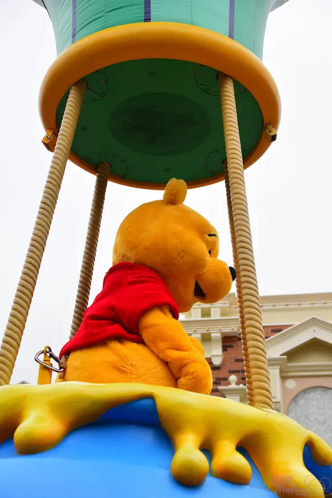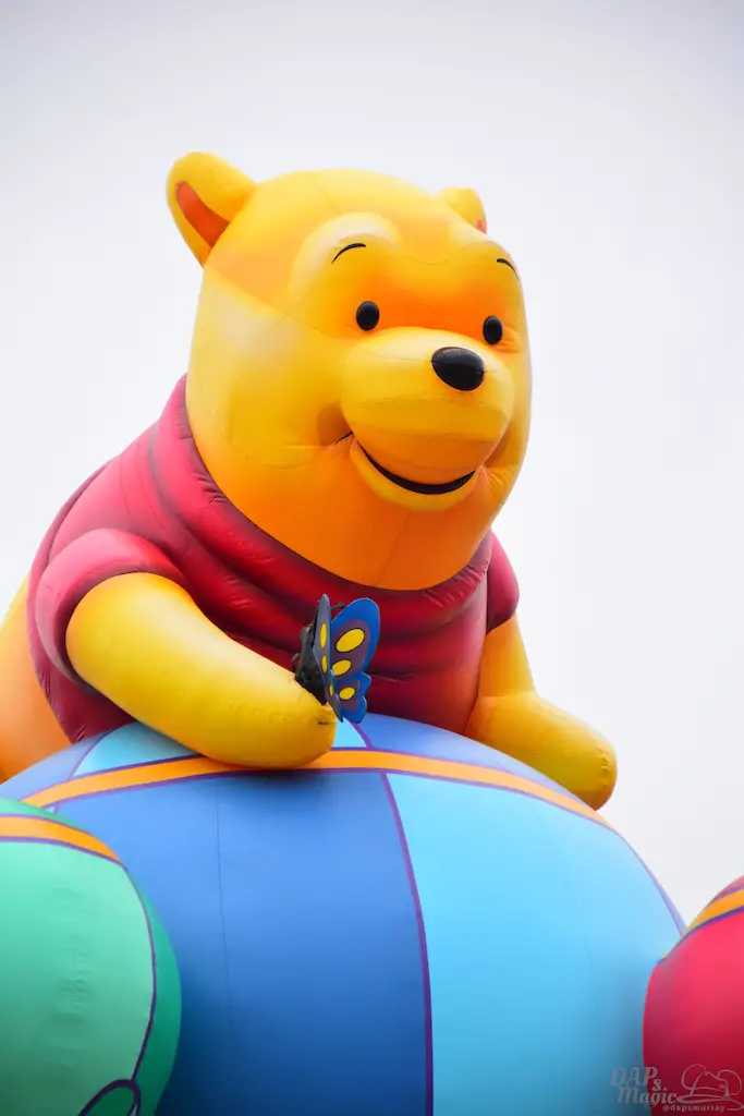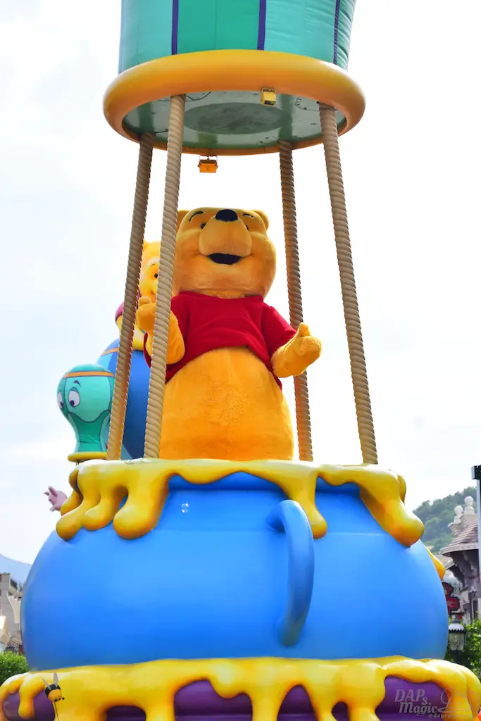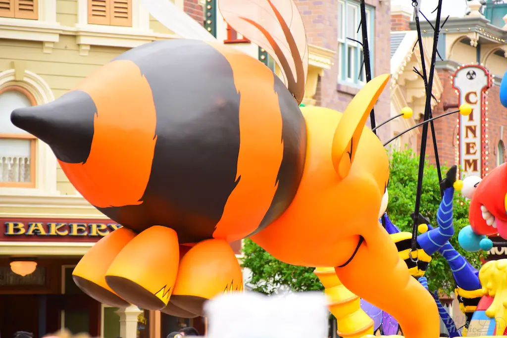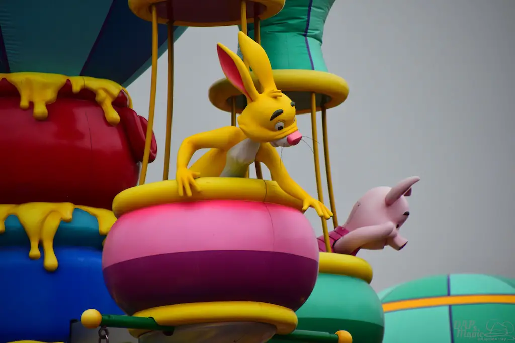 Winnie the Pooh in a Heffalump infested flying honey pot is atop the next float. The rest of the Hundred Acre Wood crew is along the rest of the float. There are several performers in appropriate Tigger and honey type costumes. There are some bouncing acrobats on the float representing more of Tigger’s signature moves. The float is akin of the Heffalump and Woozle dream Pooh has as there are many of the creatures all around it.