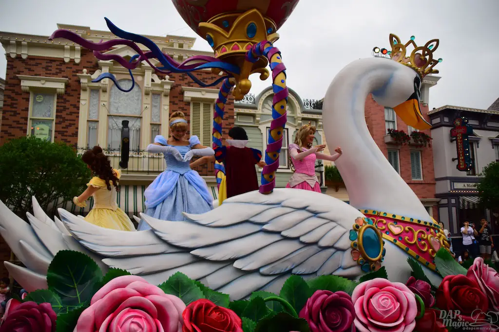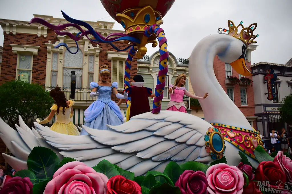 Following Pooh and company is a princess-centric swan float. Aurora, Snow White, Cinderella, and Belle are together in this lavish vehicle. Dancers dance around the royal welcome as well.