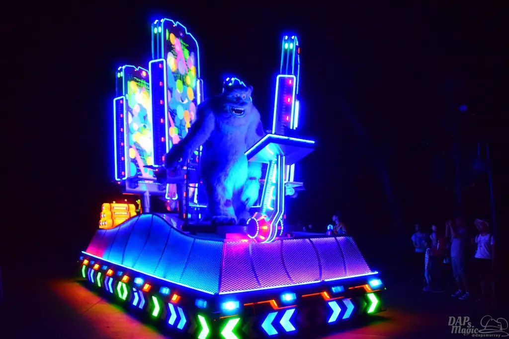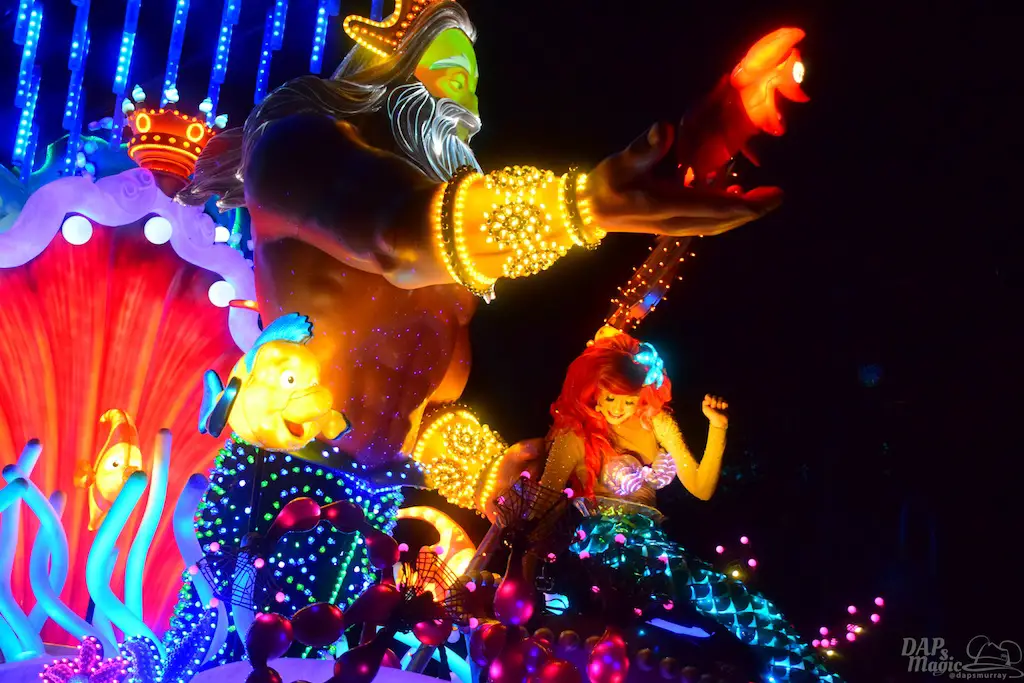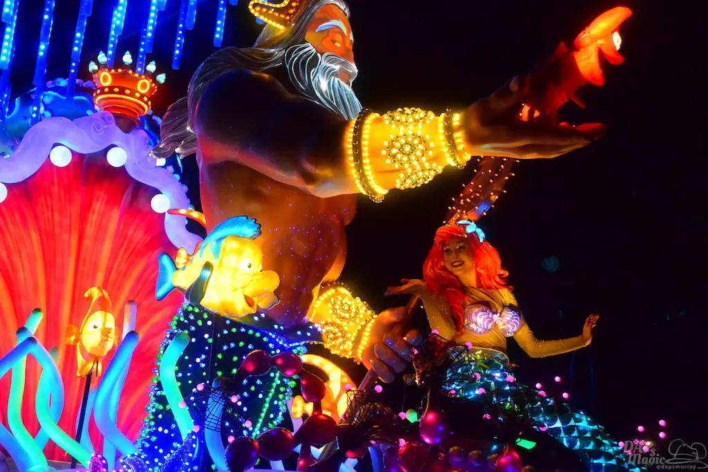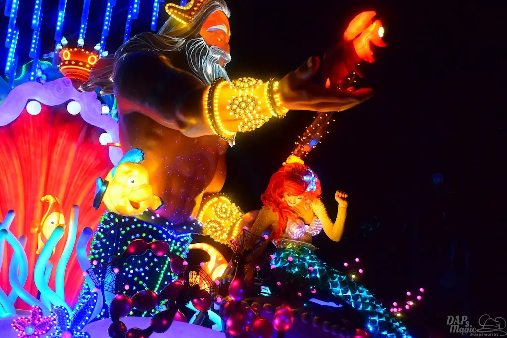 But, first, an explanation of the order. The parade begins with the usual Tinkerbell flying above her fairy friends. The Monsters Inc. Scare Floor unit follows after. Sully, Mike, and a few doors all dance to the music. Lightning and Mack follow after, and a crew of dancing racers. After that it’s Ariel, Triton, Sebastian, and