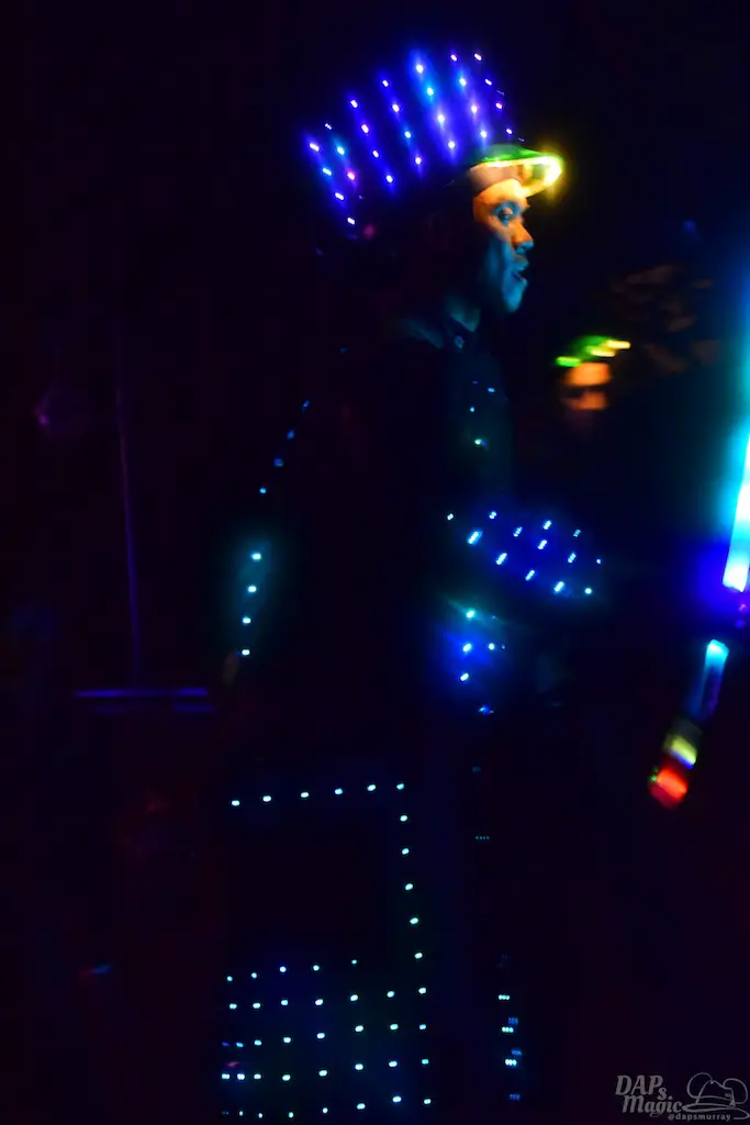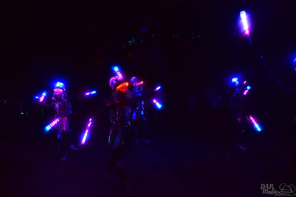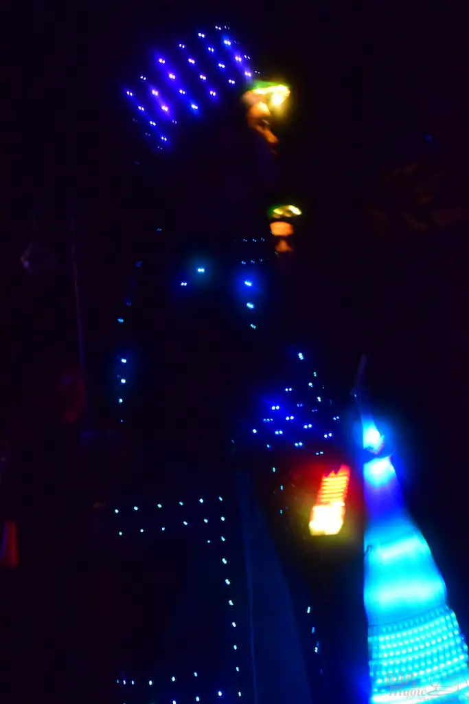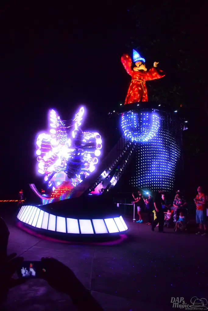 Flounder with some aquatic dancers before and after the float. Belle and the Beast’s rose are behind this. Ballroom lights and dancers precede and follow the float. Slinky Dog with Woody and Buzz are the next section. Then it’s the finale with Goofy, Donald, and Minnie aboard magical lit up vehicles with Mickey Mouse as the Sorcerer’s Apprentice aboard the whimsical sculpture float.