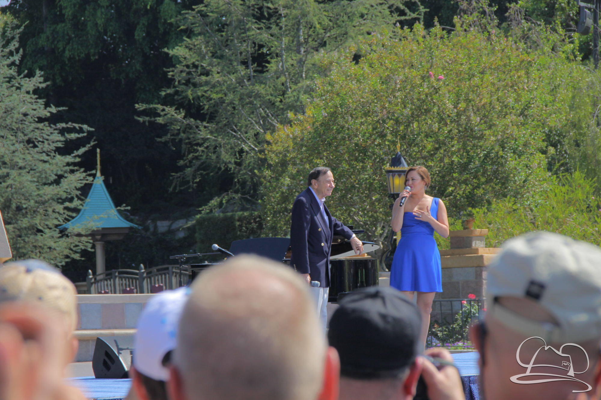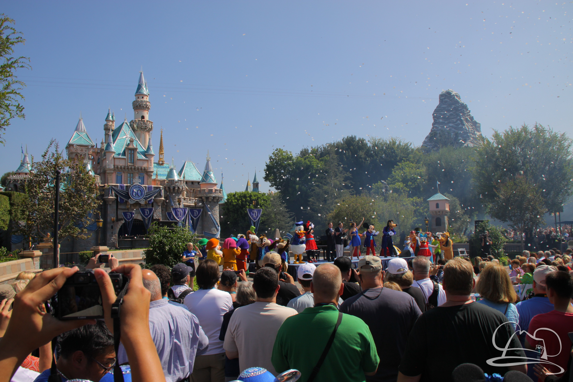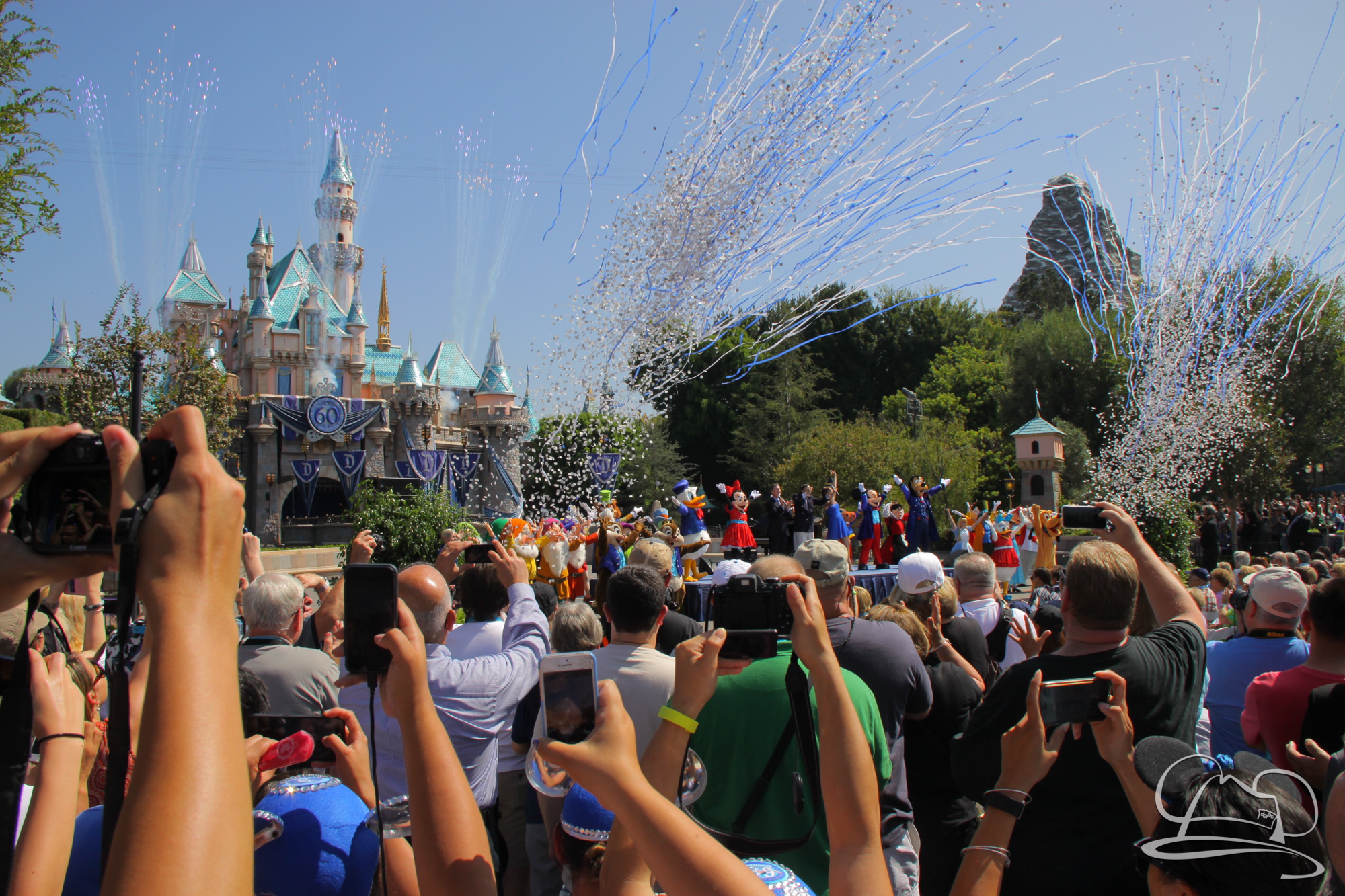 There were two very special festivities that occurred on Disneyland’s official 60th birthday. The first was a ceremony that took place in front of Sleeping Beauty Castle. Hosted by Disneyland President Michael Colglazier the ceremony recognized both Disney family members and also Disney legends who were in attendance. The Million Dollar Dazzle was also announced with the first gift going to the Girl Scouts (it should be noted that it ended being a multi Million Dollar Dazzle). Then Ashley Brown and Richard Sherman provided a beautiful rendition of Walt Disney’s favorite song, Feed the Birds. The ceremony ended with everyone singing Happy Birthday to Disneyland as Disney characters joined in front of Sleeping Beauty Castle. It was a lovely ceremony. Hearing Feed the Birds performed by Ashley Brown and Richard Sherman will always be a beautiful moment that sticks out from that day.