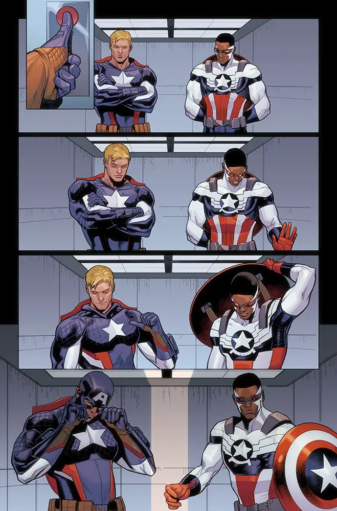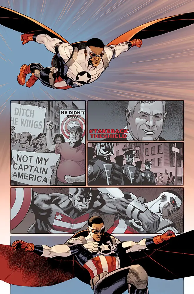 New York, NY—September 22nd, 2016 — Steve Rogers has returned. Then why won’t Sam Wilson give up the shield? Today, Marvel is pleased to present your first look inside CAPTAIN AMERICA: SAM WILSON #14, the first chapter in the new story arc “Take Back the Shield”! Sam Wilson stands at the crossroads of a divided nation. When the terrorist organization Ultimatum and their leader the Flag-Smasher begin to wreak havoc, Sam Wilson is the first to dive headlong into the fray. Yet as cries of #TakeBacktheShield trend worldwide, can Sam continue to uphold the ideals of Captain America? As he teams with Steve Rogers to take down Ultimatum, is there room in the Marvel Universe for two Captain Americas? Only…Steve has a secret. Be there when “Take Back the Shield” begins in CAPTAIN AMERICA: SAM WILSON #14 – on-sale October 19th!