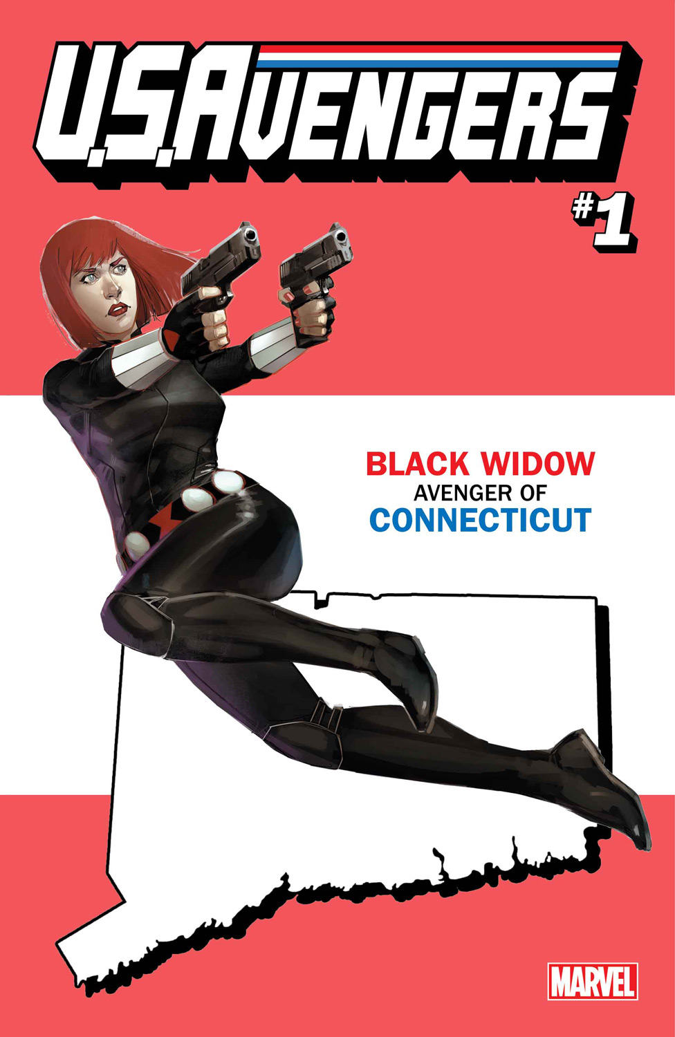 For the launch of this all-new series, U.S.AVENGERS #1 will feature over 50 unique variants assigning one Avengers to that state! Sam Wilson soars high over Maryland, Iron Man rockets across the Golden State of California, Black Widow defends the Constitution State of Connecticut, and Spectrum shines a light on evil in Louisiana. With more state variants to be revealed in the upcoming days, which Avenger will be protecting you?