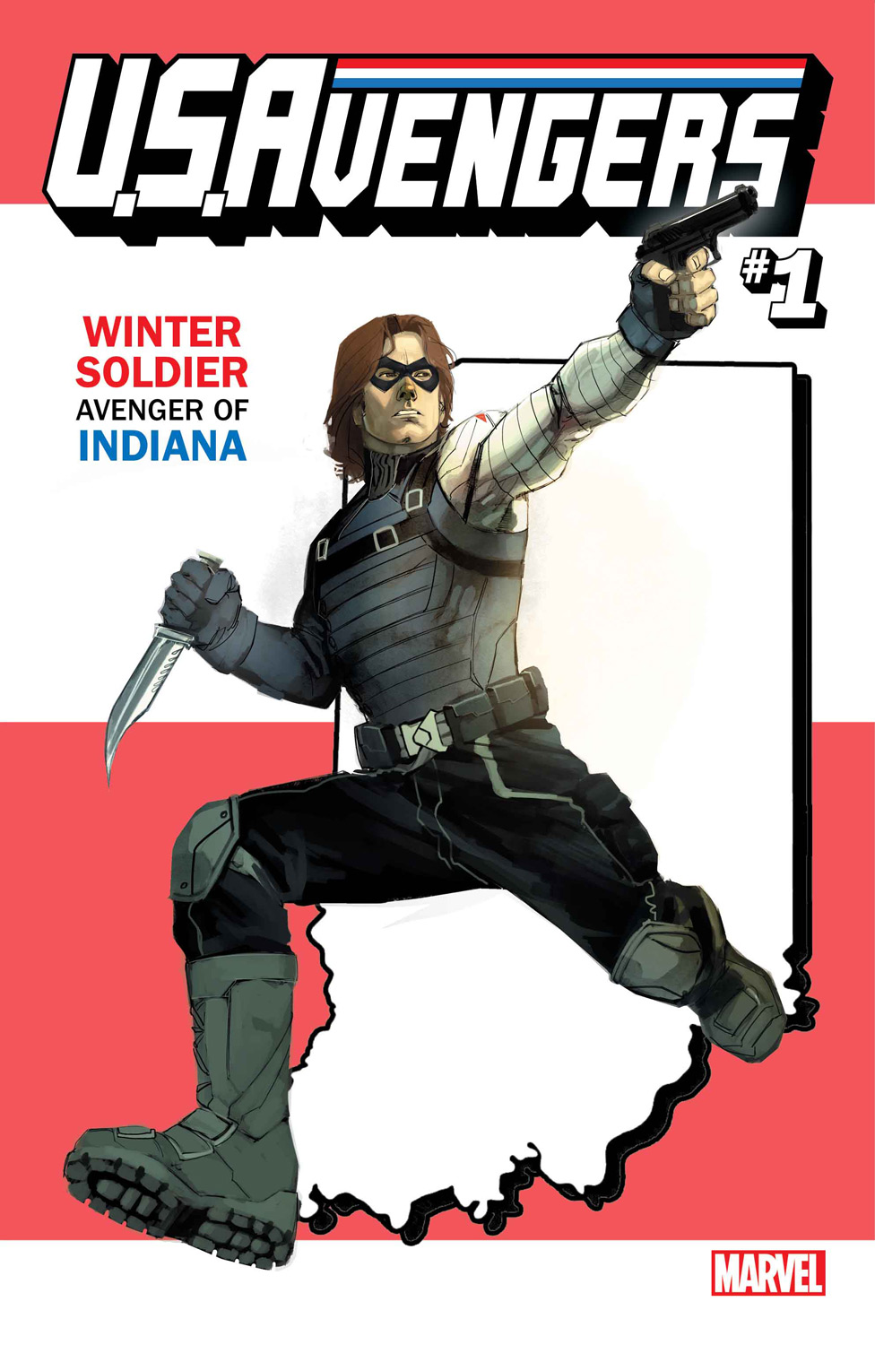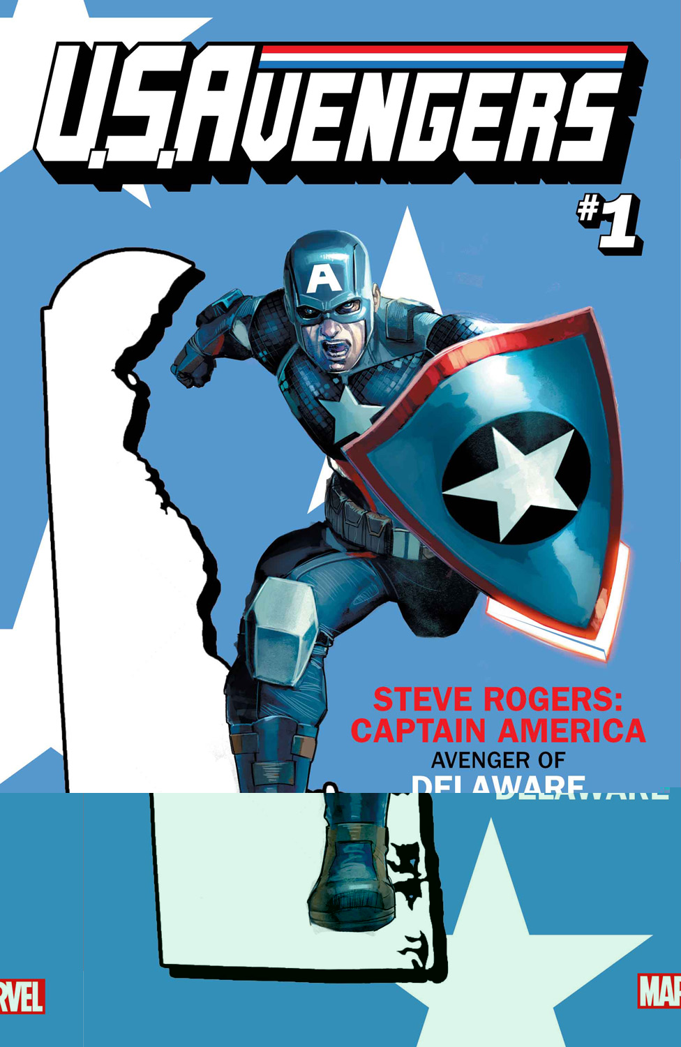 Action, adventure and intrigue draped in the red, white and blue! The U.S.AVENGERS are here and bringing along Avengers for every state. And eagle-eye readers may notice that all 50 variants will connect to form Old Glory herself, the flag of the United States of America.