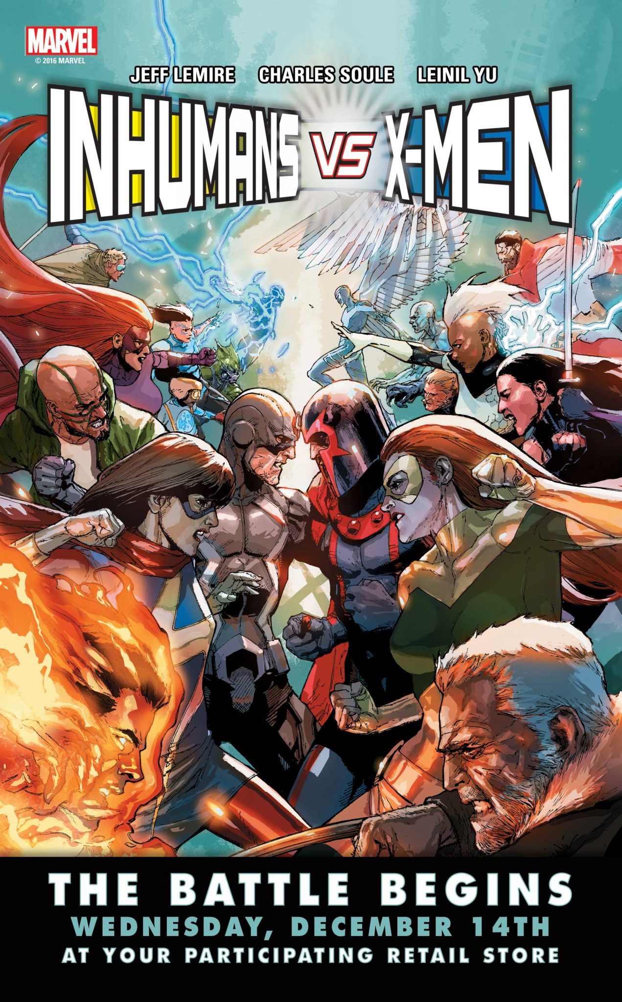 New York, NY—October 21st, 2016 — Two super-powered races clash this December as Mutantkind and Inhumanity collide with the fates of their species at stake! Prepare for battle as Charles Soule (Uncanny Inhumans), Jeff Lemire (Extraordinary X-Men) and Leinil Yu (Secret Invasion) bring you the two groups to war in the explosive INHUMANS VS. X-MEN #1!