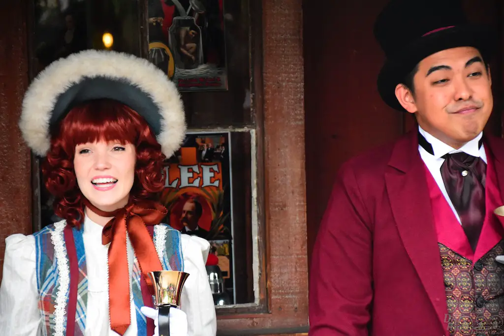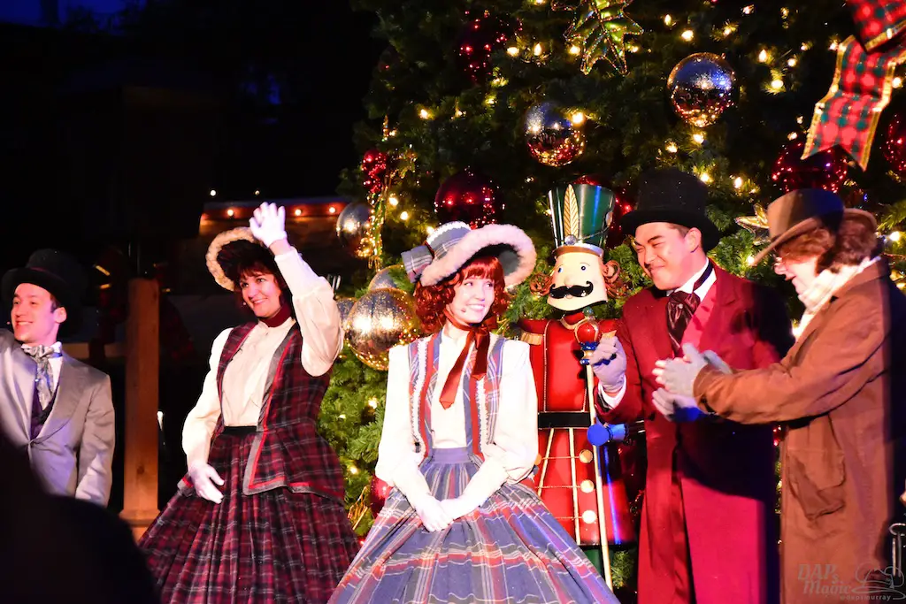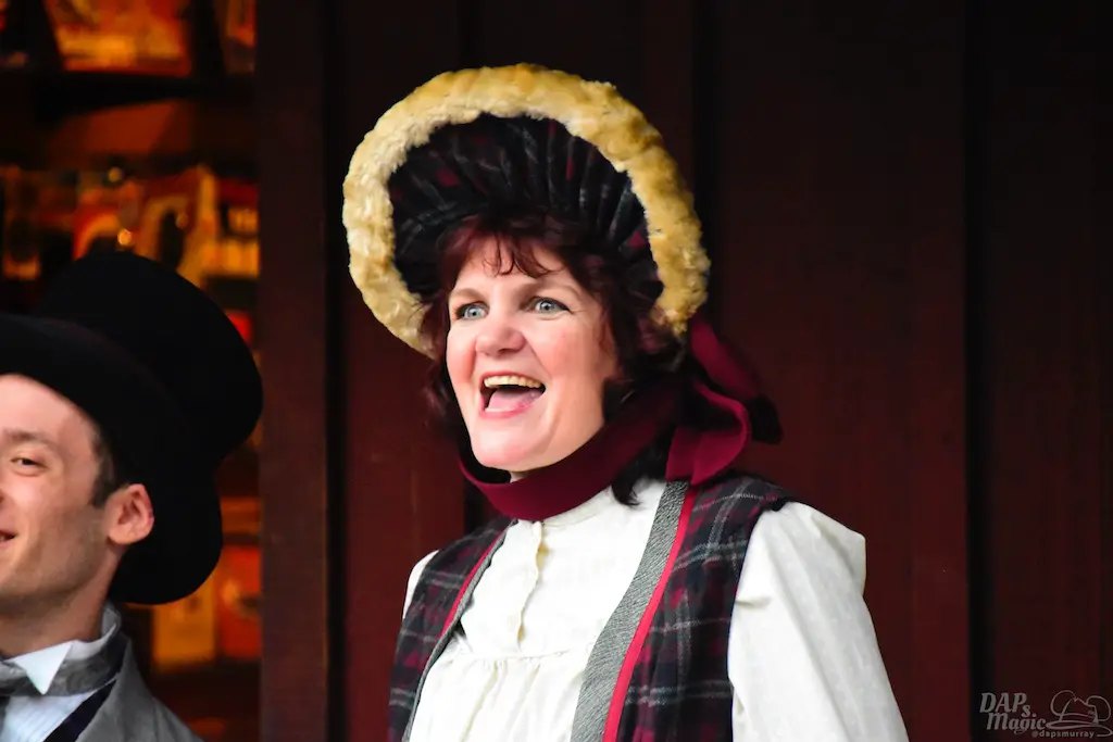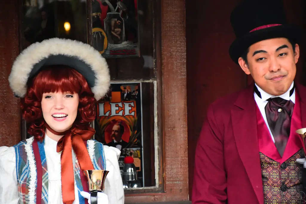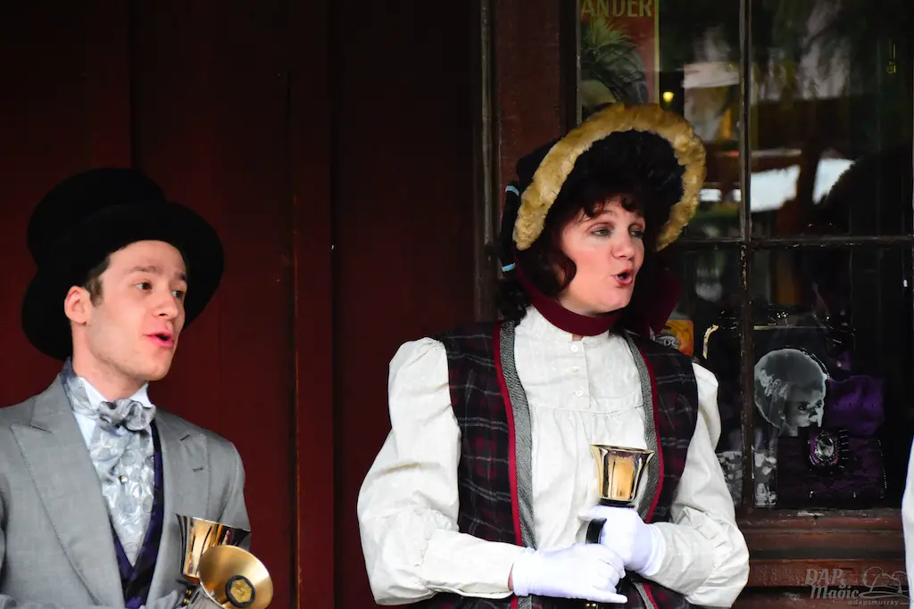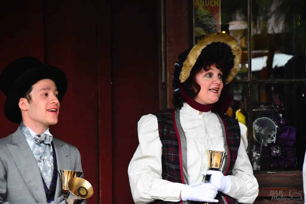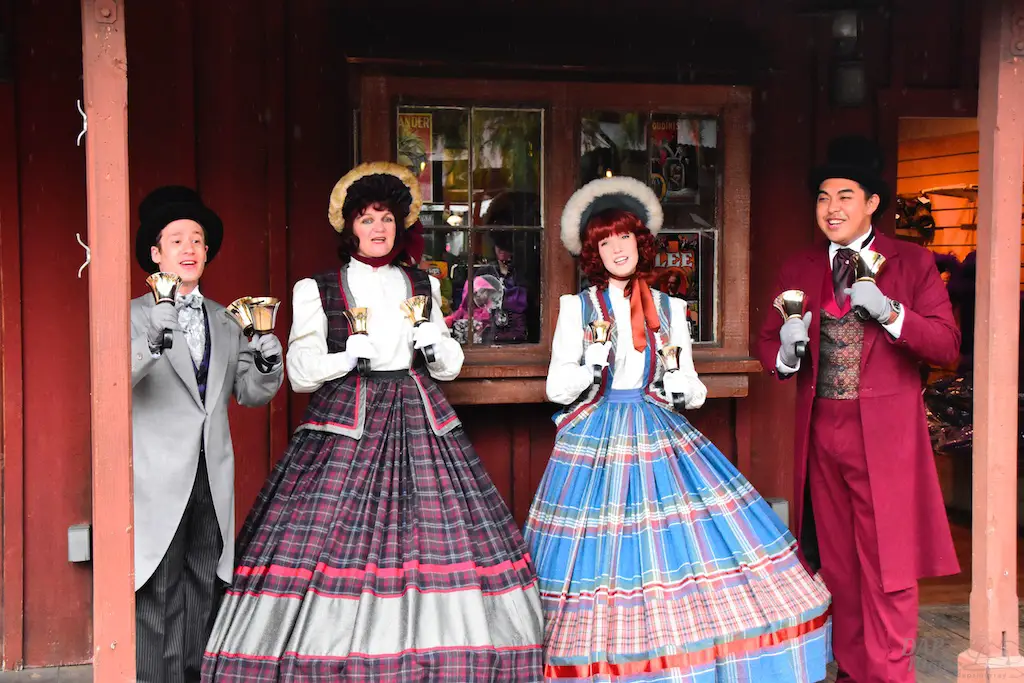 Calico Carolers sing tunes of the yuletide and ring bells. They appear throughout the streets of Ghost Town gathering guests to listen in and enjoy.