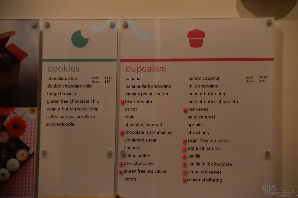 The inside of the shop is simple, but makes it a quaint shop in the Disney shopping area. Small shelves on either side show some items besides cupcakes, while the large case in the middle of the registers showcases the cupcakes themselves. An assortment of cookies are also available.