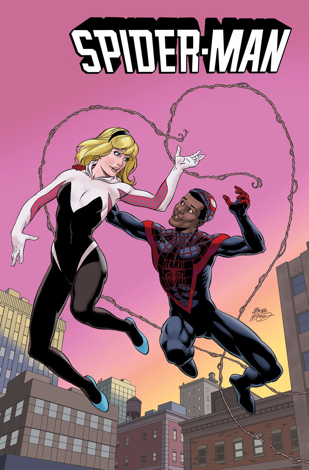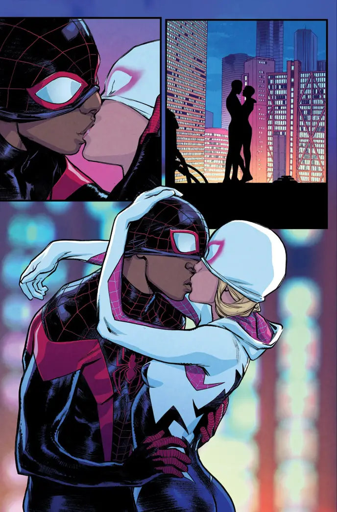 New York, NY—December 8th, 2016 — Gwen and Miles sittin’ in a tree…you know the rest! What you don’t know is the twists and turns that await you inside this brand-new 4-part crossover between Spider-Man and Spider-Gwen! Today, Marvel is pleased to present your first look inside SPIDER-MAN #12 – the first chapter of “Sitting in a Tree”! Blockbuster creators Brian Michael Bendis and Sara Pichelli bring you the kiss heard round the world as love is in the air for Miles Morales and Gwen Stacy. These two webslinging lovebirds collide for an adventure in Gwen’s universe that’s going to rock their respective worlds. It’s all happening when “Sitting in a Tree” kicks off in SPIDER-MAN #12 – coming to comic shops and digital devices on January 11th! Plus, don’t miss the continuing adventures of Gwen and Miles in Spider-Gwen #16 – part 2 of the crossover – also coming in January!