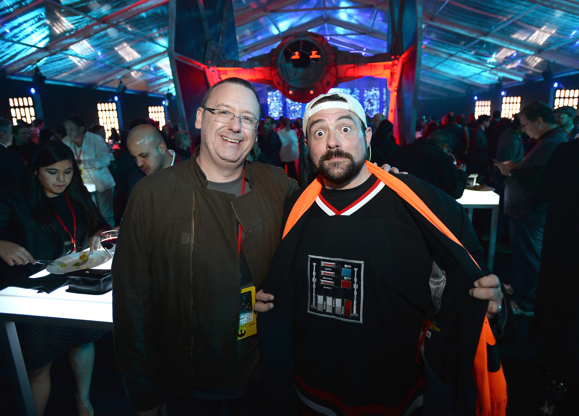 HOLLYWOOD, CA – DECEMBER 10: Filmmaker Kevin Smith (R) attends The World Premiere of Lucasfilm’s highly anticipated, first-ever, standalone Star Wars adventure, “Rogue One: A Star Wars Story” at the Pantages Theatre on December 10, 2016 in Hollywood, California. (Photo by Jesse Grant/Getty Images for Disney) *** Local Caption *** Kevin Smith