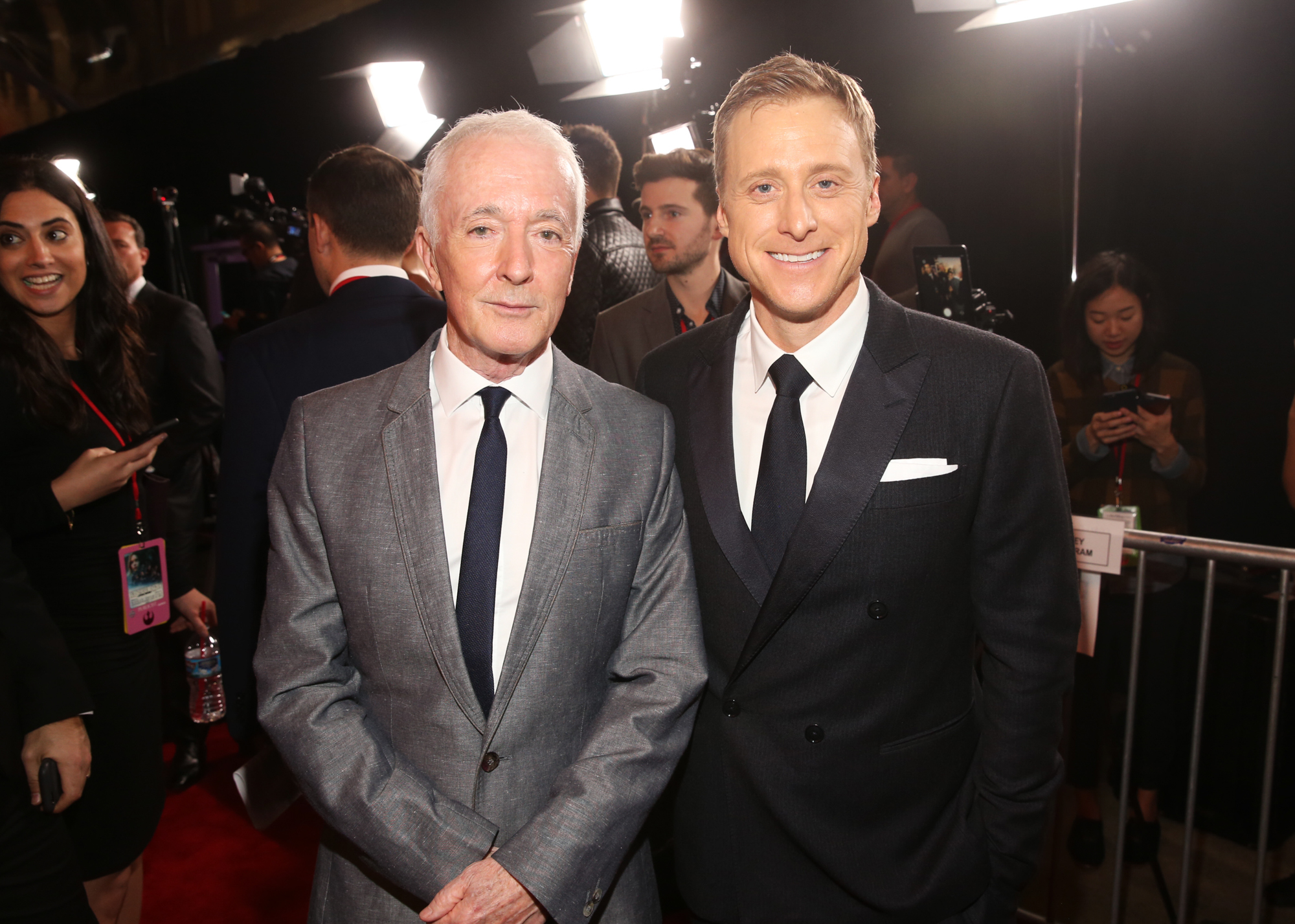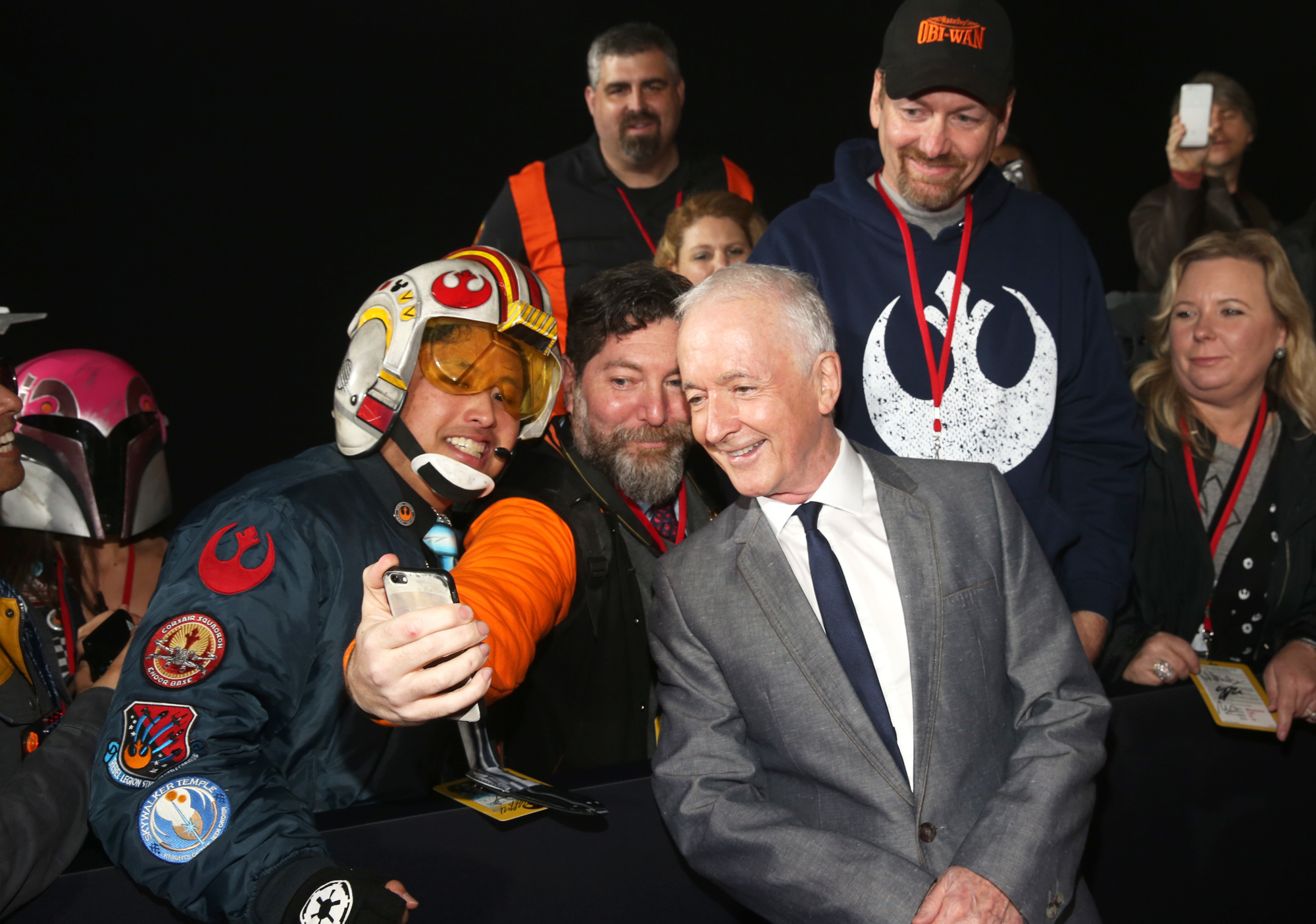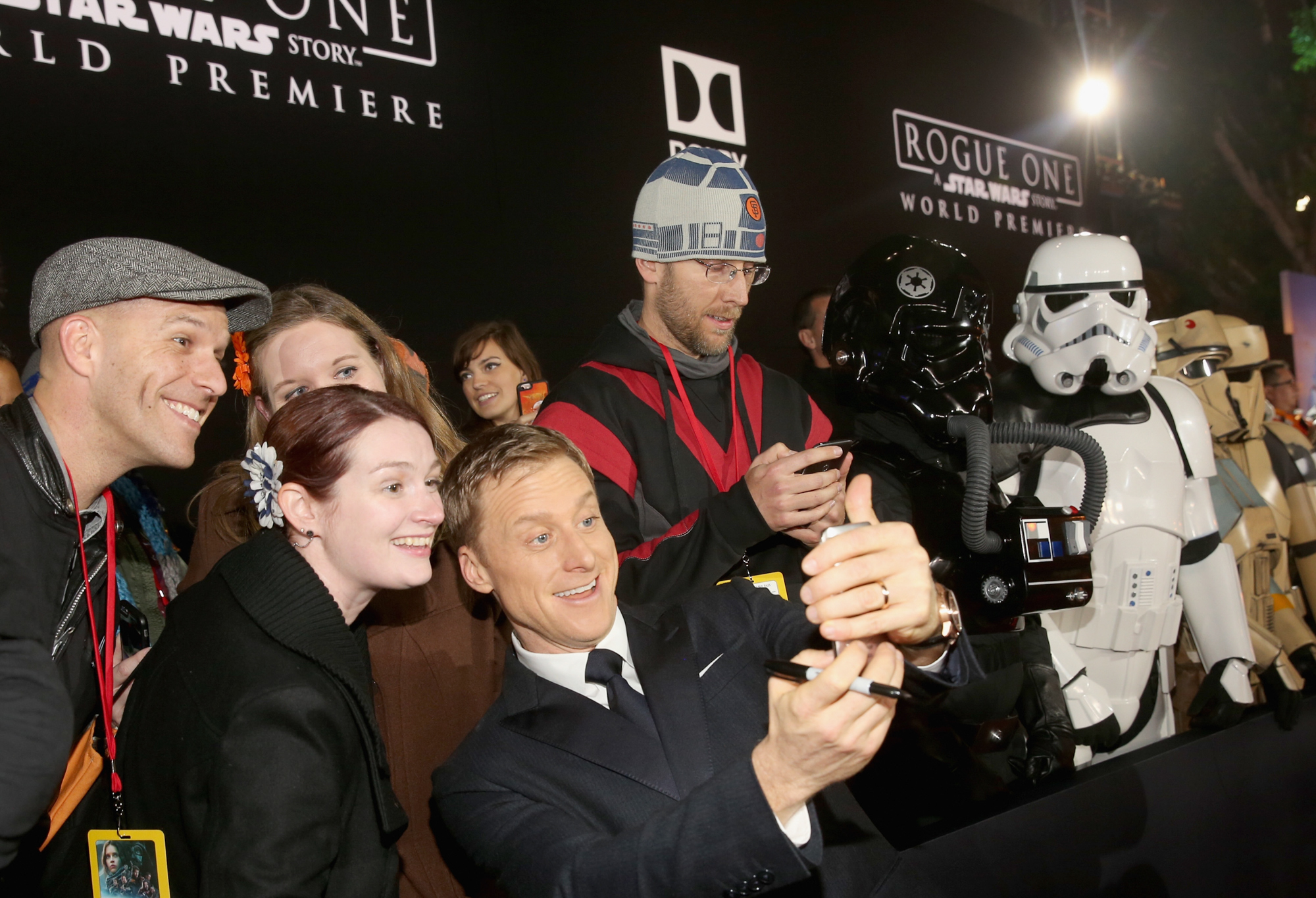 HOLLYWOOD, CA – DECEMBER 10: Actor Alan Tudyk (C) takes a selfie with fans at The World Premiere of Lucasfilm’s highly anticipated, first-ever, standalone Star Wars adventure, “Rogue One: A Star Wars Story” at the Pantages Theatre on December 10, 2016 in Hollywood, California. (Photo by Jesse Grant/Getty Images for Disney) *** Local Caption *** Alan Tudyk