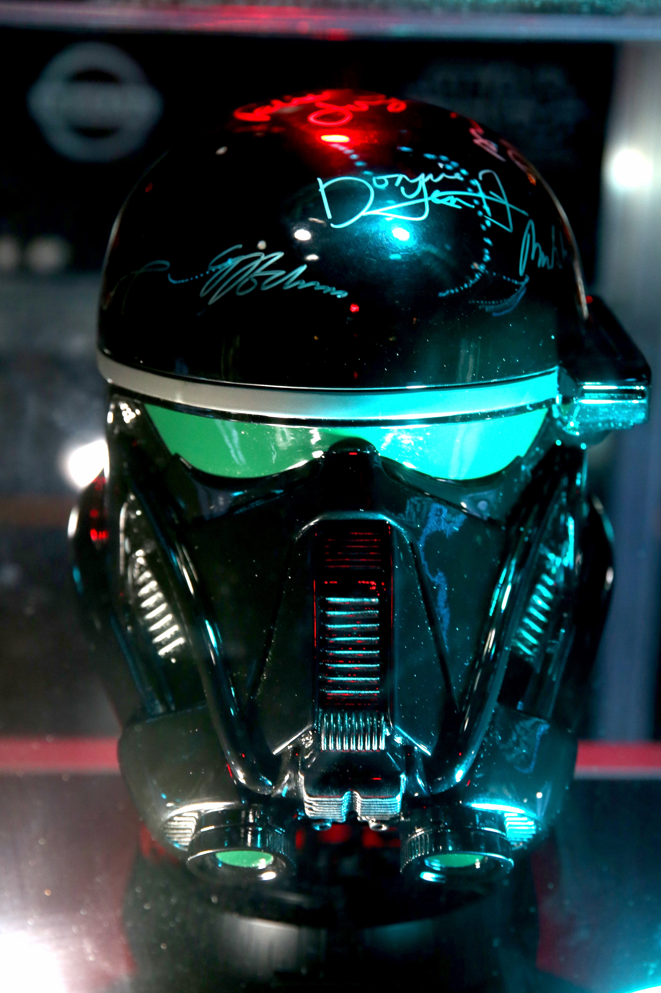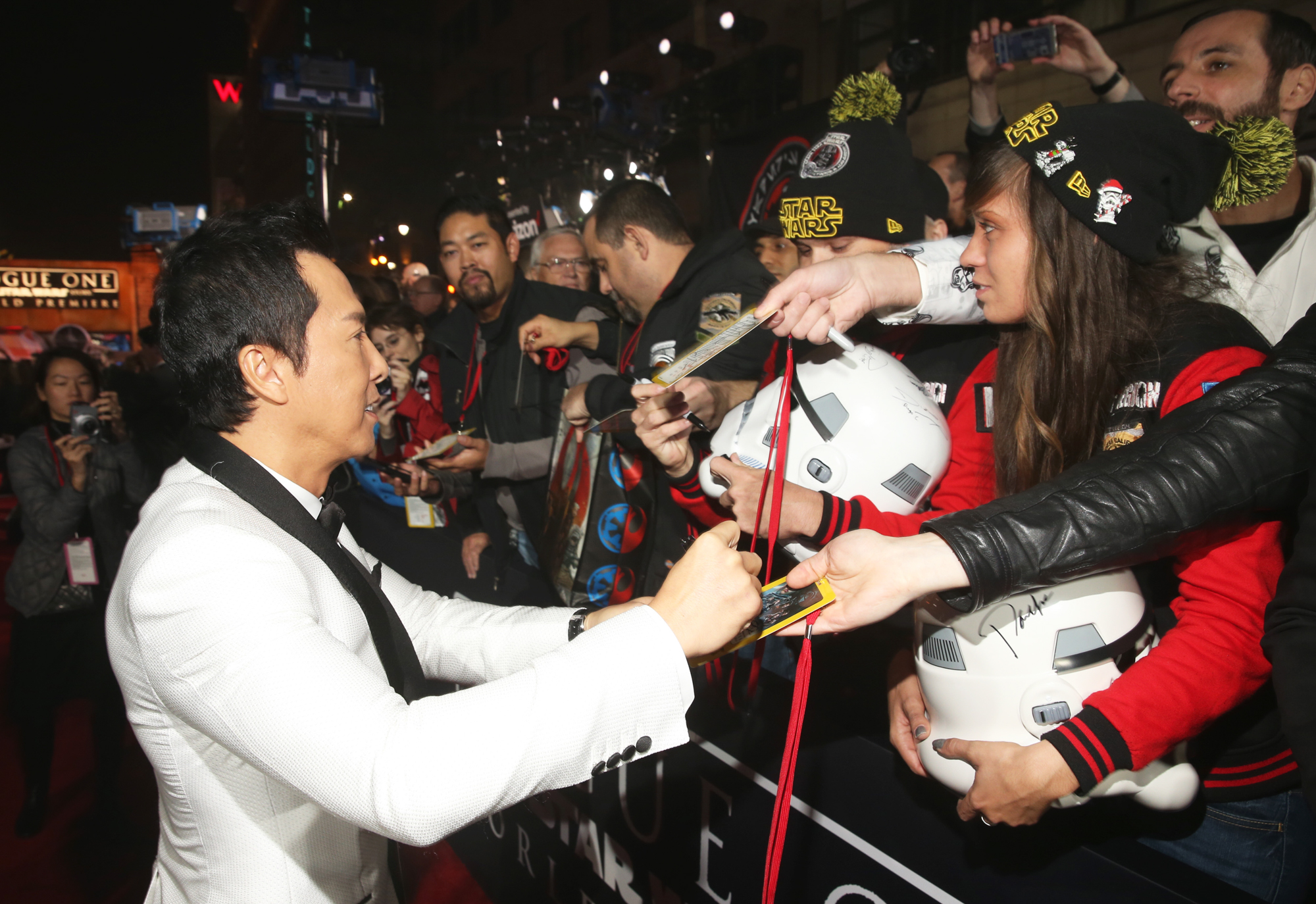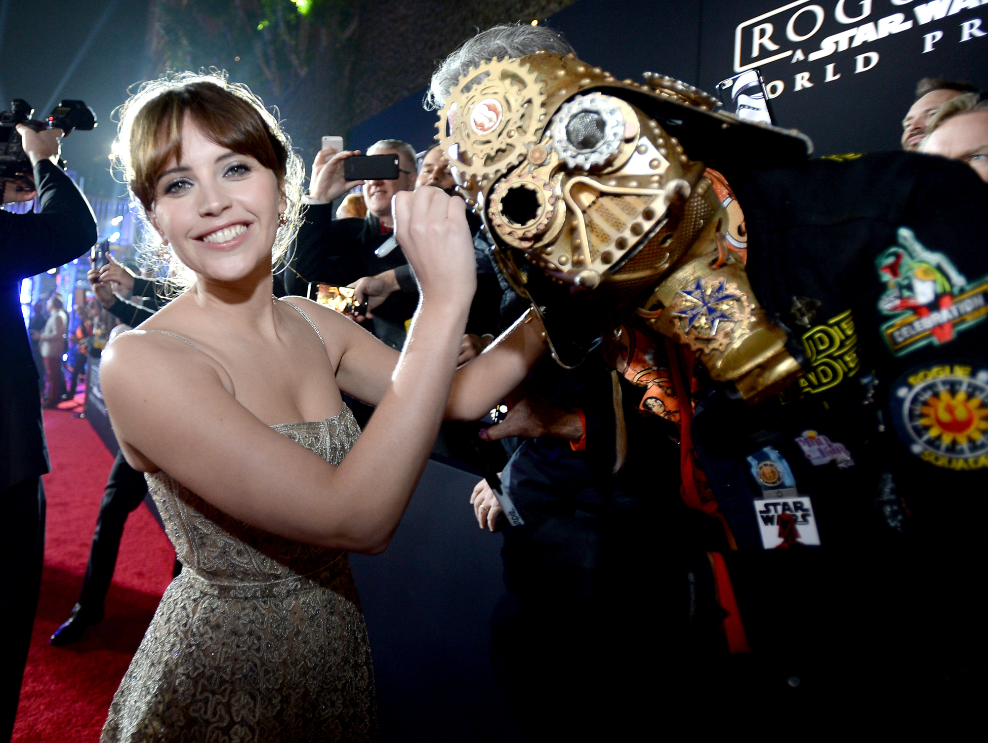 HOLLYWOOD, CA – DECEMBER 10: Actress Felicity Jones (L) signs Christopher ‘Dude Vader’ Canole’s helmet at The World Premiere of Lucasfilm’s highly anticipated, first-ever, standalone Star Wars adventure, “Rogue One: A Star Wars Story” at the Pantages Theatre on December 10, 2016 in Hollywood, California. (Photo by Charley Gallay/Getty Images for Disney) *** Local Caption *** Felicity Jones; Christopher Canole