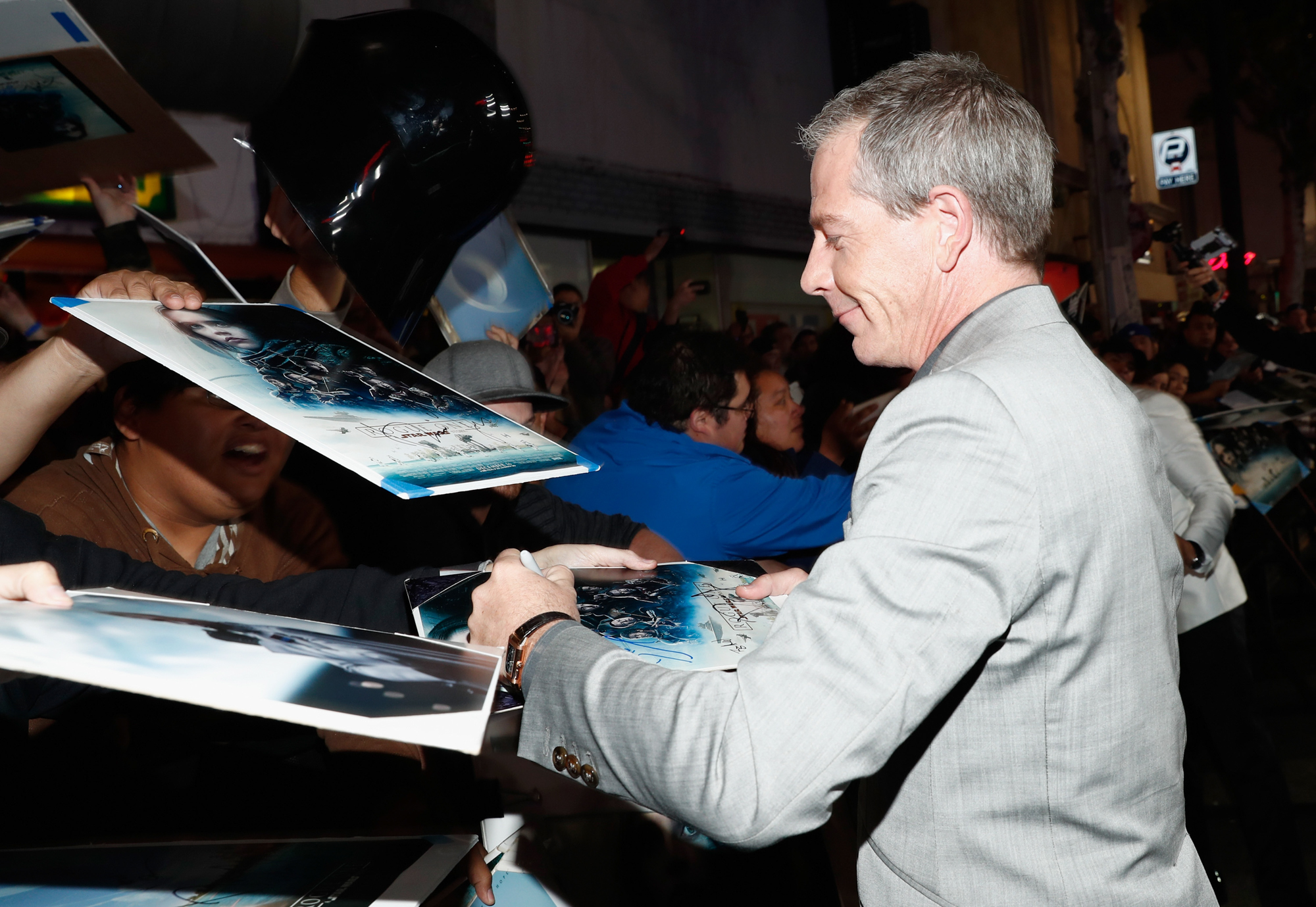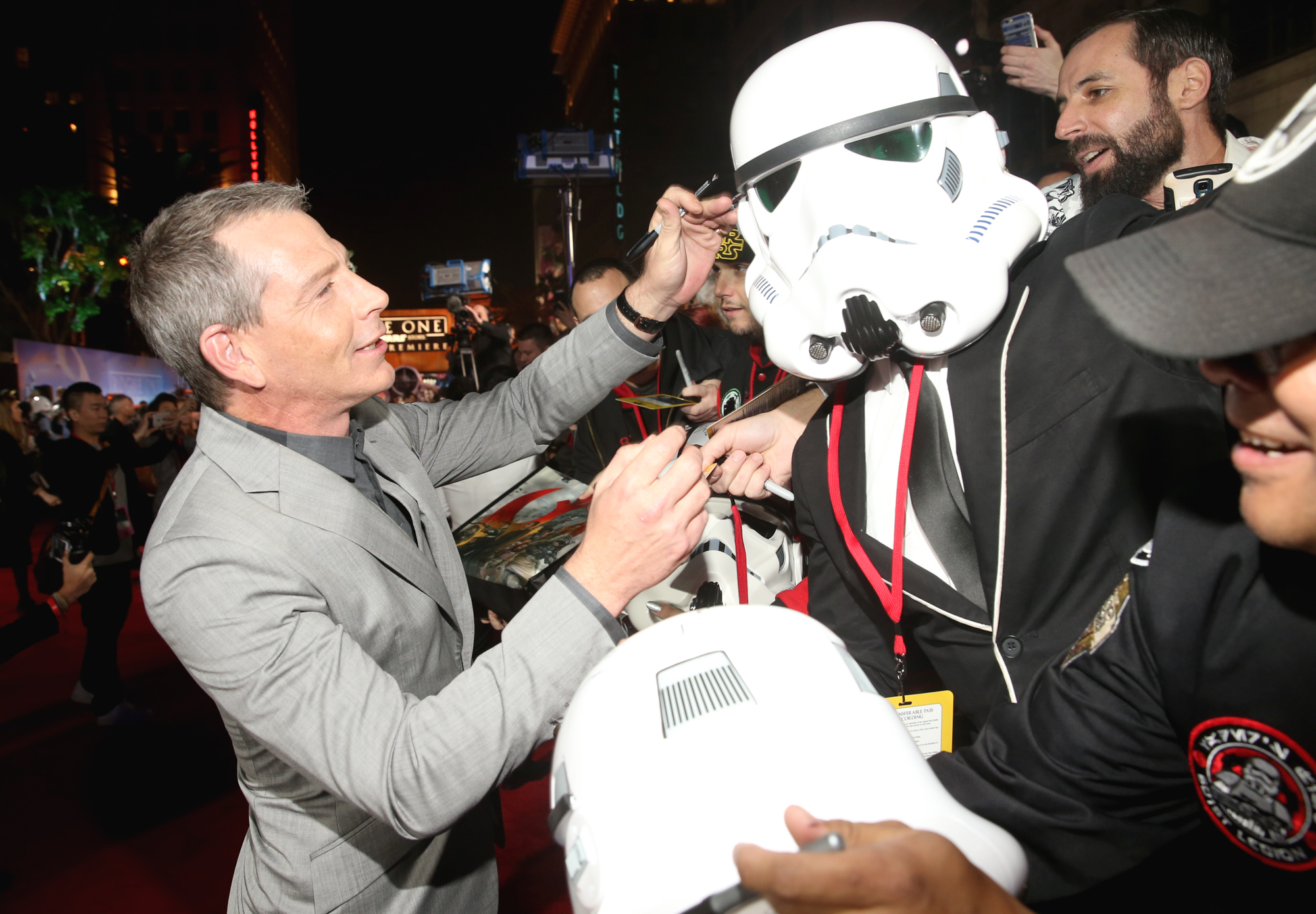 HOLLYWOOD, CA – DECEMBER 10: Actor Ben Mendelsohn signs a costumed fan’s helmet at The World Premiere of Lucasfilm’s highly anticipated, first-ever, standalone Star Wars adventure, “Rogue One: A Star Wars Story” at the Pantages Theatre on December 10, 2016 in Hollywood, California. (Photo by Jesse Grant/Getty Images for Disney) *** Local Caption *** Ben Mendelsohn