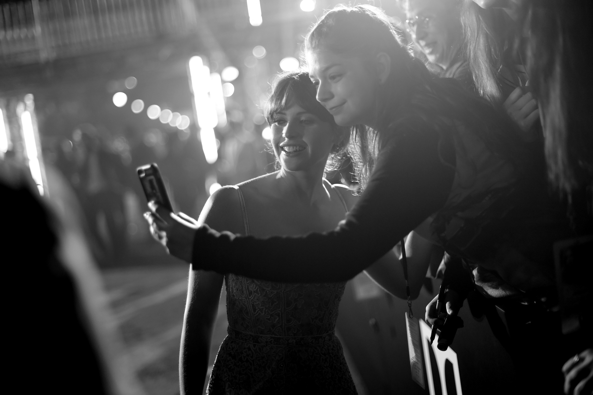 HOLLYWOOD, CA – DECEMBER 10: (EDITORS NOTE: Image has been shot in black and white. Color version not available.) Actress Felicity Jones poses with a fan at The World Premiere of Lucasfilm’s highly anticipated, first-ever, standalone Star Wars adventure, “Rogue One: A Star Wars Story” at the Pantages Theatre on December 10, 2016 in Hollywood, California. (Photo by Charley Gallay/Getty Images for Disney) *** Local Caption *** Felicity Jones