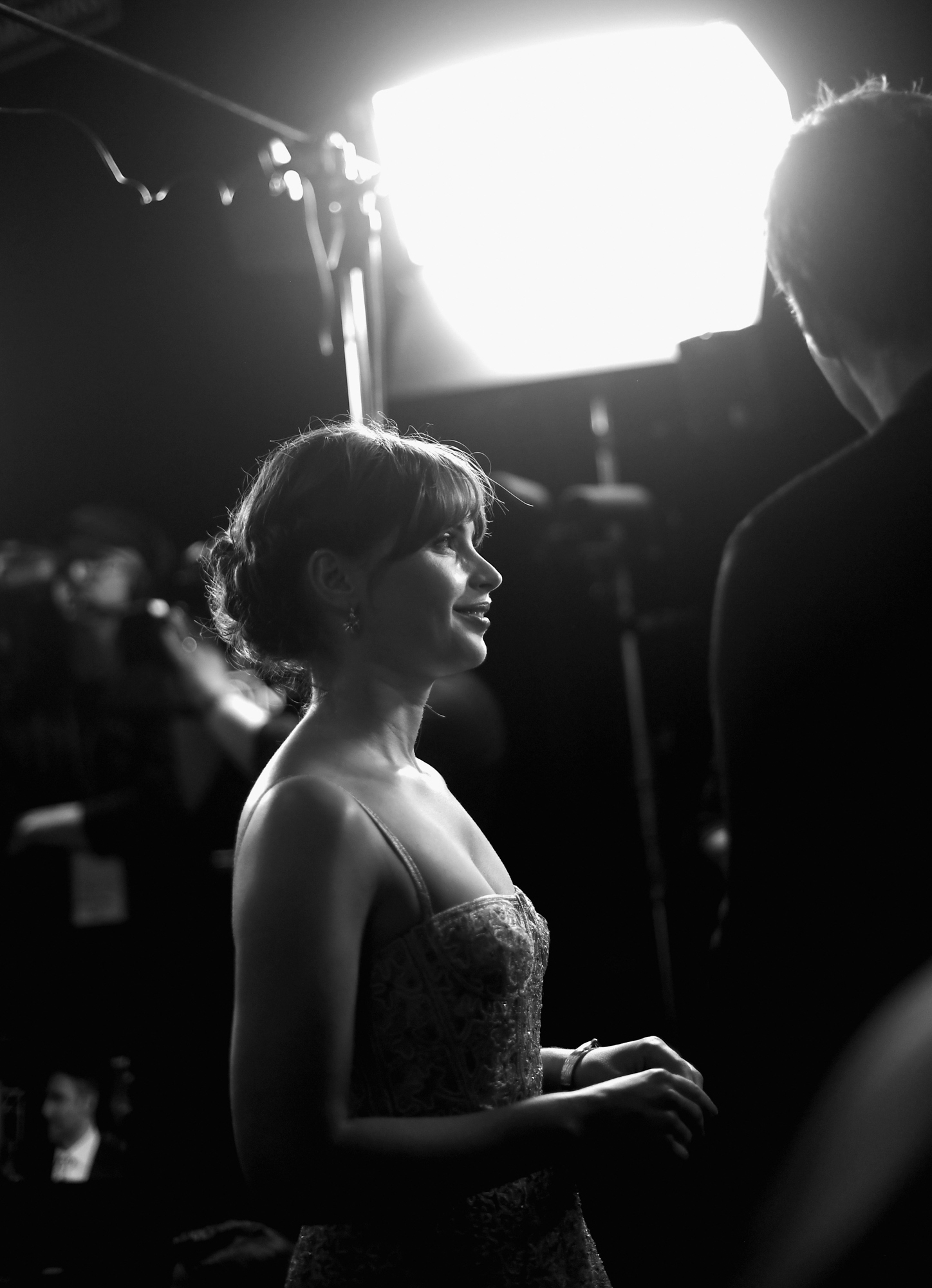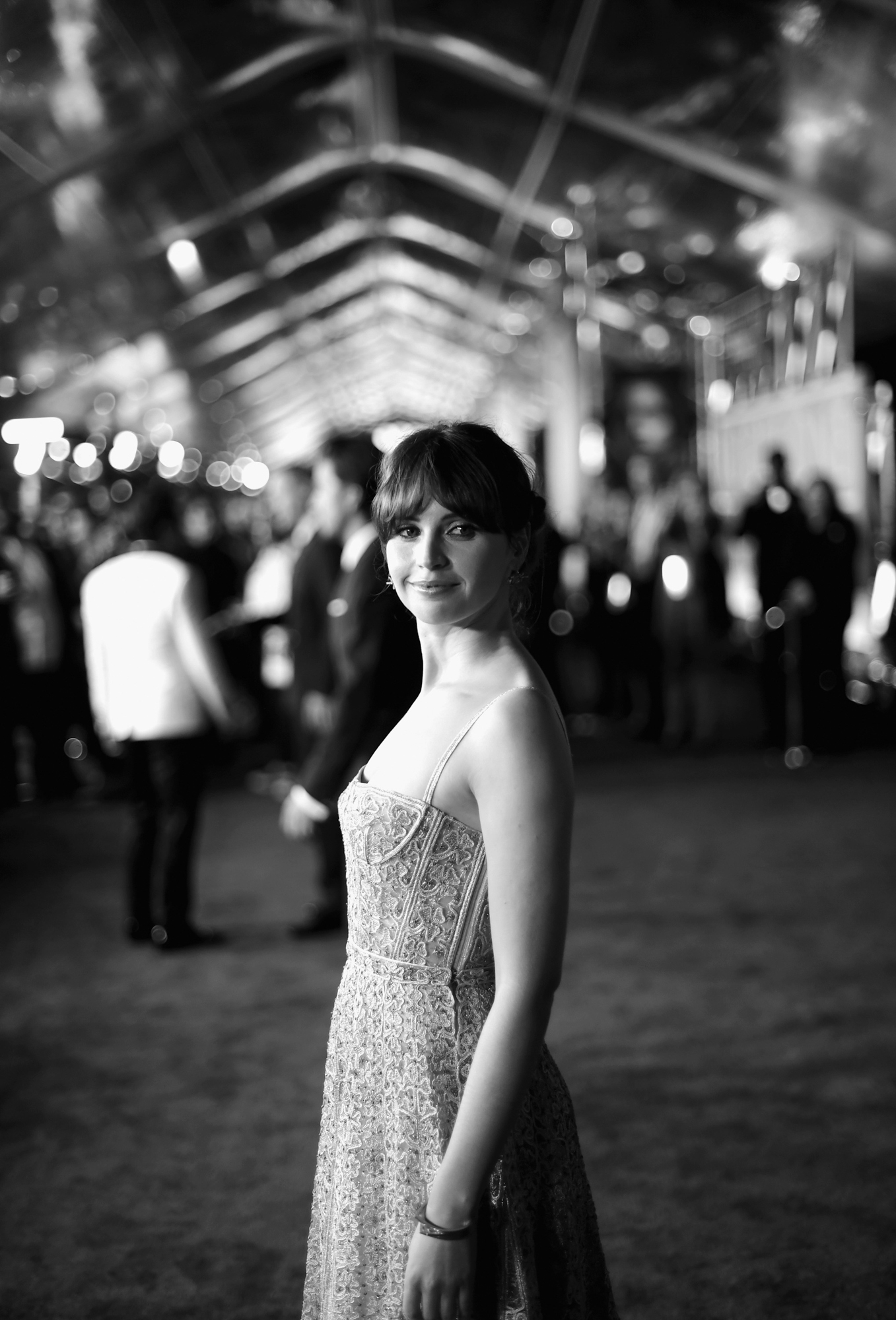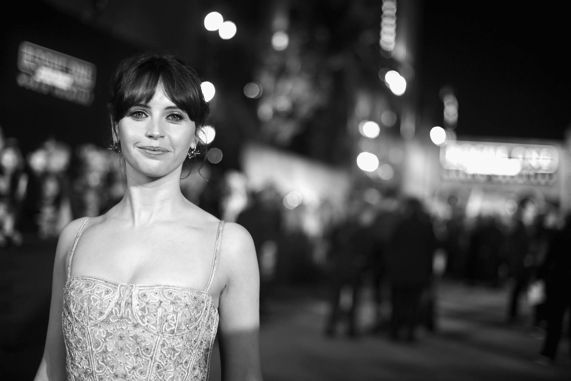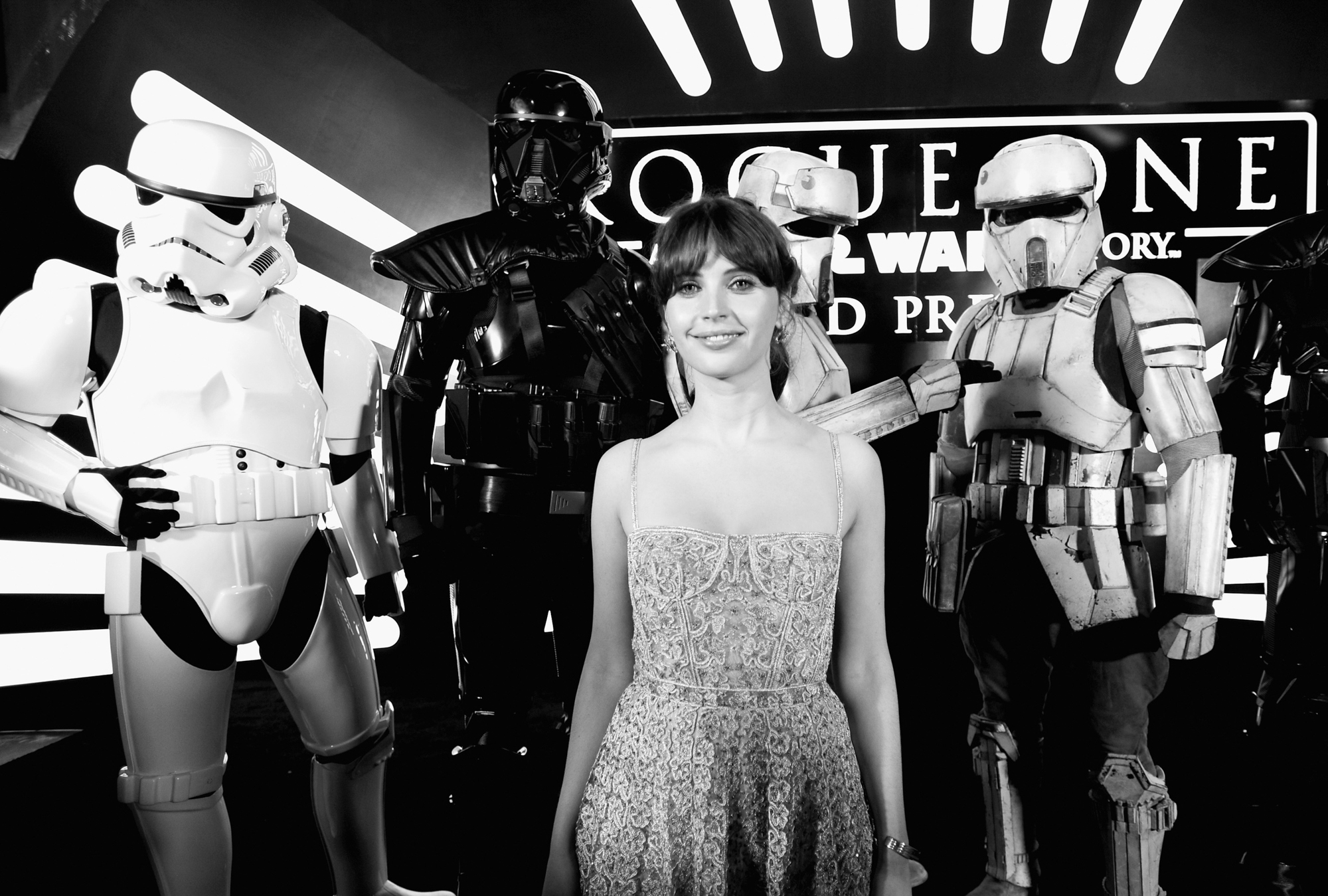 HOLLYWOOD, CA – DECEMBER 10: (EDITORS NOTE: Image has been shot in black and white. Color version not available.) Actress Felicity Jones attends The World Premiere of Lucasfilm’s highly anticipated, first-ever, standalone Star Wars adventure, “Rogue One: A Star Wars Story” at the Pantages Theatre on December 10, 2016 in Hollywood, California. (Photo by Charley Gallay/Getty Images for Disney) *** Local Caption *** Felicity Jones
