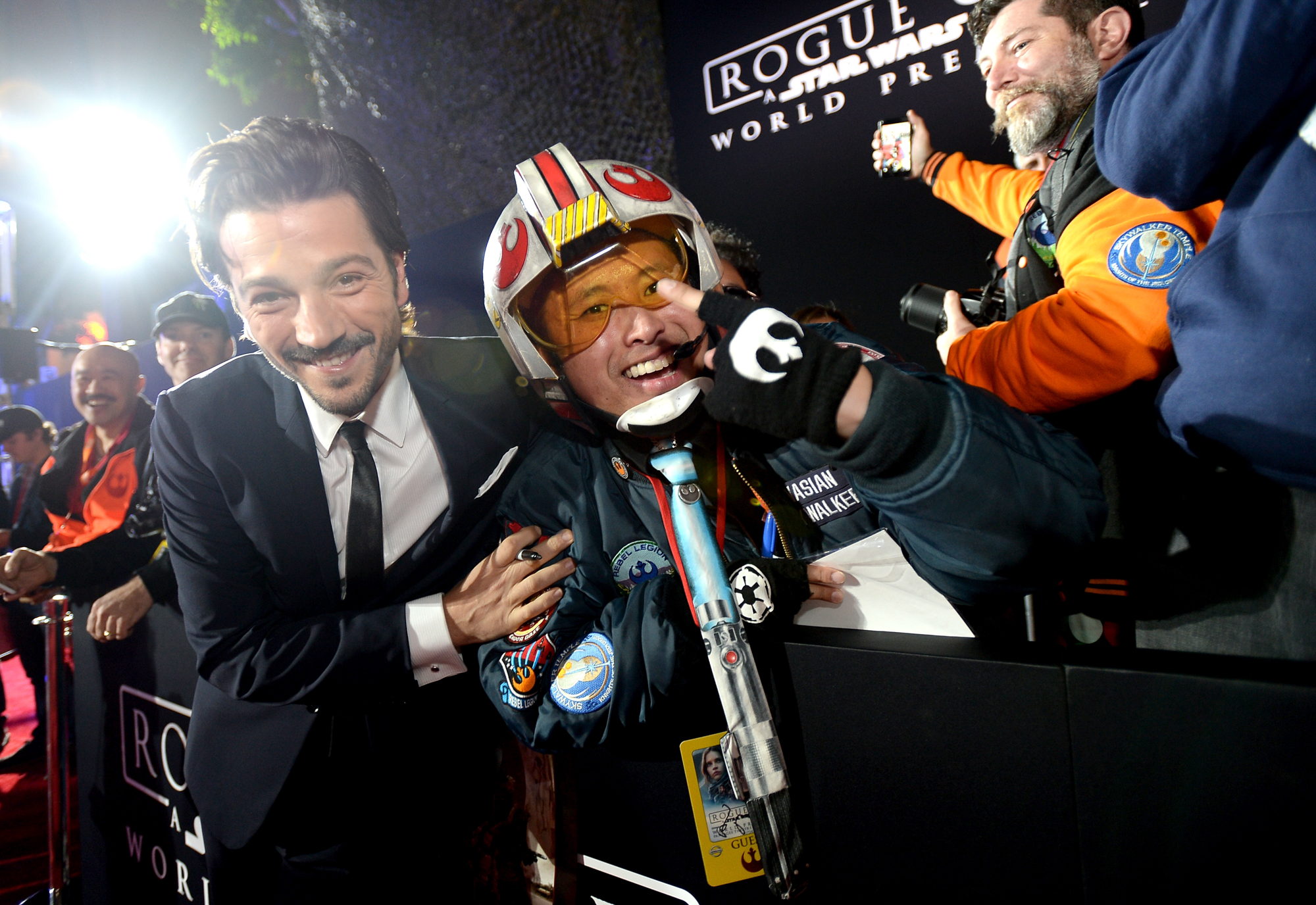 HOLLYWOOD, CA – DECEMBER 10: (EDITORS NOTE: Image has been shot in black and white. Color version not available.) Actor Diego Luna takes a selfie with costumed fans at The World Premiere of Lucasfilm’s highly anticipated, first-ever, standalone Star Wars adventure, “Rogue One: A Star Wars Story” at the Pantages Theatre on December 10, 2016 in Hollywood, California. (Photo by Charley Gallay/Getty Images for Disney) *** Local Caption *** Diego Luna