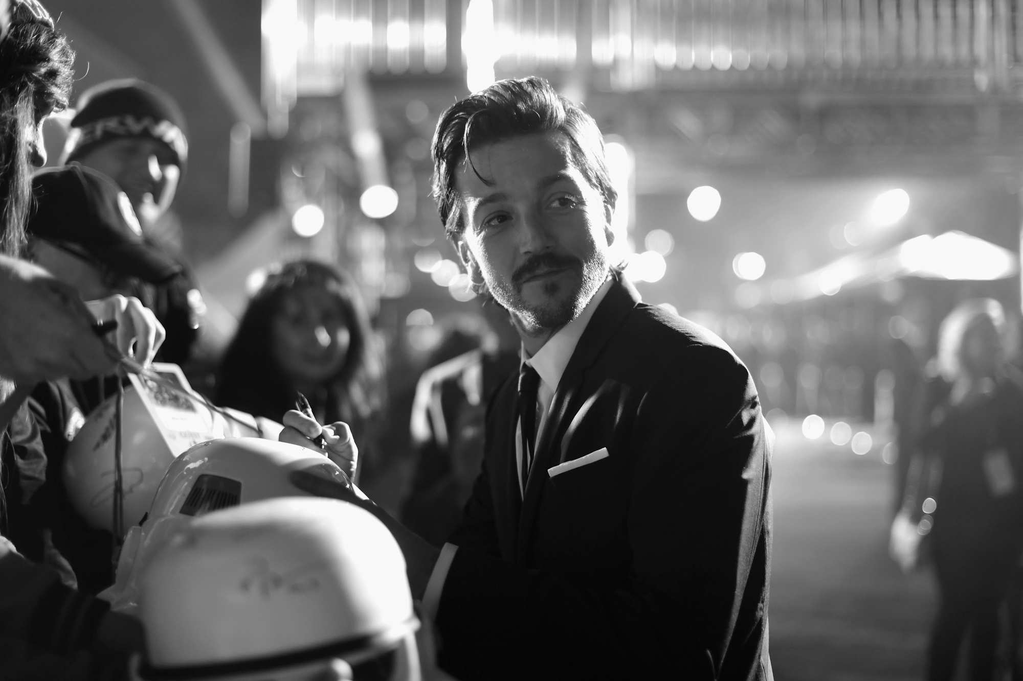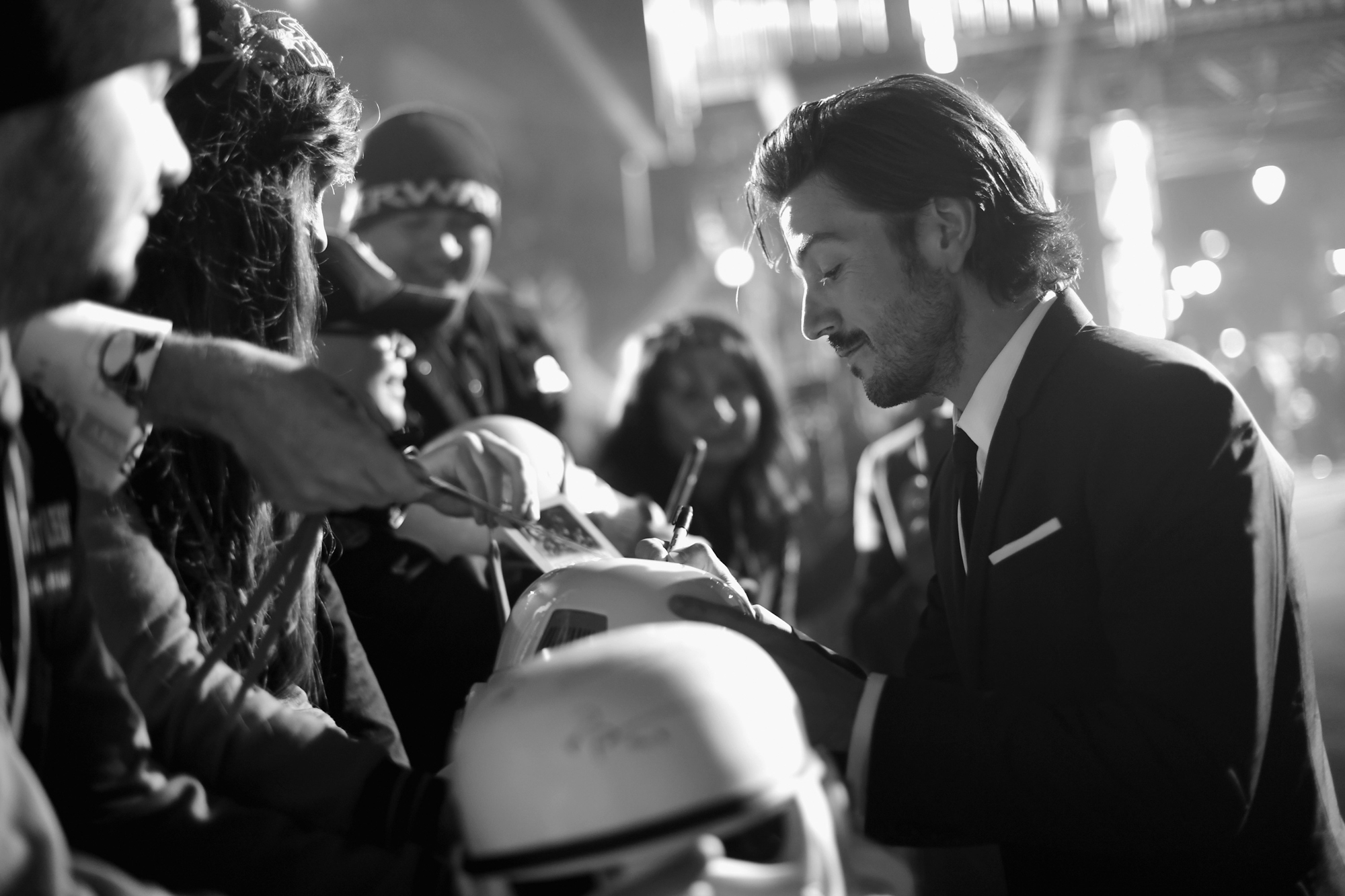 HOLLYWOOD, CA – DECEMBER 10: (EDITORS NOTE: Image has been shot in black and white. Color version not available.) Actor Diego Luna signs autographs for fans at The World Premiere of Lucasfilm’s highly anticipated, first-ever, standalone Star Wars adventure, “Rogue One: A Star Wars Story” at the Pantages Theatre on December 10, 2016 in Hollywood, California. (Photo by Charley Gallay/Getty Images for Disney) *** Local Caption *** Diego Luna