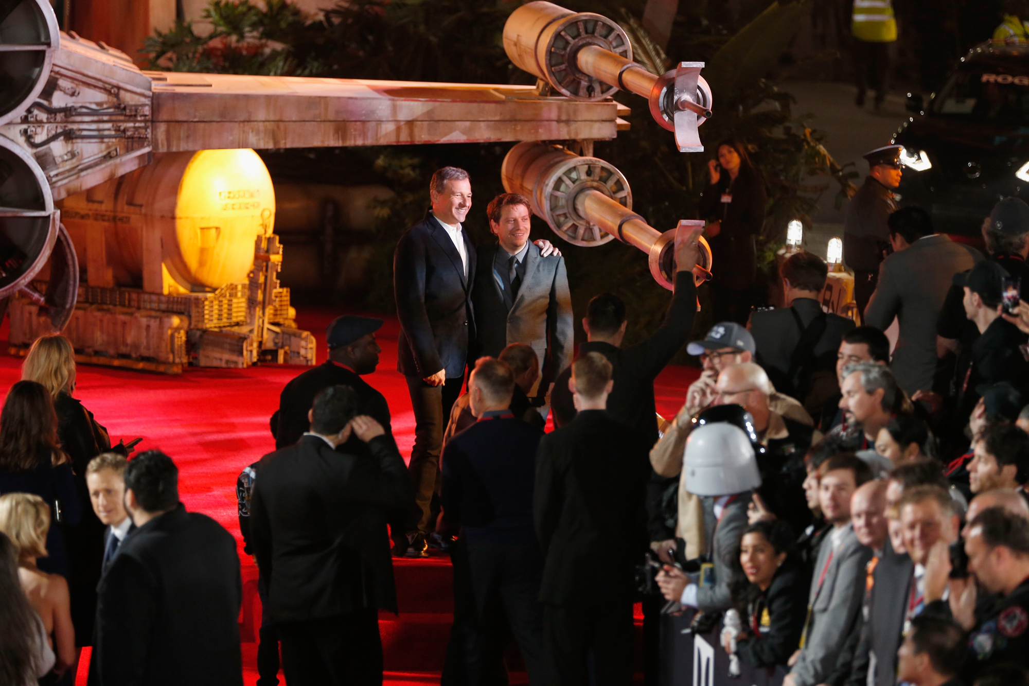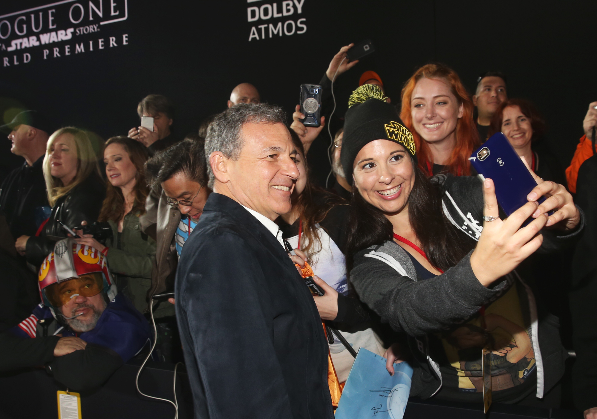 HOLLYWOOD, CA – DECEMBER 10: The Walt Disney Company Chairman/CEO Bob Iger (R) takes a selfie with Christopher ‘Dude Vader’ Canole at The World Premiere of Lucasfilm’s highly anticipated, first-ever, standalone Star Wars adventure, “Rogue One: A Star Wars Story” at the Pantages Theatre on December 10, 2016 in Hollywood, California. (Photo by Joe Scarnici/Getty Images for Disney) *** Local Caption *** Bob Iger; Christopher Canole