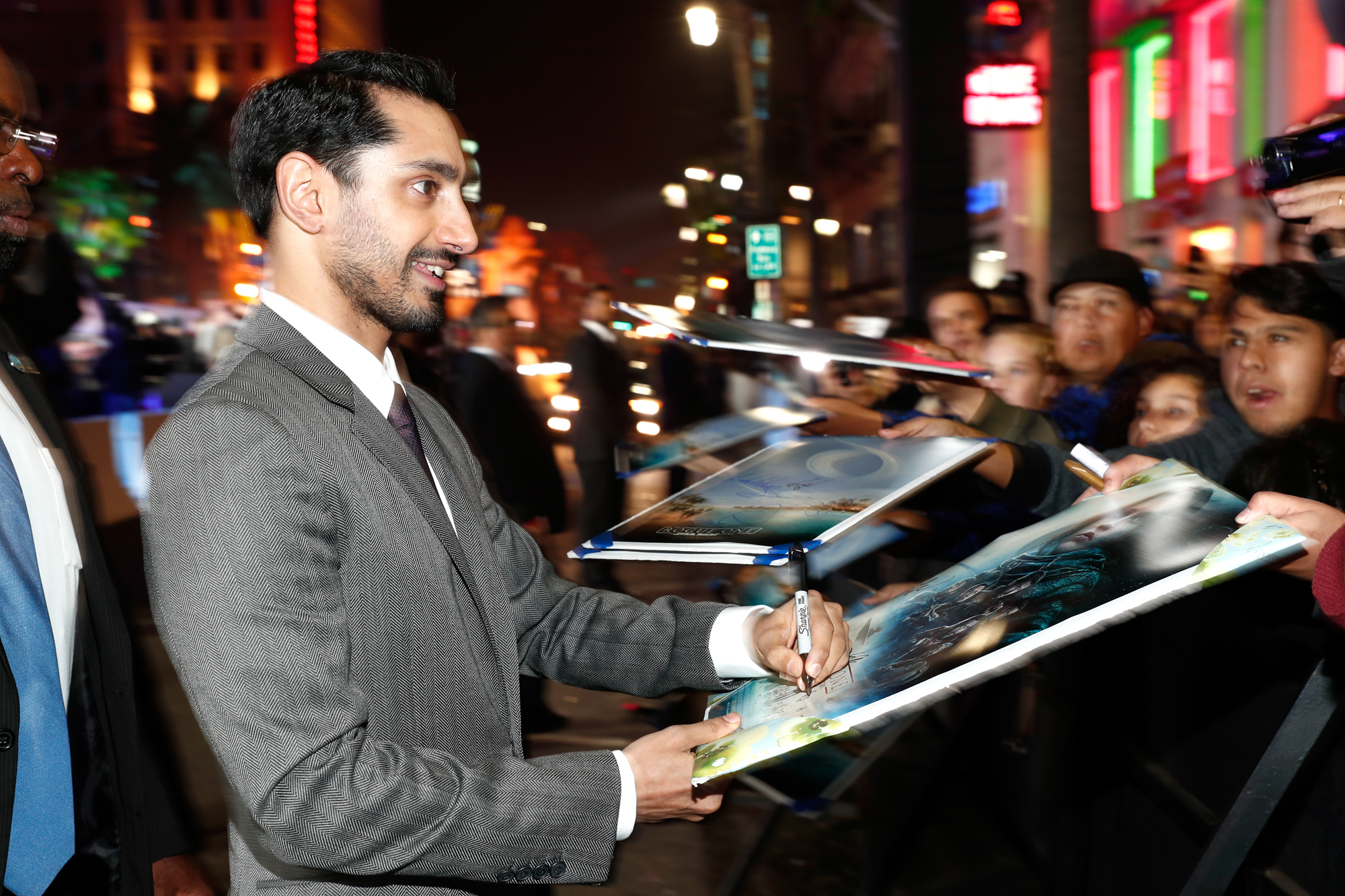 HOLLYWOOD, CA – DECEMBER 10: Actor Riz Ahmed (R) signs autographs for fans at The World Premiere of Lucasfilm’s highly anticipated, first-ever, standalone Star Wars adventure, “Rogue One: A Star Wars Story” at the Pantages Theatre on December 10, 2016 in Hollywood, California. (Photo by Charley Gallay/Getty Images for Disney) *** Local Caption *** Riz Ahmed