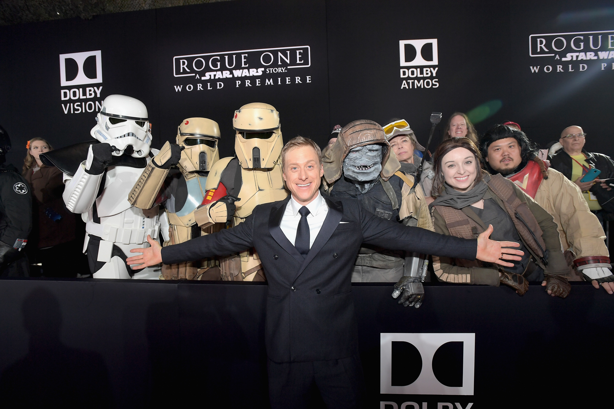HOLLYWOOD, CA – DECEMBER 10: Actor Alan Tudyk poses with costumed fans at The World Premiere of Lucasfilm’s highly anticipated, first-ever, standalone Star Wars adventure, “Rogue One: A Star Wars Story” at the Pantages Theatre on December 10, 2016 in Hollywood, California. (Photo by Charley Gallay/Getty Images for Disney) *** Local Caption *** Alan Tudyk