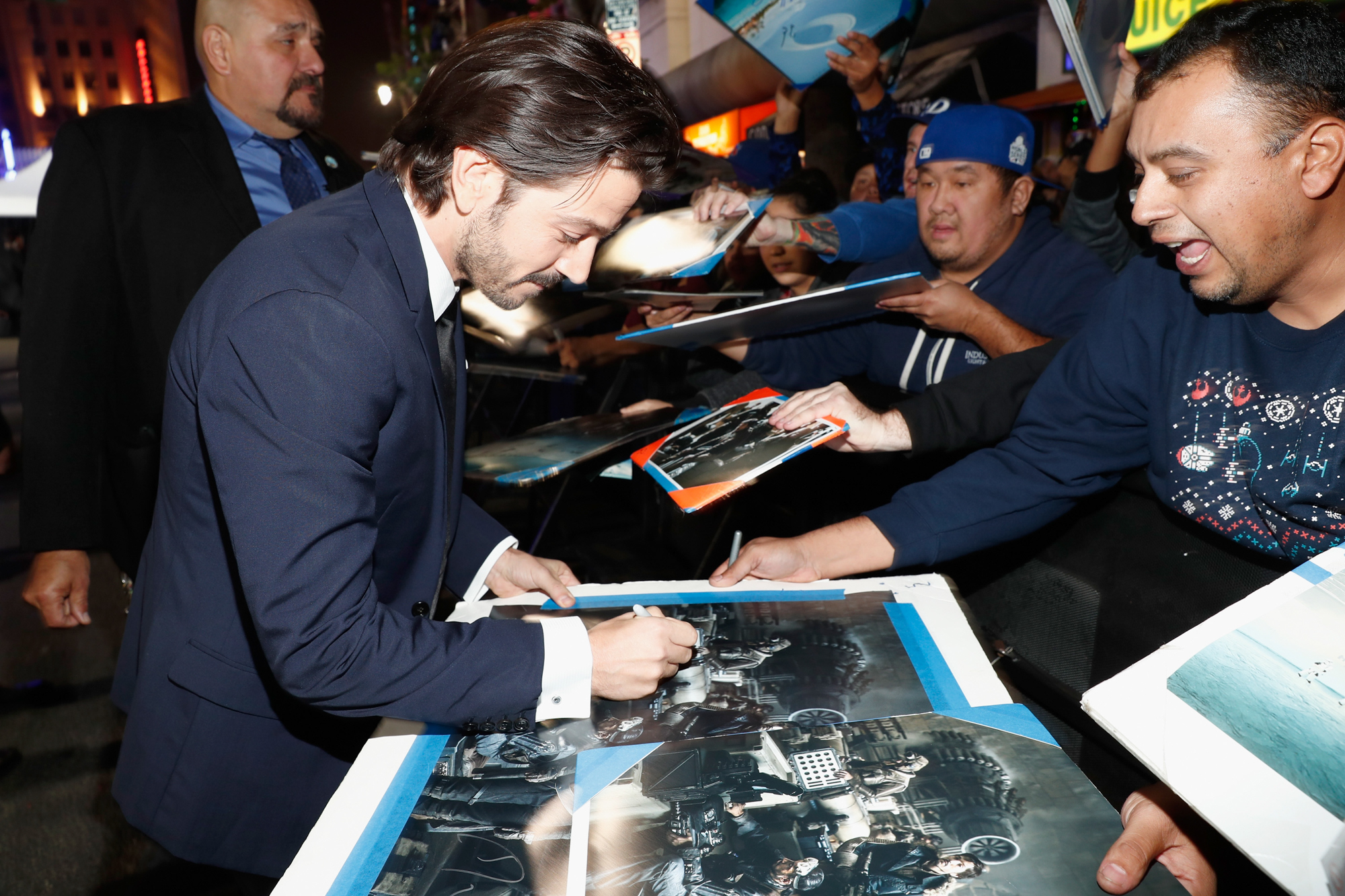 HOLLYWOOD, CA – DECEMBER 10: Actor Diego Luna (L) signs autographs for fans at The World Premiere of Lucasfilm’s highly anticipated, first-ever, standalone Star Wars adventure, “Rogue One: A Star Wars Story” at the Pantages Theatre on December 10, 2016 in Hollywood, California. (Photo by Charley Gallay/Getty Images for Disney) *** Local Caption *** Diego Luna