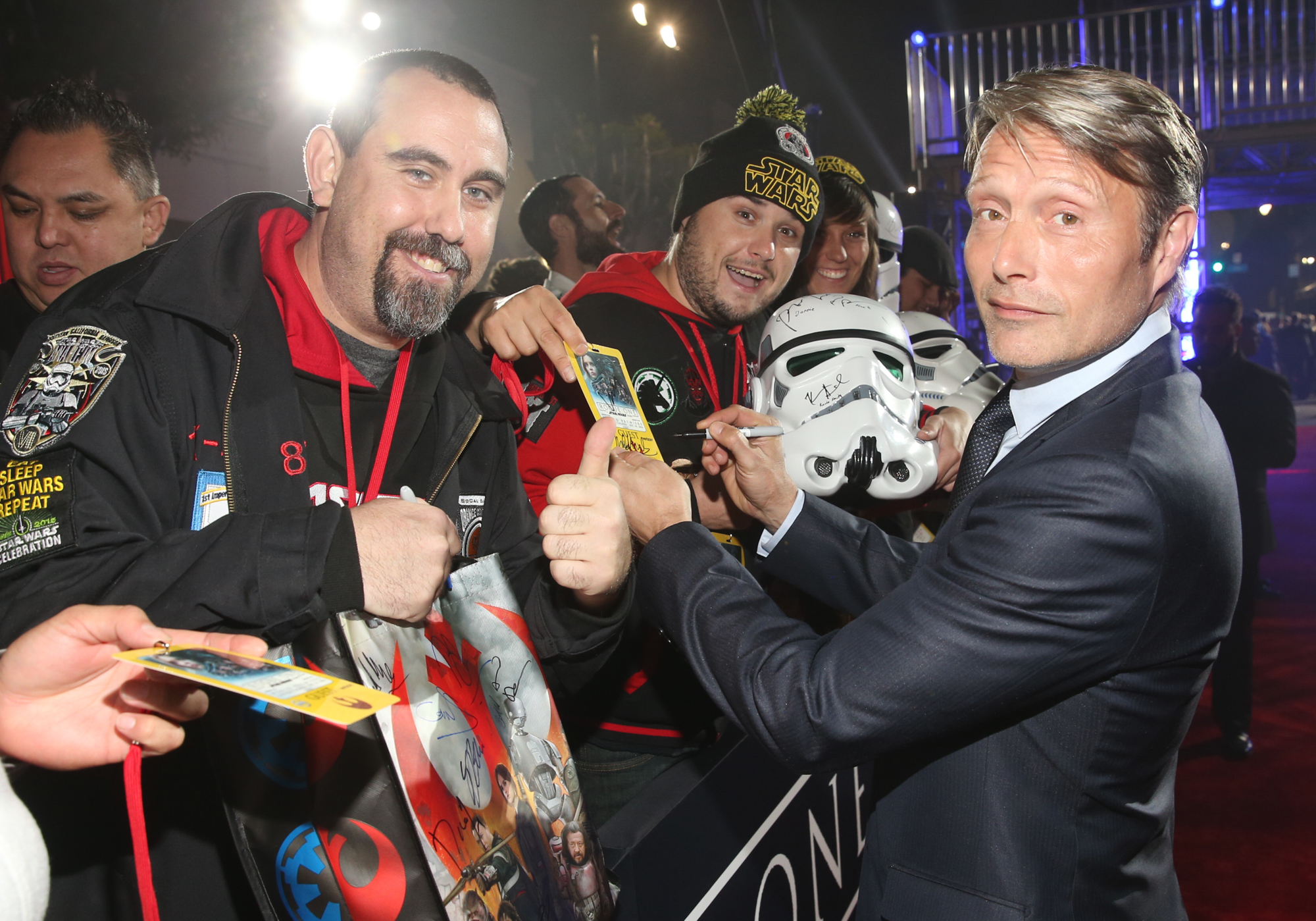 HOLLYWOOD, CA – DECEMBER 10: Actor Mads Mikkelsen (R) signs autographs for fans at The World Premiere of Lucasfilm’s highly anticipated, first-ever, standalone Star Wars adventure, “Rogue One: A Star Wars Story” at the Pantages Theatre on December 10, 2016 in Hollywood, California. (Photo by Jesse Grant/Getty Images for Disney) *** Local Caption *** Mads Mikkelsen