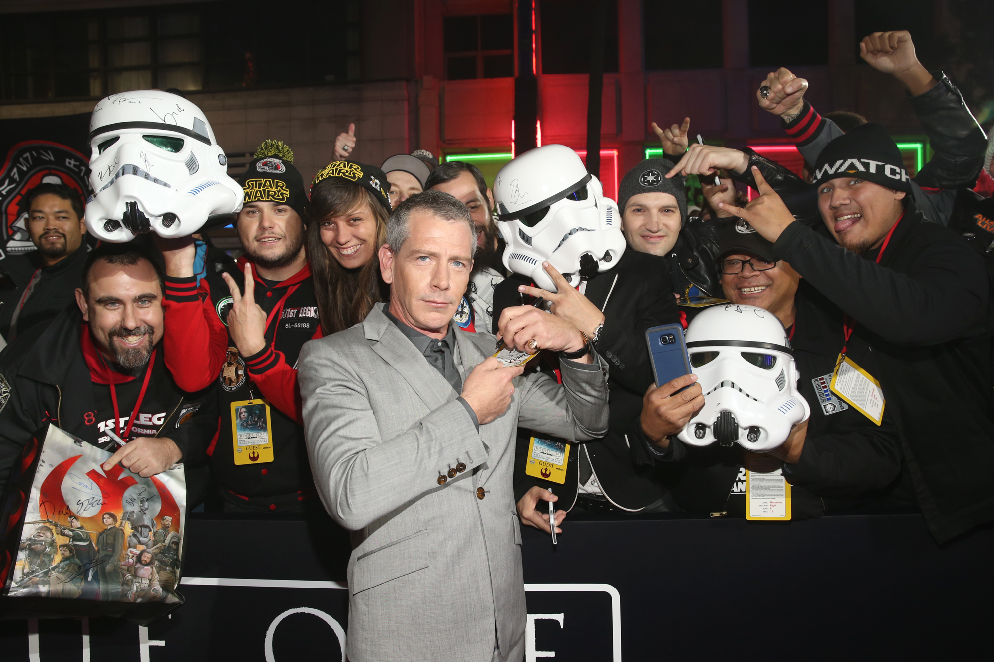 HOLLYWOOD, CA – DECEMBER 10: Actor Ben Mendelsohn takes a selfie with fans at The World Premiere of Lucasfilm’s highly anticipated, first-ever, standalone Star Wars adventure, “Rogue One: A Star Wars Story” at the Pantages Theatre on December 10, 2016 in Hollywood, California. (Photo by Jesse Grant/Getty Images for Disney) *** Local Caption *** Ben Mendelsohn