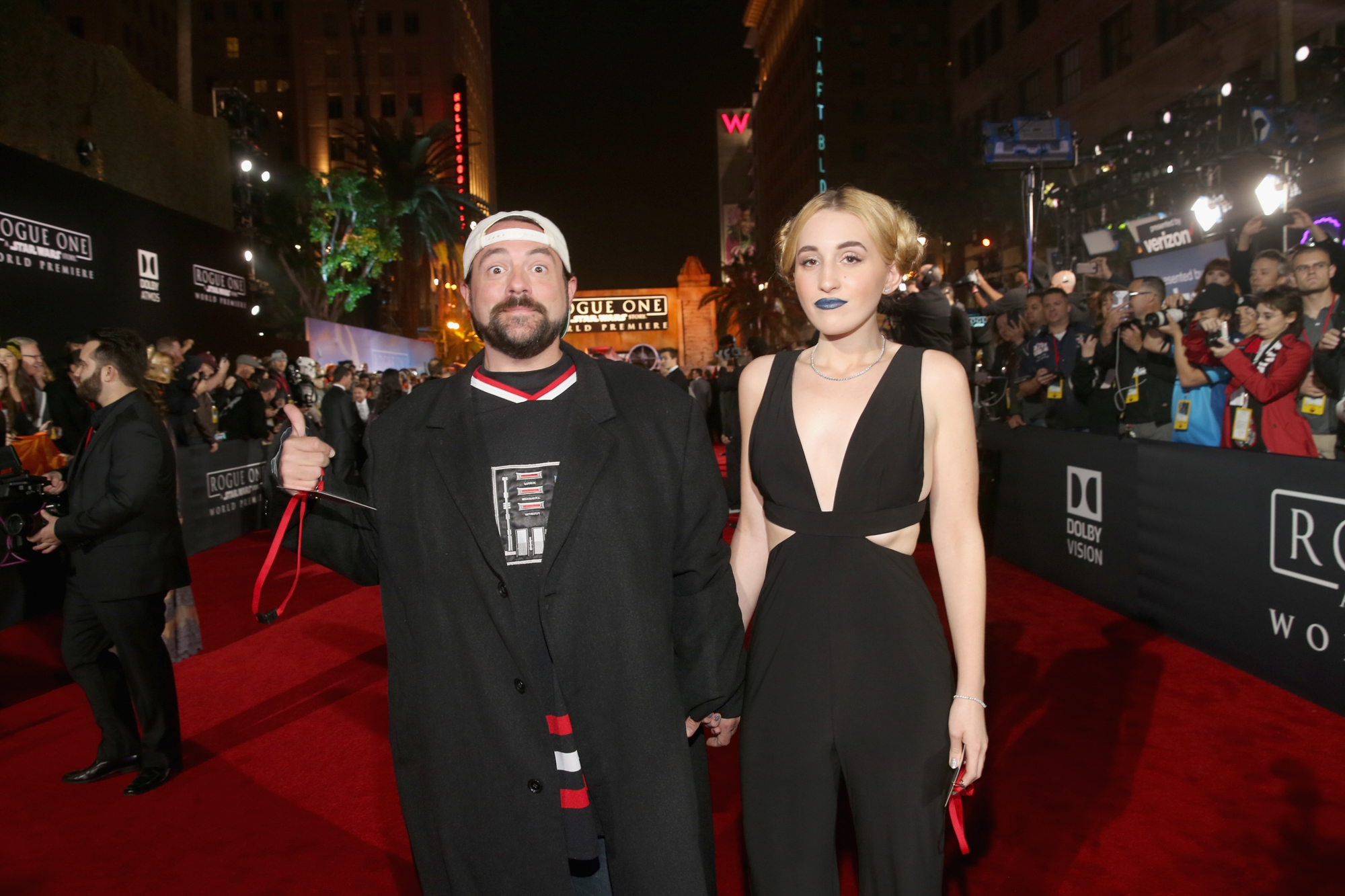 HOLLYWOOD, CA – DECEMBER 10: Filmmaker Kevin Smith (L) and Harley Quinn Smith attend The World Premiere of Lucasfilm’s highly anticipated, first-ever, standalone Star Wars adventure, “Rogue One: A Star Wars Story” at the Pantages Theatre on December 10, 2016 in Hollywood, California. (Photo by Jesse Grant/Getty Images for Disney) *** Local Caption *** Kevin Smith; Harley Quinn Smith
