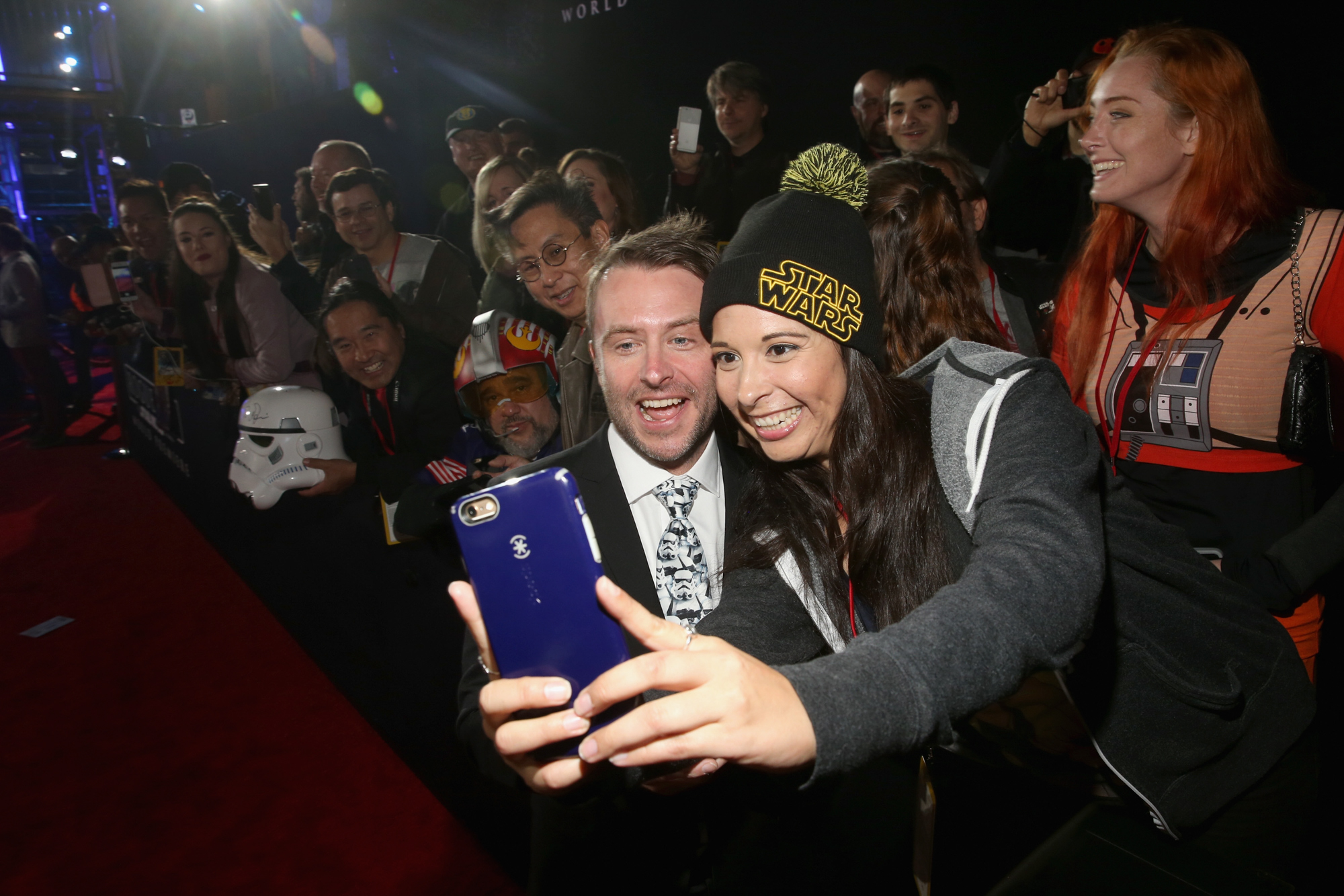 HOLLYWOOD, CA – DECEMBER 10: Director Gareth Edwards (R) poses for a selfie with fans at The World Premiere of Lucasfilm’s highly anticipated, first-ever, standalone Star Wars adventure, “Rogue One: A Star Wars Story” at the Pantages Theatre on December 10, 2016 in Hollywood, California. (Photo by Rich Polk/Getty Images for Disney) *** Local Caption *** Gareth Edwards