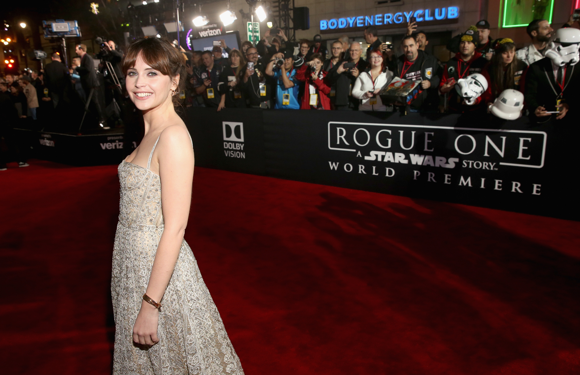 HOLLYWOOD, CA – DECEMBER 10: Actress Felicity Jones attends The World Premiere of Lucasfilm’s highly anticipated, first-ever, standalone Star Wars adventure, “Rogue One: A Star Wars Story” at the Pantages Theatre on December 10, 2016 in Hollywood, California. (Photo by Rich Polk/Getty Images for Disney) *** Local Caption *** Felicity Jones