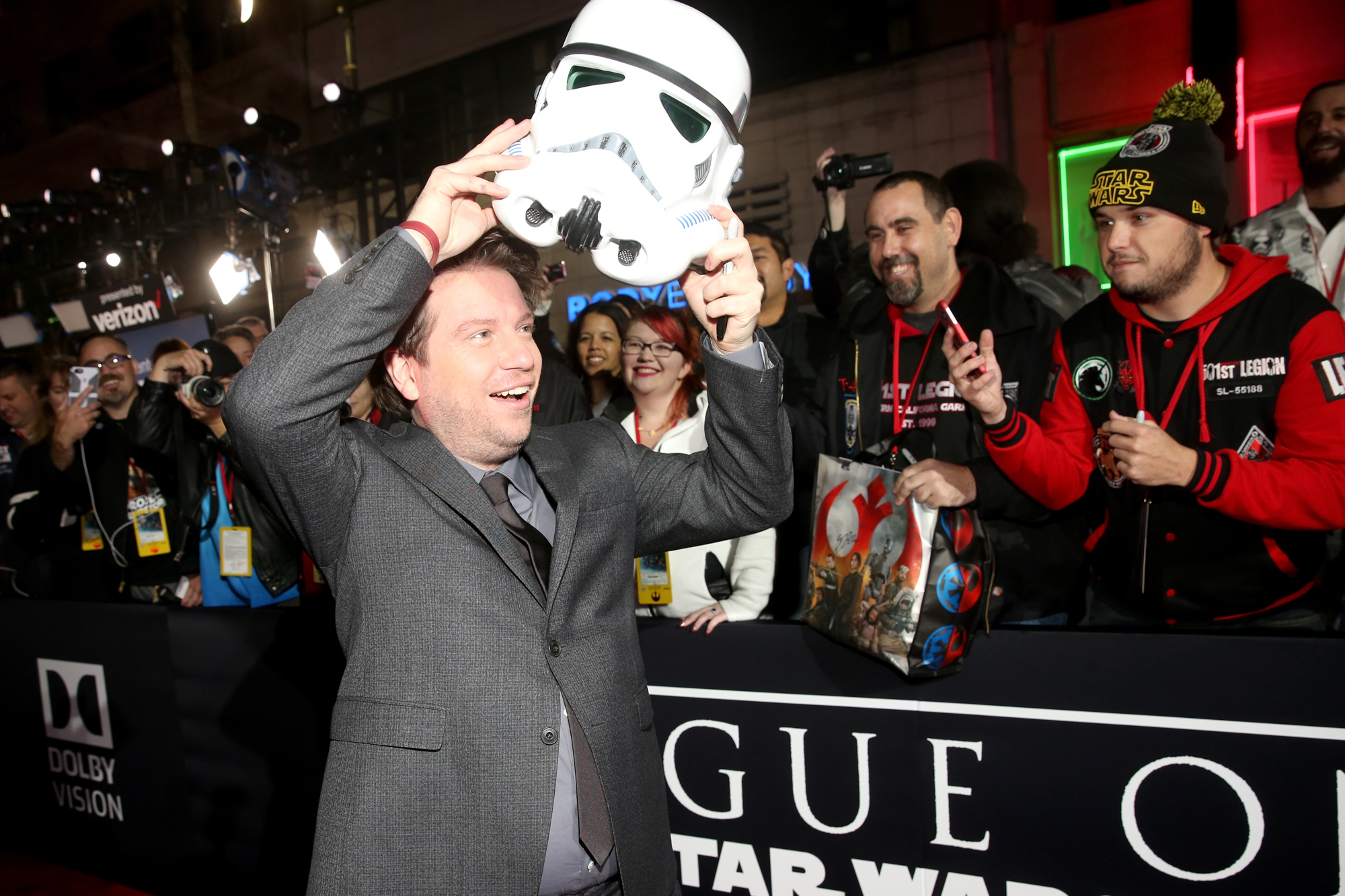 HOLLYWOOD, CA – DECEMBER 10: Director Gareth Edwards puts on a fan’s Stormtrooper helmet at The World Premiere of Lucasfilm’s highly anticipated, first-ever, standalone Star Wars adventure, “Rogue One: A Star Wars Story” at the Pantages Theatre on December 10, 2016 in Hollywood, California. (Photo by Jesse Grant/Getty Images for Disney) *** Local Caption *** Gareth Edwards