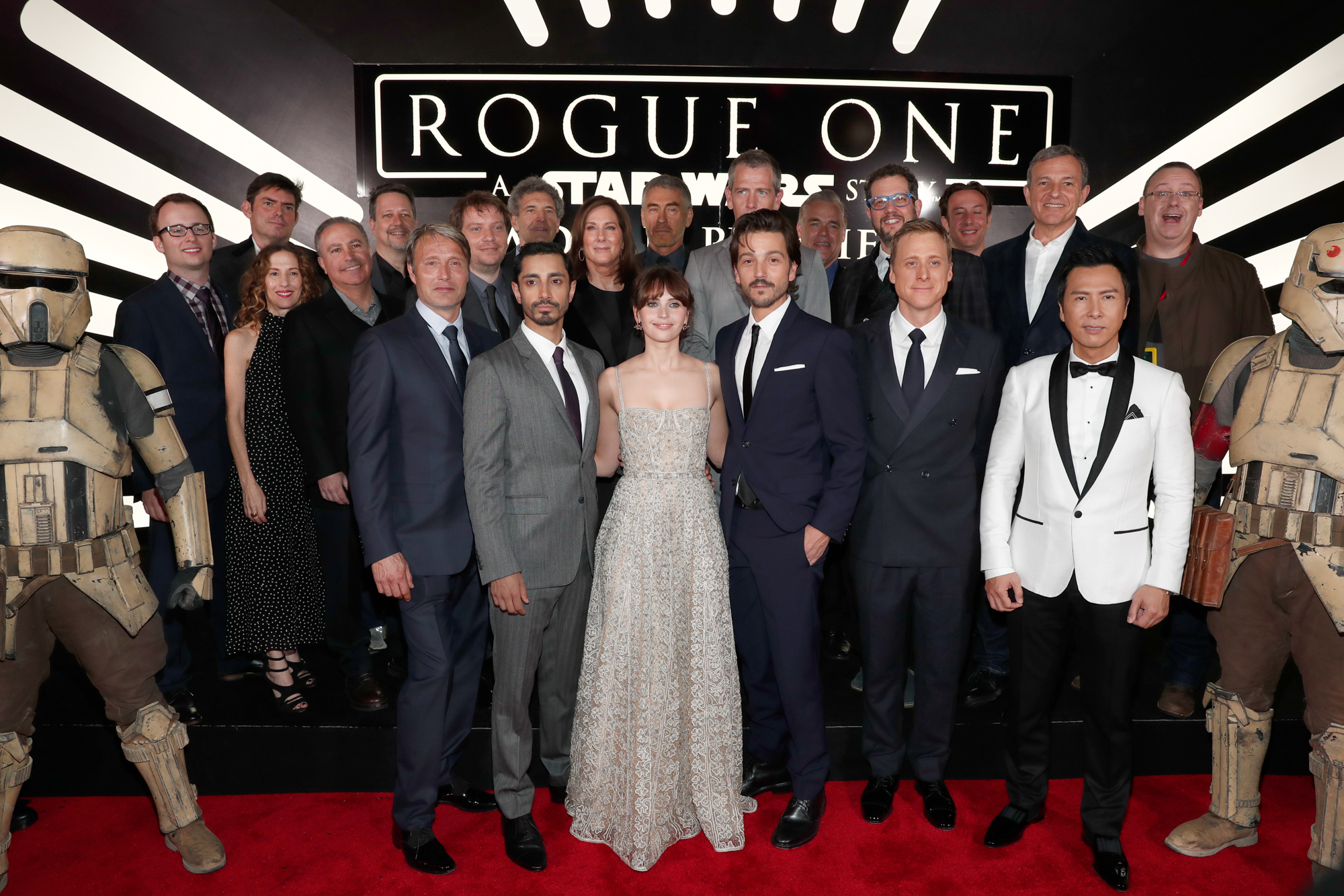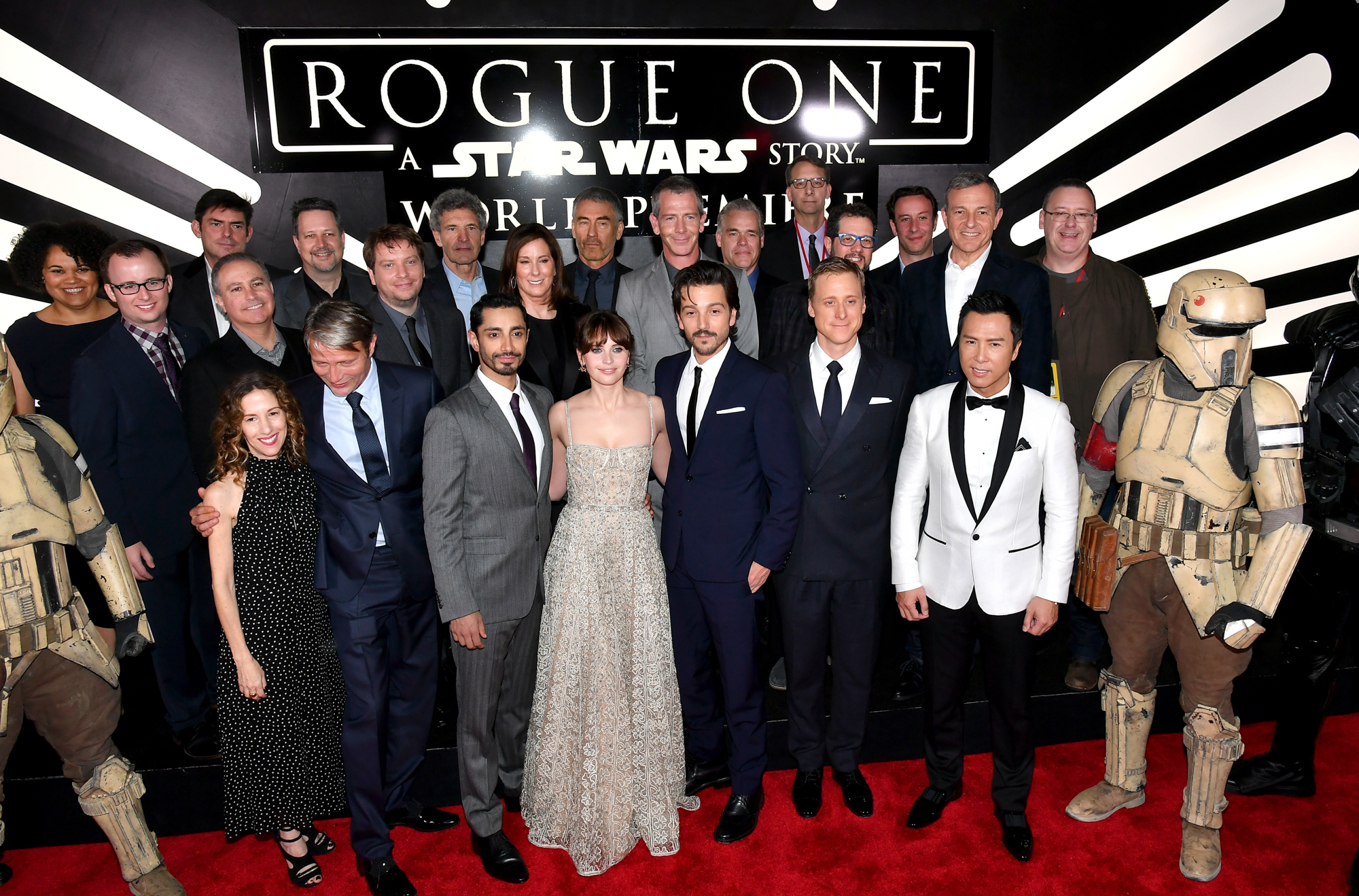 HOLLYWOOD, CA – DECEMBER 10: (L-R front row) Actors Mads Mikkelsen, Riz Ahmed, Felicity Jones, Diego Luna, Alan Tudyk and Donnie Yen (back row) Producer Allison Shearmur, Screenwriter Chris Weitz, Walt Disney Studios President Alan Bergman, Executive producer John Knoll, Director Gareth Edwards, Chairman, The Walt Disney Studios, Alan Horn, Producer Kathleen Kennedy, actor Ben Mendelsohn, Composer Michael Giacchino, Producer Simon Emanuel and The Walt Disney Company Chairman and CEO Bob Iger attend The World Premiere of Lucasfilm’s highly anticipated, first-ever, standalone Star Wars adventure, “Rogue One: A Star Wars Story” at the Pantages Theatre on December 10, 2016 in Hollywood, California. (Photo by Rich Polk/Getty Images for Disney) *** Local Caption *** Mads Mikkelsen; Riz Ahmed; Felicity Jones; Diego Luna; Donnie Yen; Allison Shearmur; Chris Weitz; Alan Bergman; John Knoll; Gareth Edwards; Alan Horn; Kathleen Kennedy; Ben Mendelsohn; Michael Giacchino; Simon Emanuel; Bob Iger