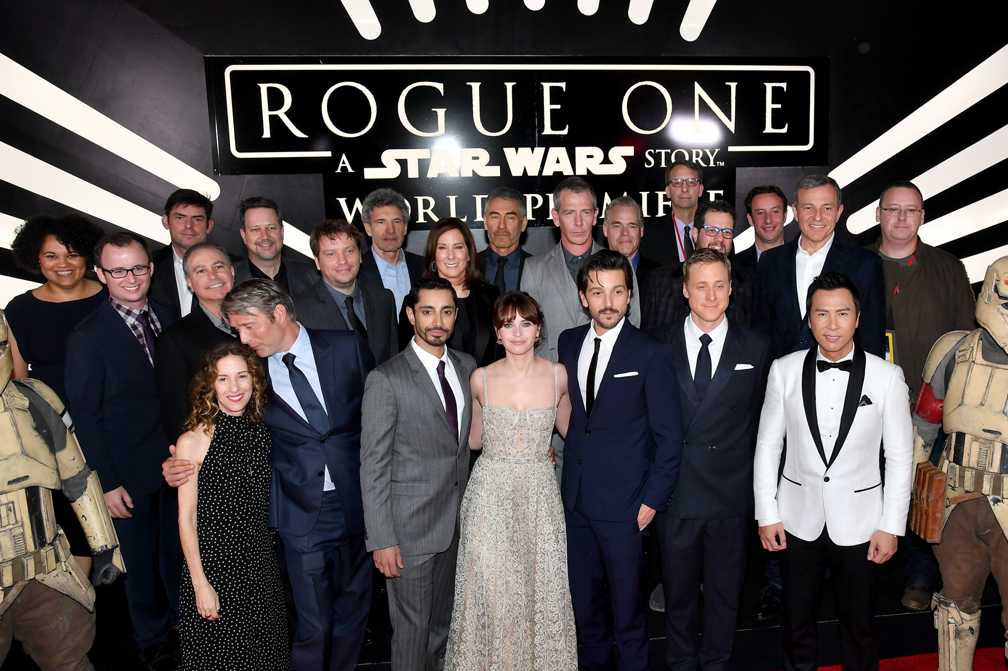 HOLLYWOOD, CA – DECEMBER 10: (L-R front row) Actors Mads Mikkelsen, Riz Ahmed, Felicity Jones, Diego Luna, Alan Tudyk and Donnie Yen (back row) Screenwriter Chris Weitz, director Gareth Edwards, Executive producer John Knoll, Producer Allison Shearmurs, Kathleen Kennedy, Chairman, The Walt Disney Studios, Alan Horn, actor Ben Mendelsohn, composer Michael Giacchino, producer Simon Emanuel and The Walt Disney Company Chairman and CEO Bob Iger attend The World Premiere of Lucasfilm’s highly anticipated, first-ever, standalone Star Wars adventure, “Rogue One: A Star Wars Story” at the Pantages Theatre on December 10, 2016 in Hollywood, California. (Photo by Jesse Grant/Getty Images for Disney) *** Local Caption *** Michael Giacchino; Gareth Edwards; Mads Mikkelsen; Riz Ahmed; Felicity Jones; Diego Luna; Alan Tudyk; Donnie Yen; John Knoll; Allison Shearmur; Kathleen Kennedy; Ben Mendelsohn; Bob Iger; Chris Weitz