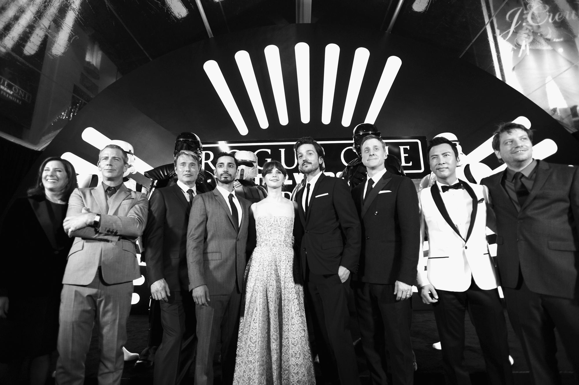 HOLLYWOOD, CA – DECEMBER 10: (EDITORS NOTE: Image has been shot in black and white. Color version not available.) (L-R) Producer Kathleen Kennedy, actors Ben Mendelsohn, Mads Mikkelsen, Riz Ahmed, Felicity Jones, Diego Luna, Alan Tudyk, and Donnie Yen, and director Gareth Edwards attend The World Premiere of Lucasfilm’s highly anticipated, first-ever, standalone Star Wars adventure, “Rogue One: A Star Wars Story” at the Pantages Theatre on December 10, 2016 in Hollywood, California. (Photo by Jesse Grant/Getty Images for Disney) *** Local Caption *** Ben Mendelsohn; Riz Ahmed; Felicity Jones; Diego Luna; Donnie Yen; Mads Mikkelsen; Alan Tudyk; Gareth Edwards; Kathleen Kennedy