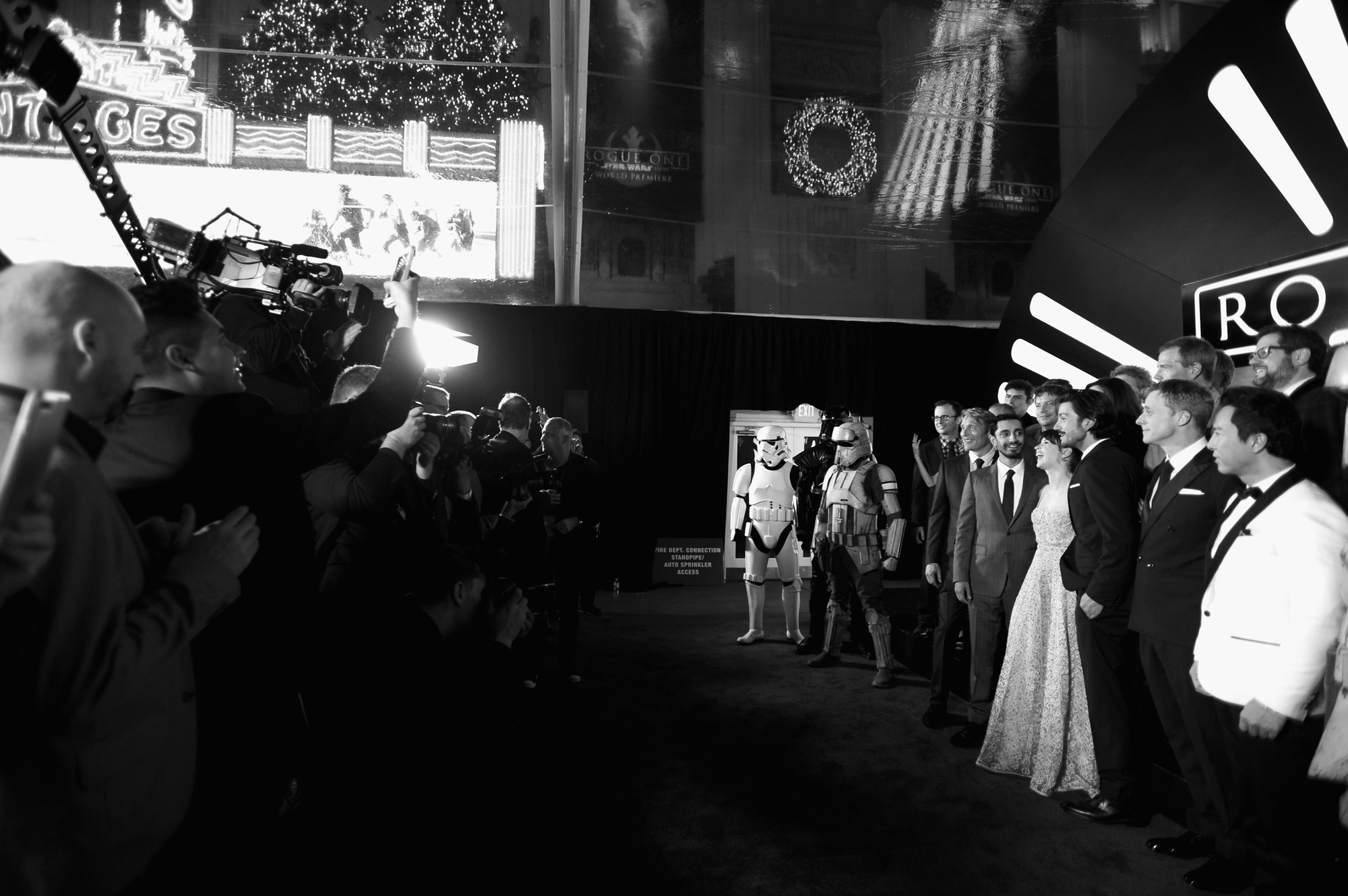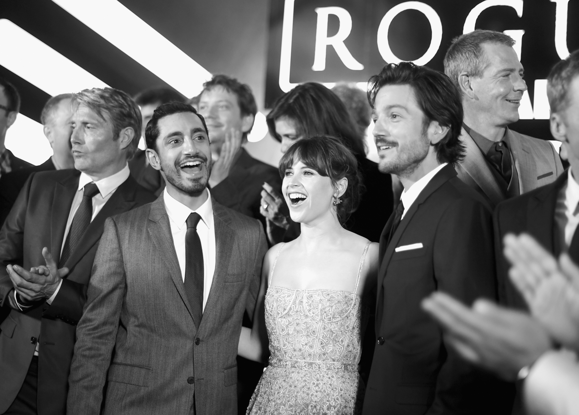 HOLLYWOOD, CA – DECEMBER 10: (EDITORS NOTE: Image has been shot in black and white. Color version not available.) (L-R) Actors Ben Mendelsohn, Riz Ahmed, Mads Mikkelsen, Felicity Jones, Diego Luna, and Donnie Yen attend The World Premiere of Lucasfilm’s highly anticipated, first-ever, standalone Star Wars adventure, “Rogue One: A Star Wars Story” at the Pantages Theatre on December 10, 2016 in Hollywood, California. (Photo by Charley Gallay/Getty Images for Disney) *** Local Caption *** Ben Mendelsohn; Riz Ahmed; Felicity Jones; Diego Luna; Donnie Yen; Mads Mikkelsen