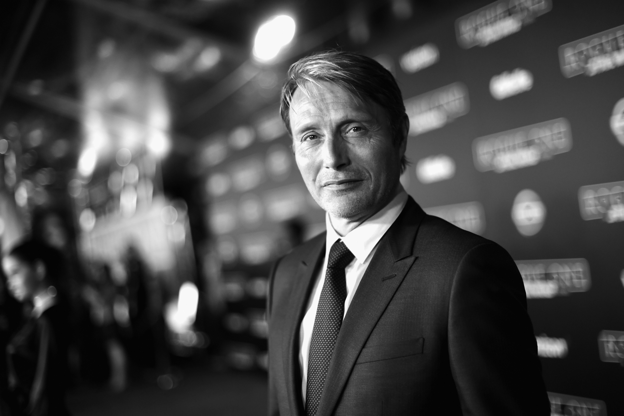 HOLLYWOOD, CA – DECEMBER 10: (EDITORS NOTE: Image has been shot in black and white. Color version not available.) Actor Mads Mikkelsen attends The World Premiere of Lucasfilm’s highly anticipated, first-ever, standalone Star Wars adventure, “Rogue One: A Star Wars Story” at the Pantages Theatre on December 10, 2016 in Hollywood, California. (Photo by Charley Gallay/Getty Images for Disney) *** Local Caption *** Mads Mikkelsen