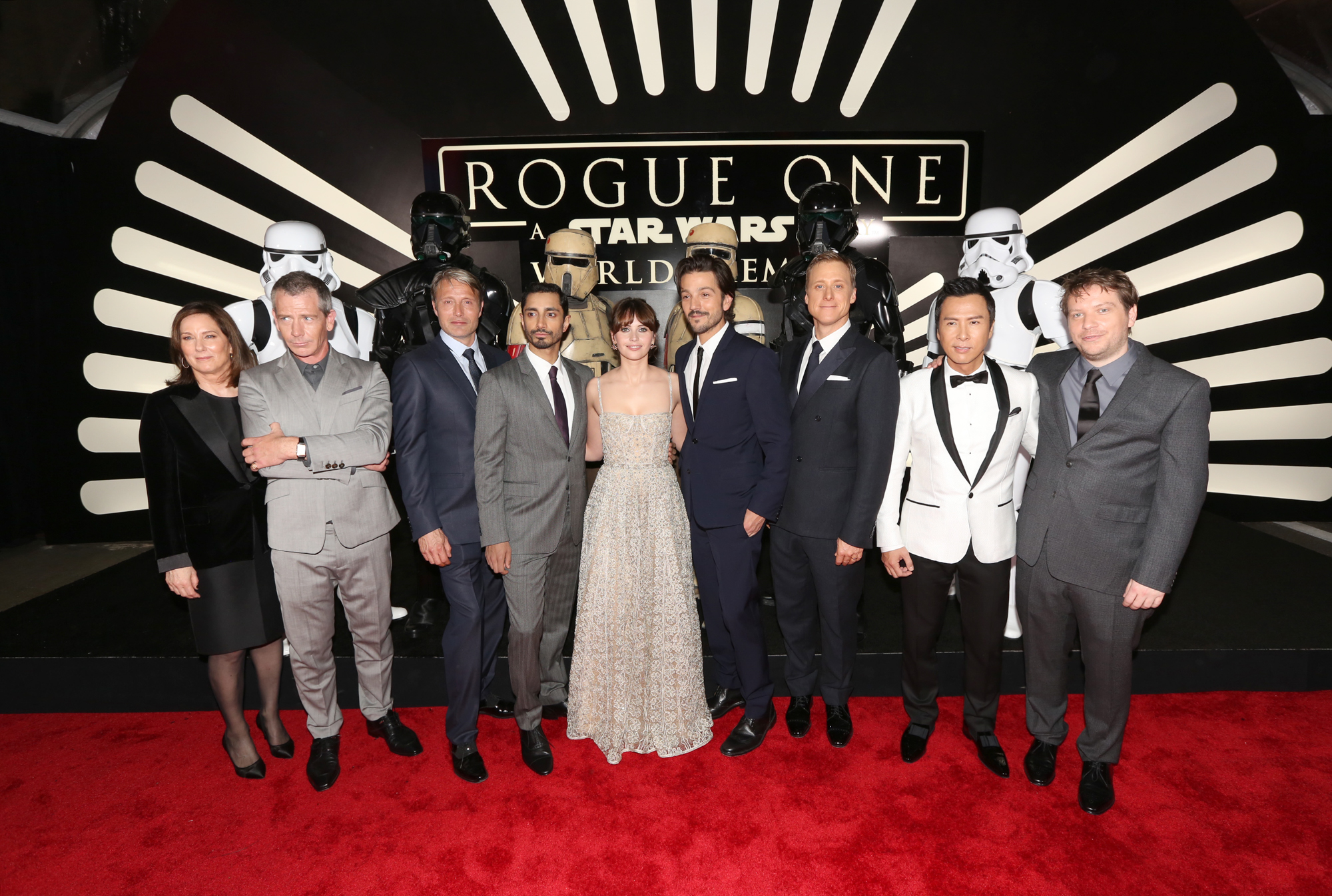 HOLLYWOOD, CA – DECEMBER 10: (L-R front row) Actors Mads Mikkelsen, Riz Ahmed, Felicity Jones, Diego Luna and Alan Tudyk (back row) Director Gareth Edwards, Chairman, The Walt Disney Studios, Alan Horn, Producer Kathleen Kennedy, Actor Ben Mendelsohn and Executive producer Jason McGatlin attend The World Premiere of Lucasfilm’s highly anticipated, first-ever, standalone Star Wars adventure, “Rogue One: A Star Wars Story” at the Pantages Theatre on December 10, 2016 in Hollywood, California. (Photo by Rich Polk/Getty Images for Disney) *** Local Caption *** Mads Mikkelsen; Riz Ahmed; Felicity Jones; Diego Luna; Alan Tudyk; Gareth Edwards; Alan Horn; Kathleen Kennedy; Ben mendelsohn; Jason McGatlin