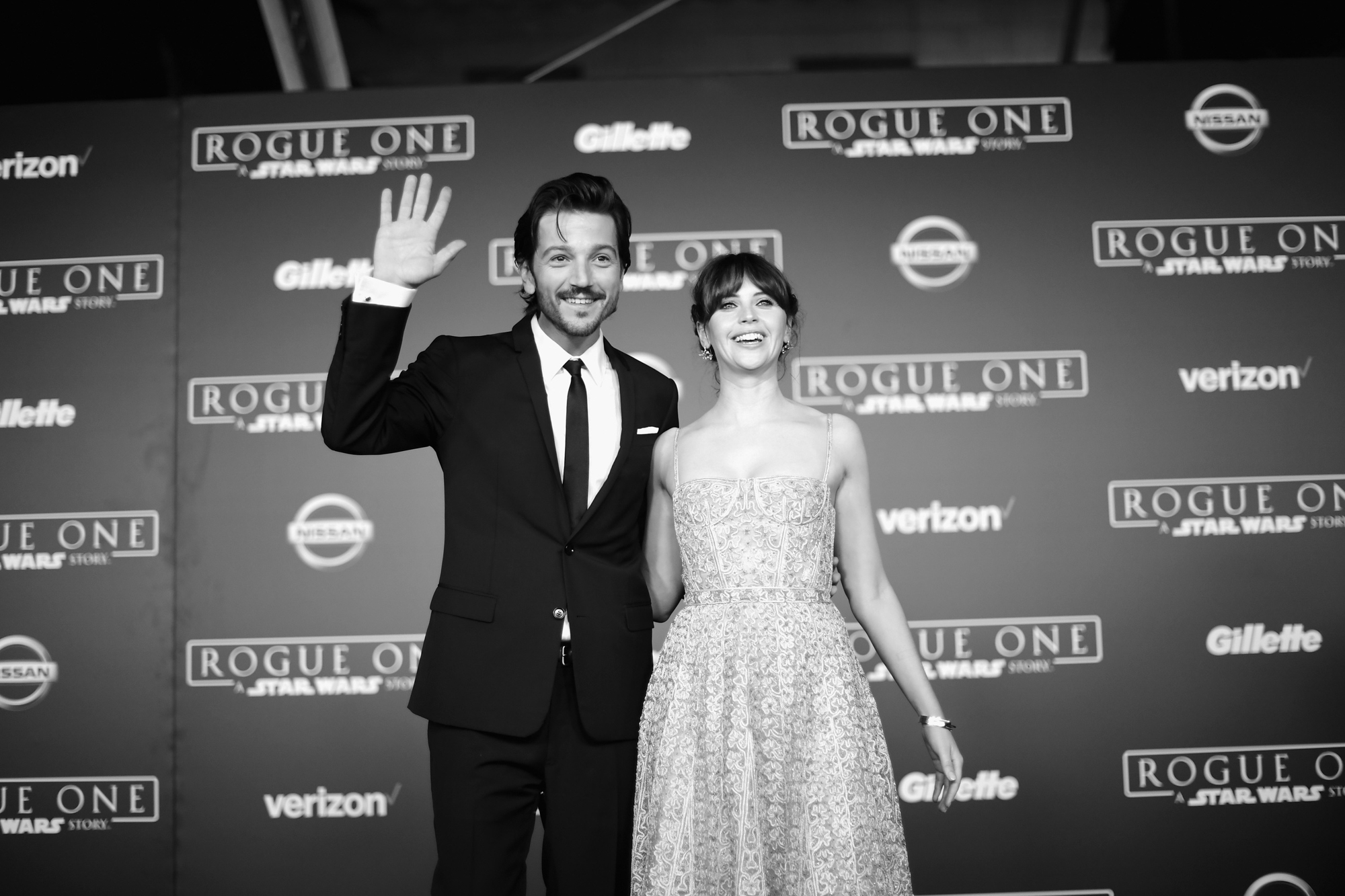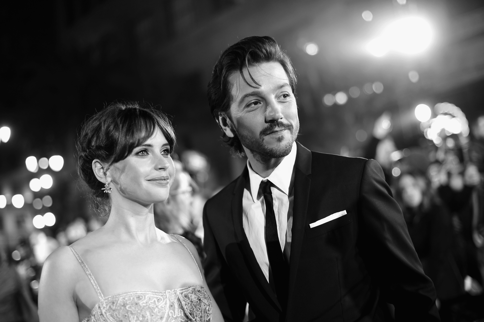 HOLLYWOOD, CA – DECEMBER 10: (EDITORS NOTE: Image has been shot in black and white. Color version not available.) Actors Felicity Jones (L) and Diego Luna attend The World Premiere of Lucasfilm’s highly anticipated, first-ever, standalone Star Wars adventure, “Rogue One: A Star Wars Story” at the Pantages Theatre on December 10, 2016 in Hollywood, California. (Photo by Charley Gallay/Getty Images for Disney) *** Local Caption *** Diego Luna; Felicity Jones