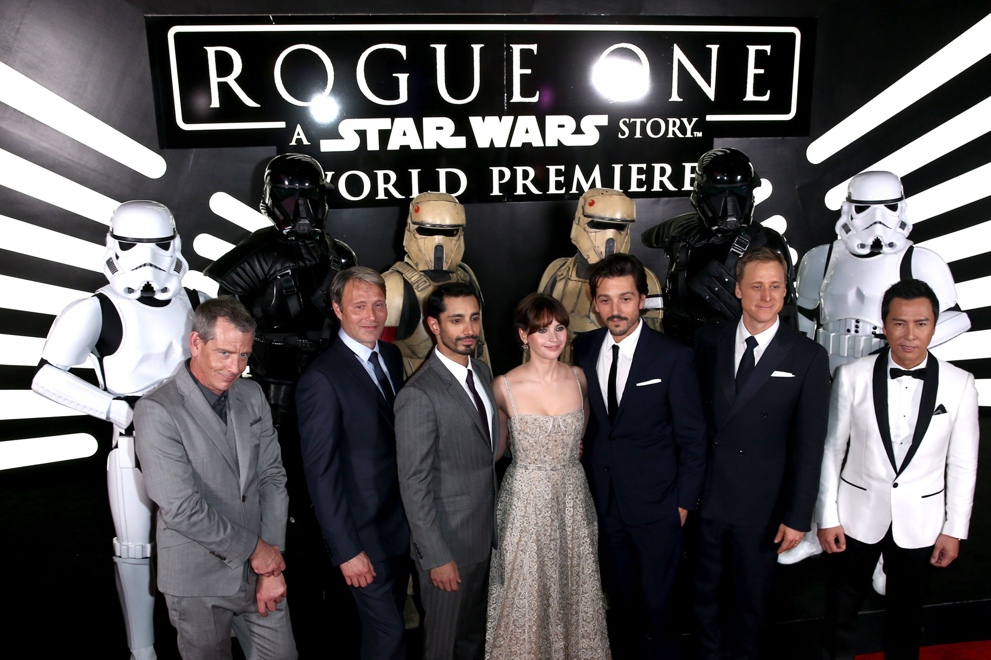 HOLLYWOOD, CA – DECEMBER 10: (L-R) Actors Ben Mendelsohn, Mads Mikkelsen, Riz Ahmed, Felicity Jones, Diego Luna, Alan Tudyk and Donnie Yen attend The World Premiere of Lucasfilm’s highly anticipated, first-ever, standalone Star Wars adventure, “Rogue One: A Star Wars Story” at the Pantages Theatre on December 10, 2016 in Hollywood, California. (Photo by Joe Scarnici/Getty Images for Disney) *** Local Caption *** Ben Mendelsohn; Mads Mikkelsen; Riz Ahmed; Felicity Jones; Diego Luna; Alan Tudyk; Donnie Yen