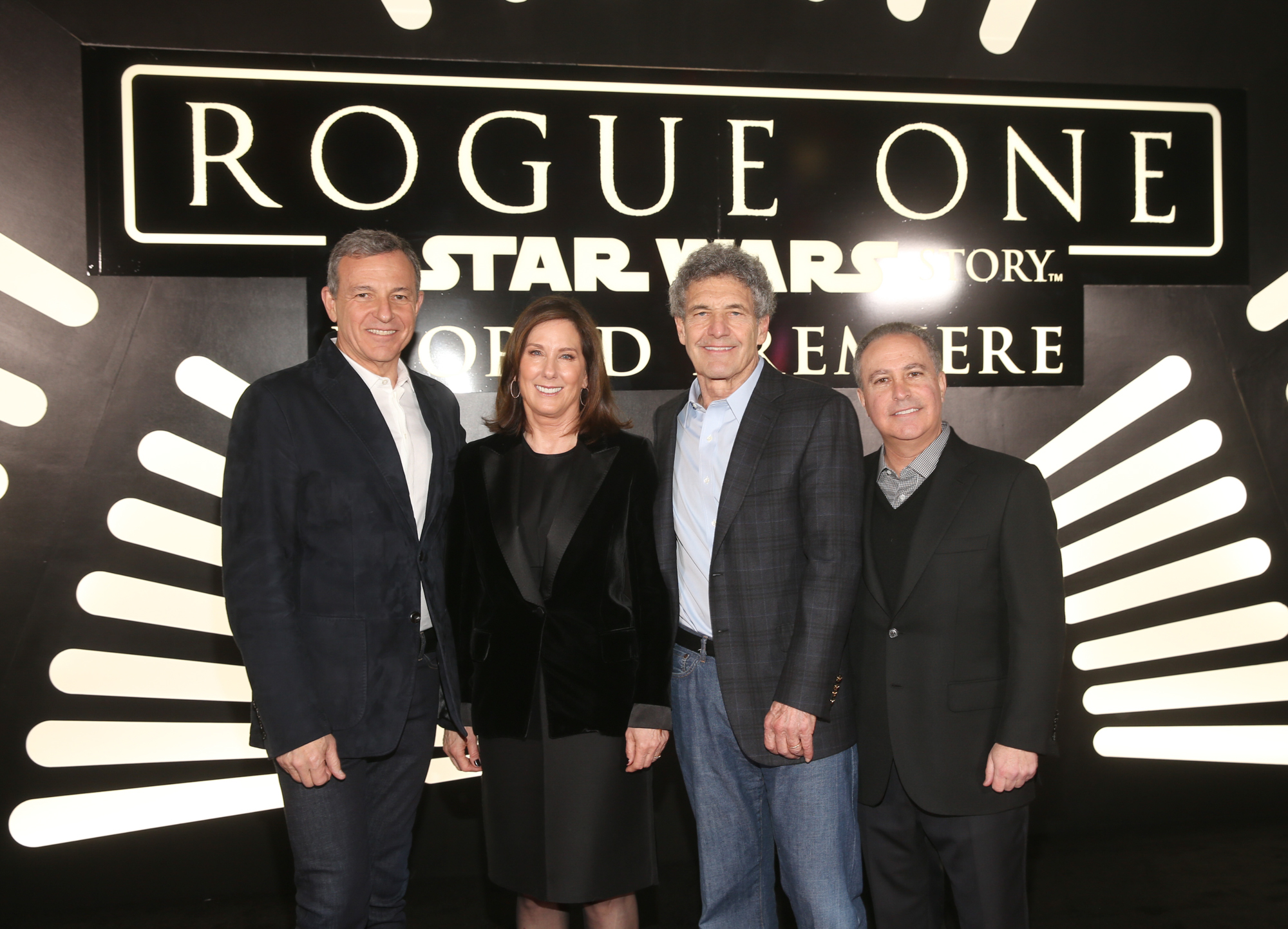 HOLLYWOOD, CA – DECEMBER 10: (L-R) The Walt Disney Company Chairman and CEO Bob Iger, Producer Kathleen Kennedy, Chairman, The Walt Disney Studios, Alan Horn and Walt Disney Studios President Alan Bergman attend The World Premiere of Lucasfilm’s highly anticipated, first-ever, standalone Star Wars adventure, “Rogue One: A Star Wars Story” at the Pantages Theatre on December 10, 2016 in Hollywood, California. (Photo by Jesse Grant/Getty Images for Disney) *** Local Caption *** Bob Iger; Kathleen Kennedy; Alan Horn; Alan Bergman