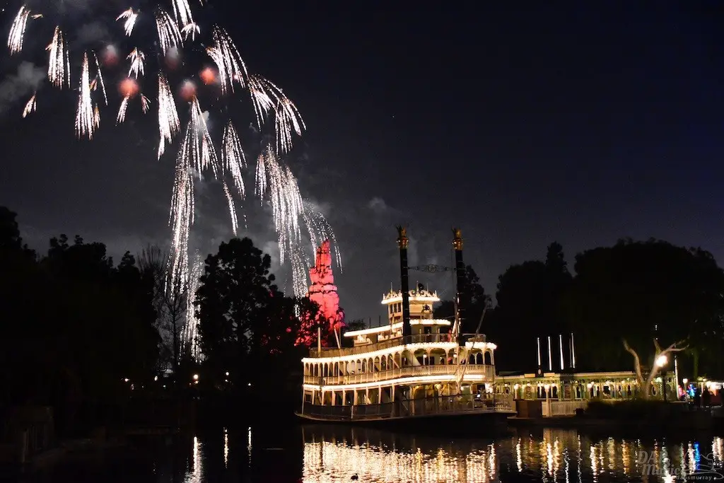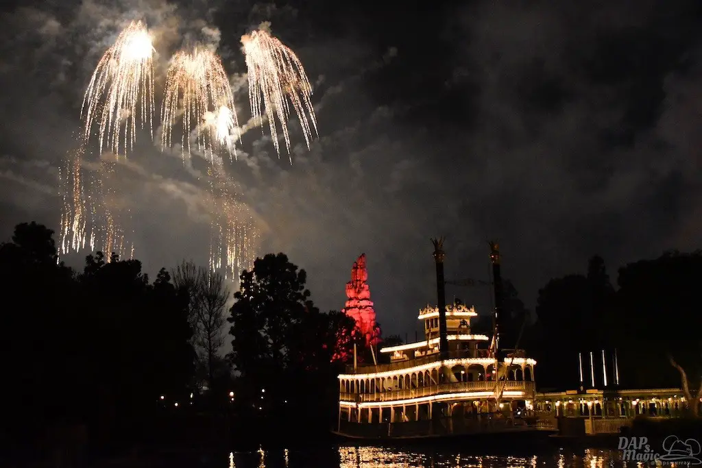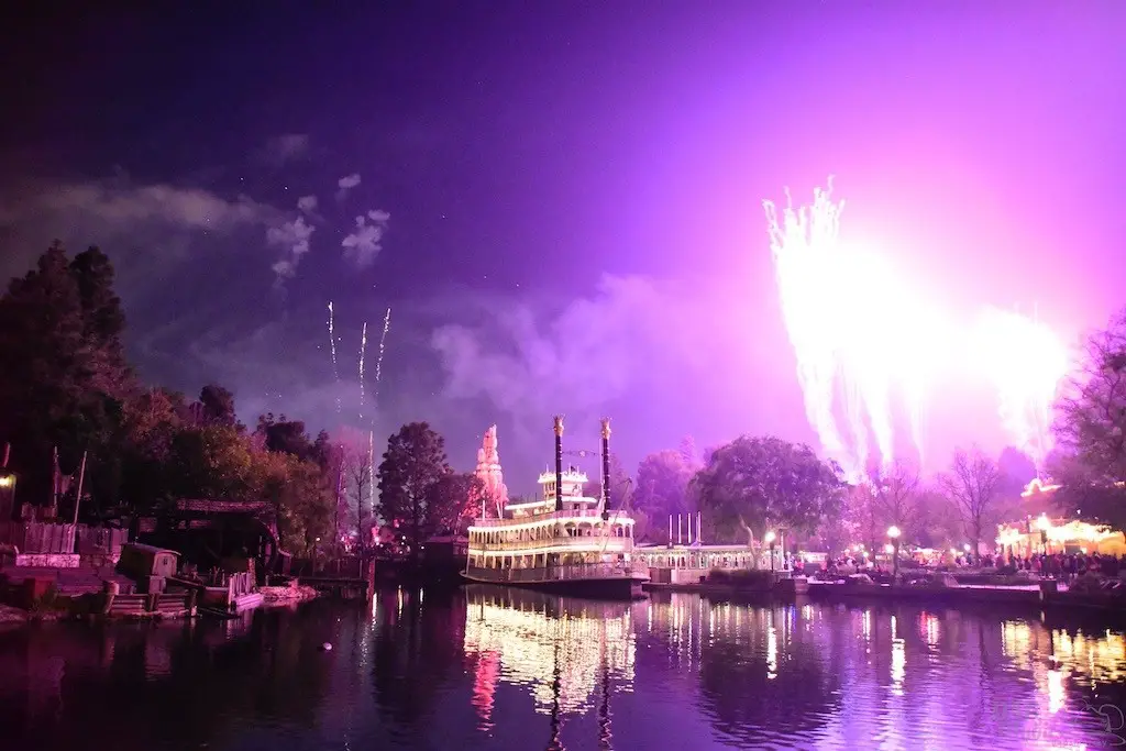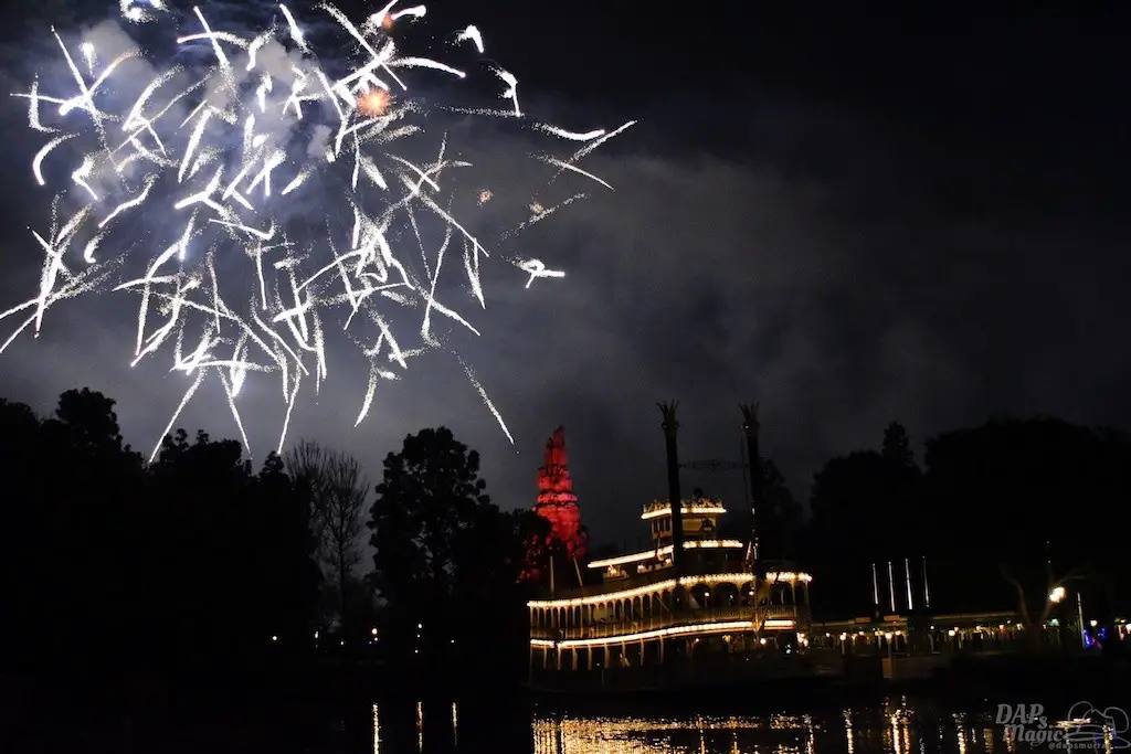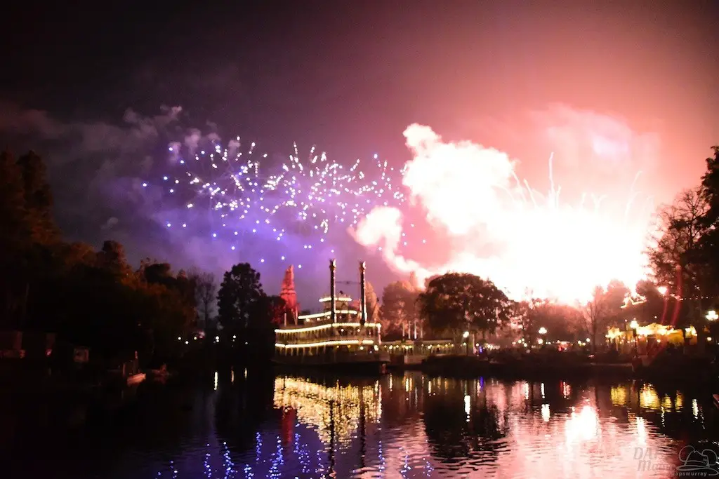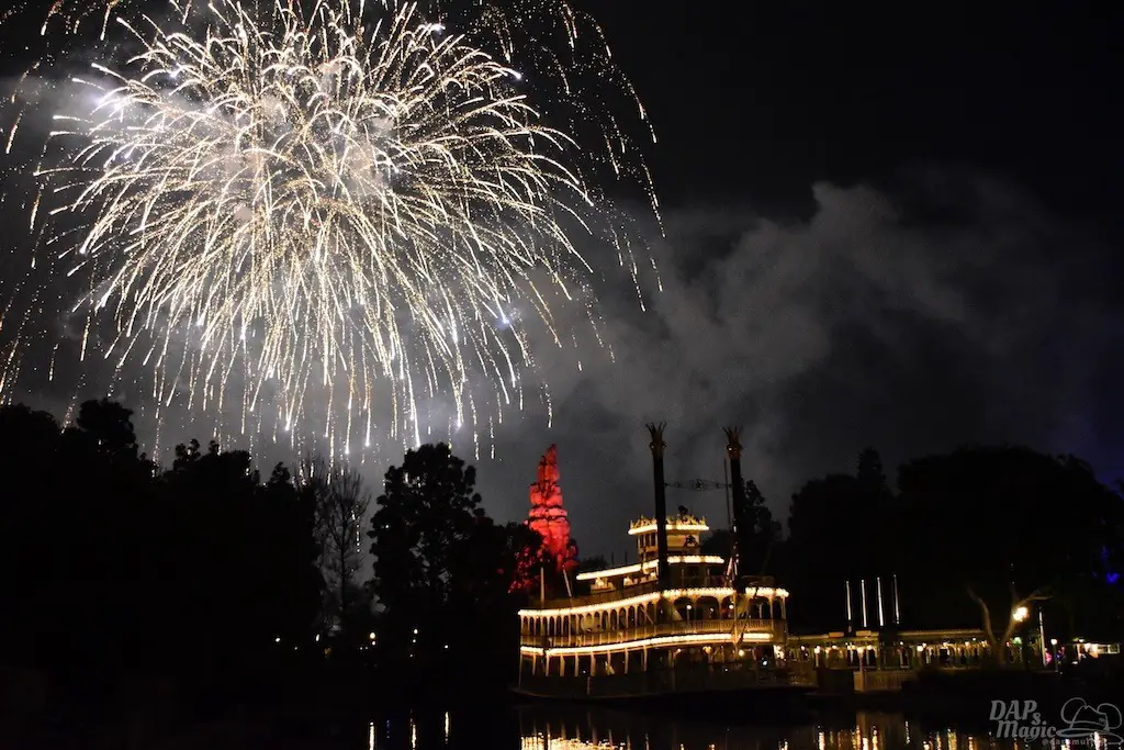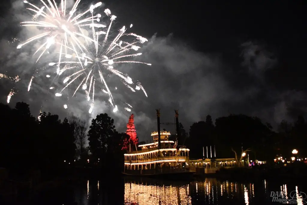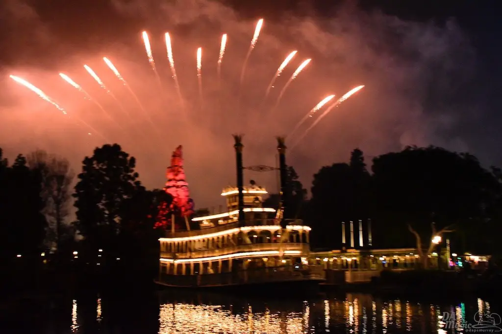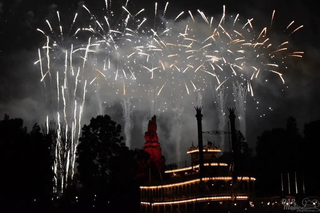 With Remember…Dreams Come True, we decided to go to an area that is rarely observed for the fireworks show. In Frontierland, the Mark Twain and Big Thunder Mountain landscape provided a nice skyline for the night show.