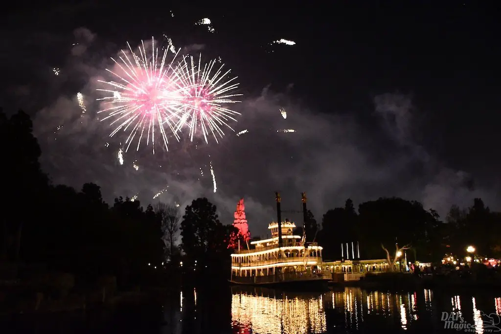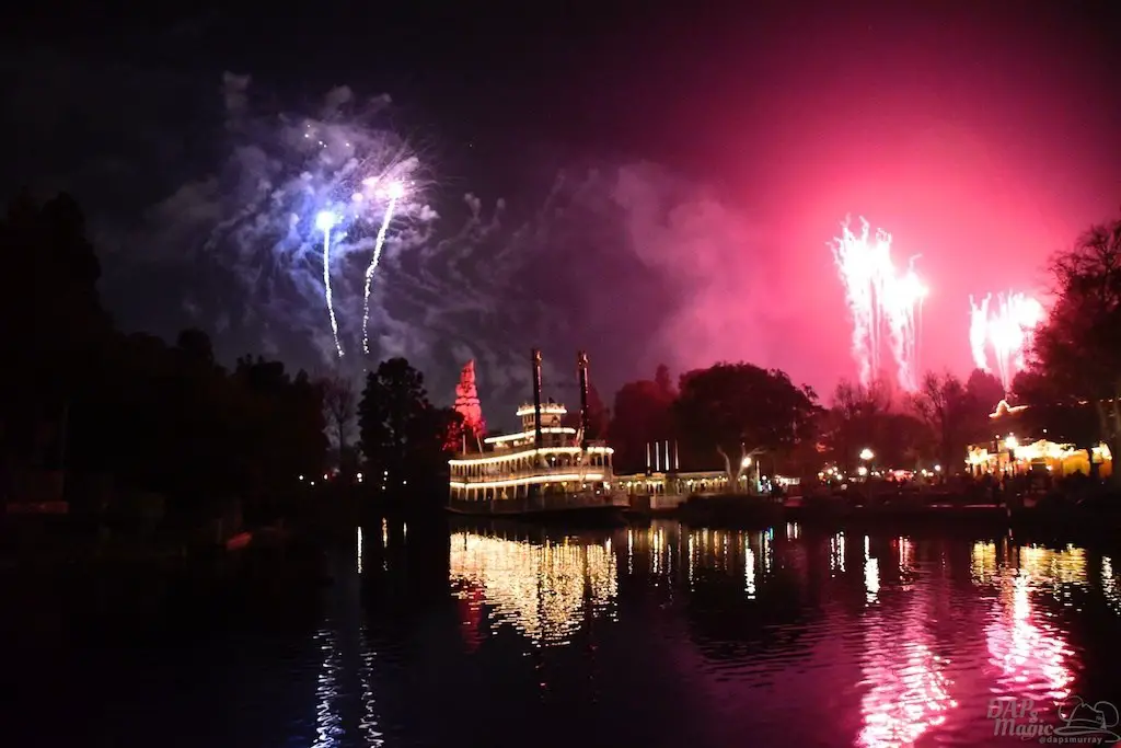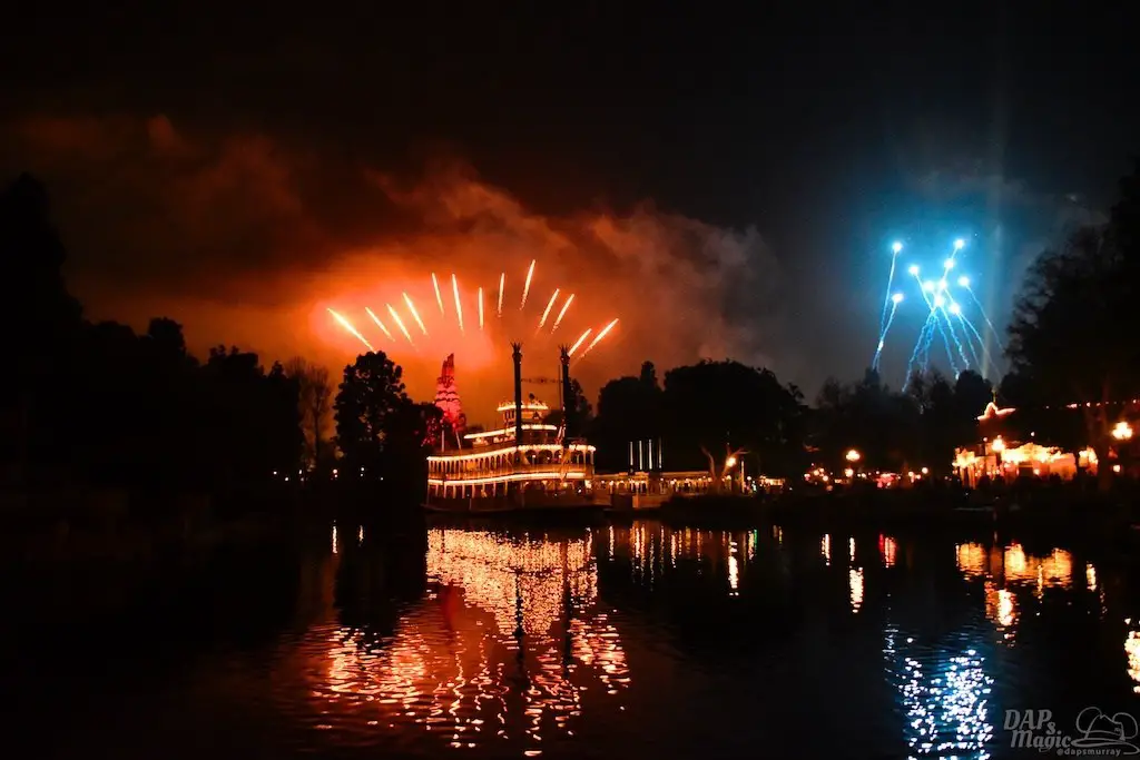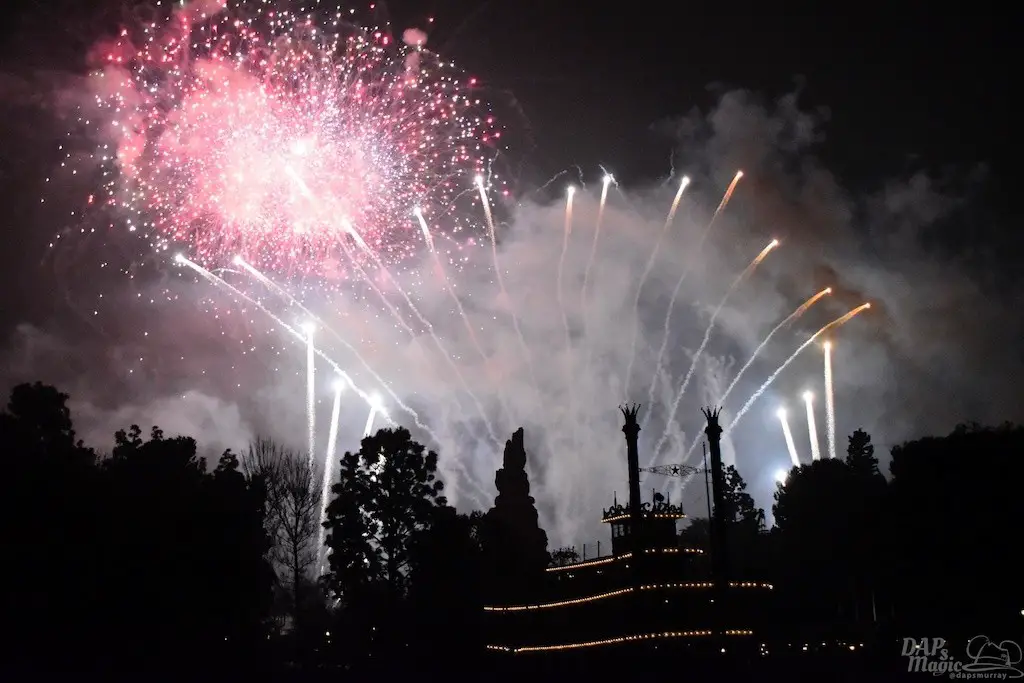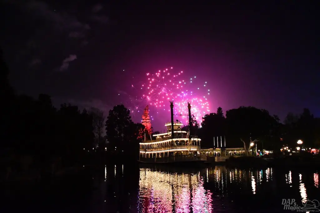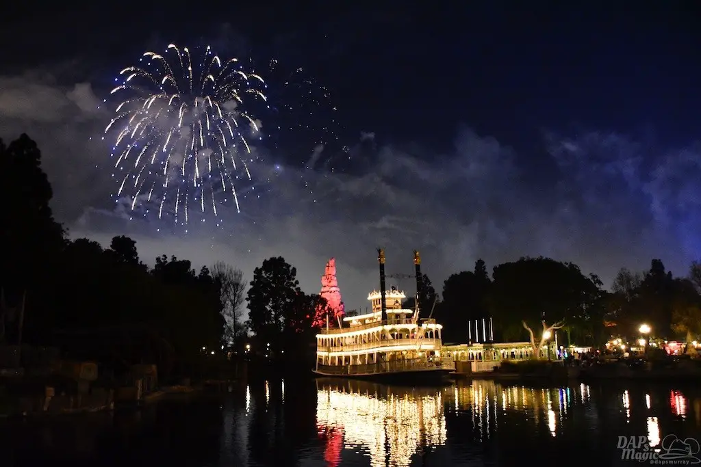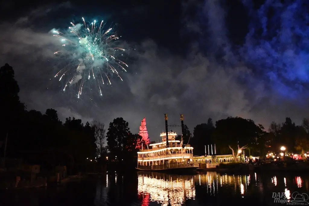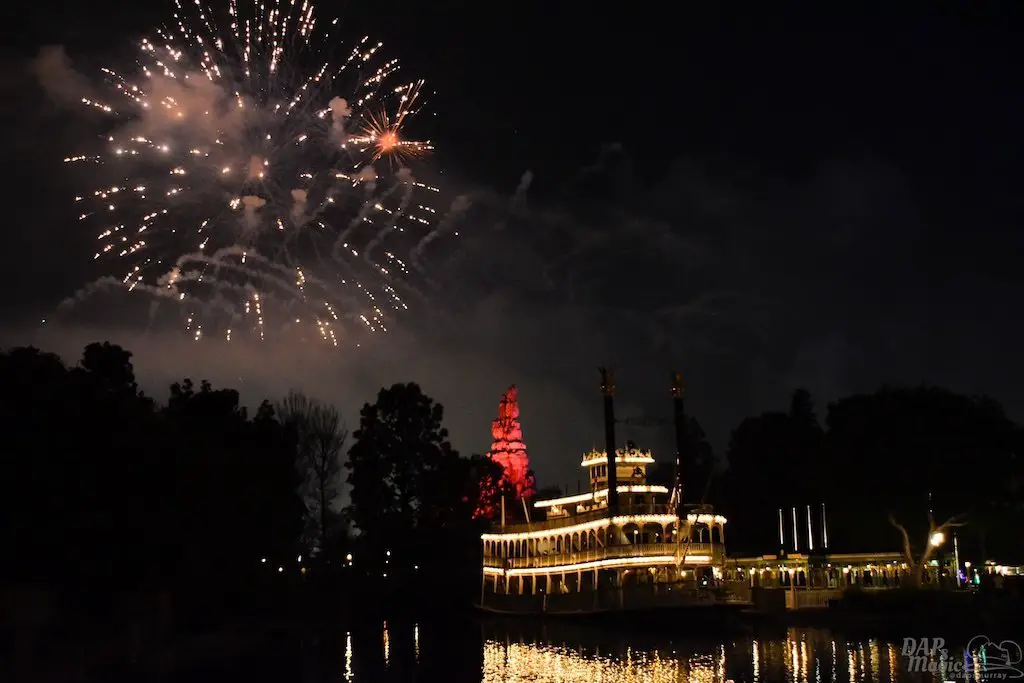 With Remember…Dreams Come True, we decided to go to an area that is rarely observed for the fireworks show. In Frontierland, the Mark Twain and Big Thunder Mountain landscape provided a nice skyline for the night show.