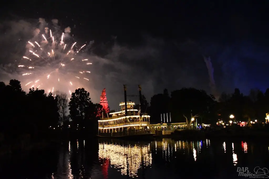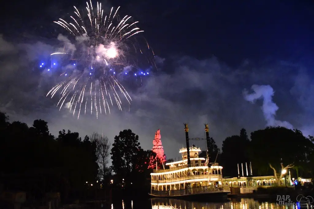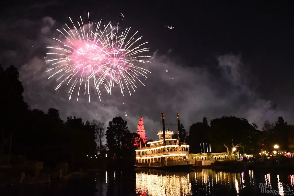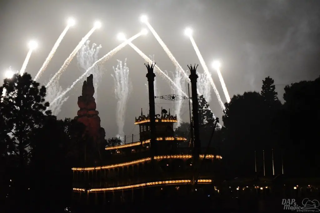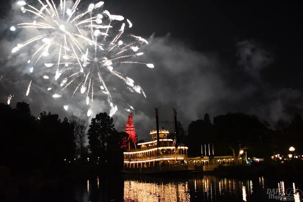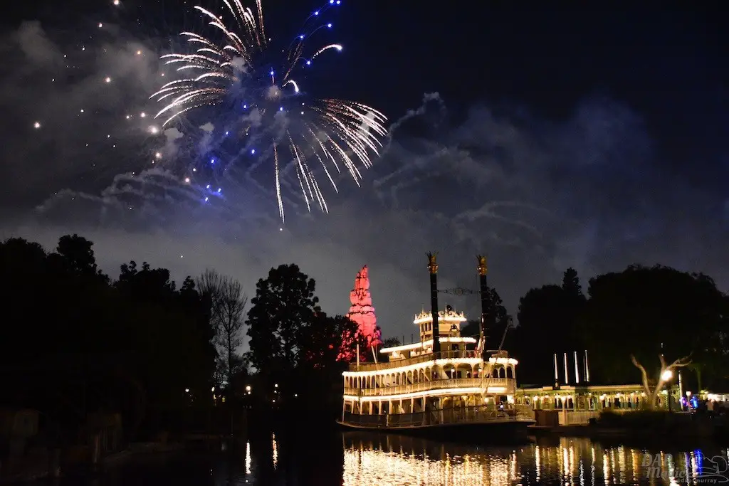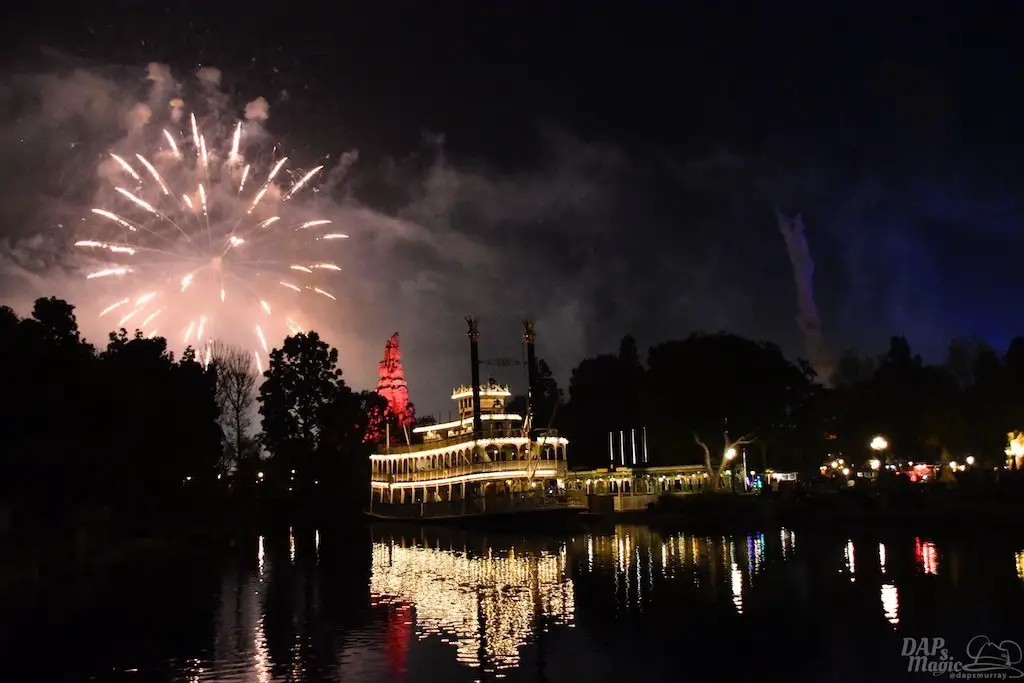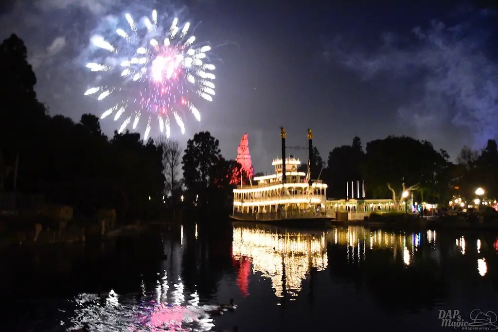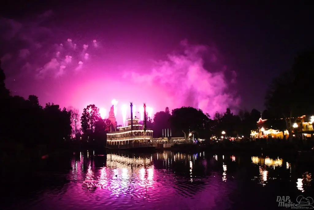 With Remember…Dreams Come True, we decided to go to an area that is rarely observed for the fireworks show. In Frontierland, the Mark Twain and Big Thunder Mountain landscape provided a nice skyline for the night show.