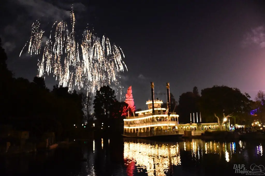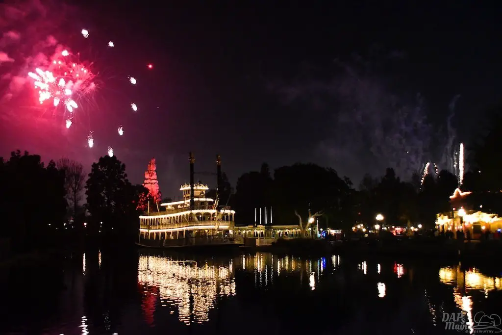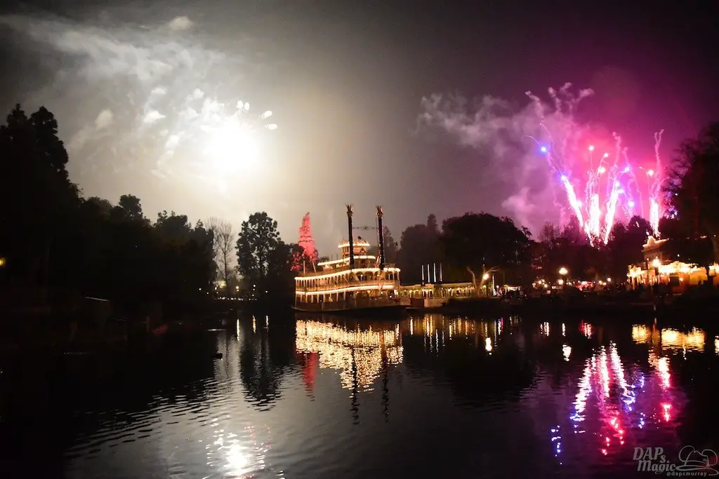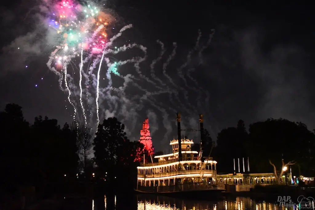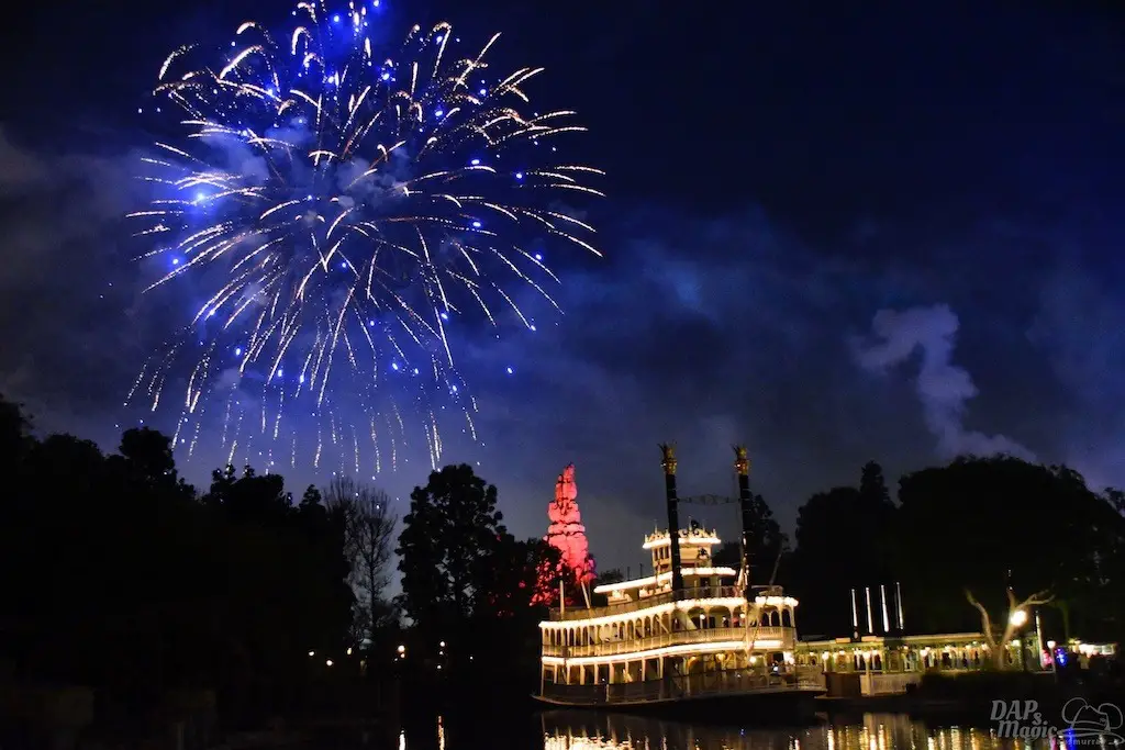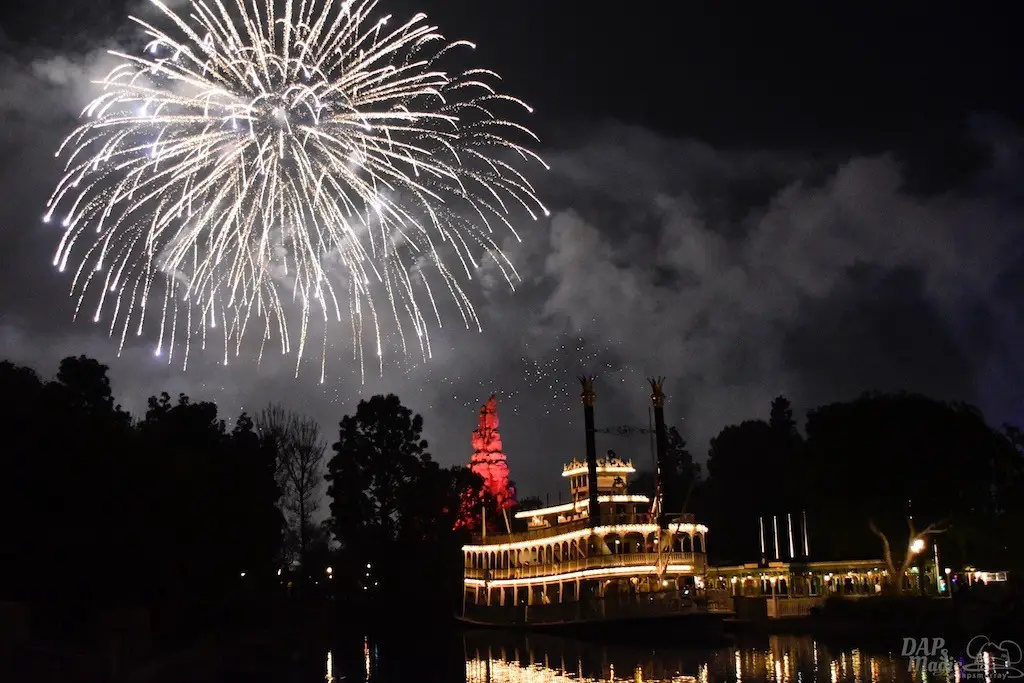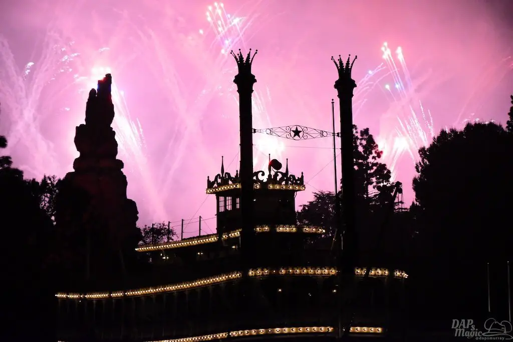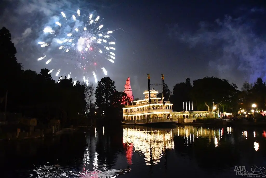 With Remember…Dreams Come True, we decided to go to an area that is rarely observed for the fireworks show. In Frontierland, the Mark Twain and Big Thunder Mountain landscape provided a nice skyline for the night show.