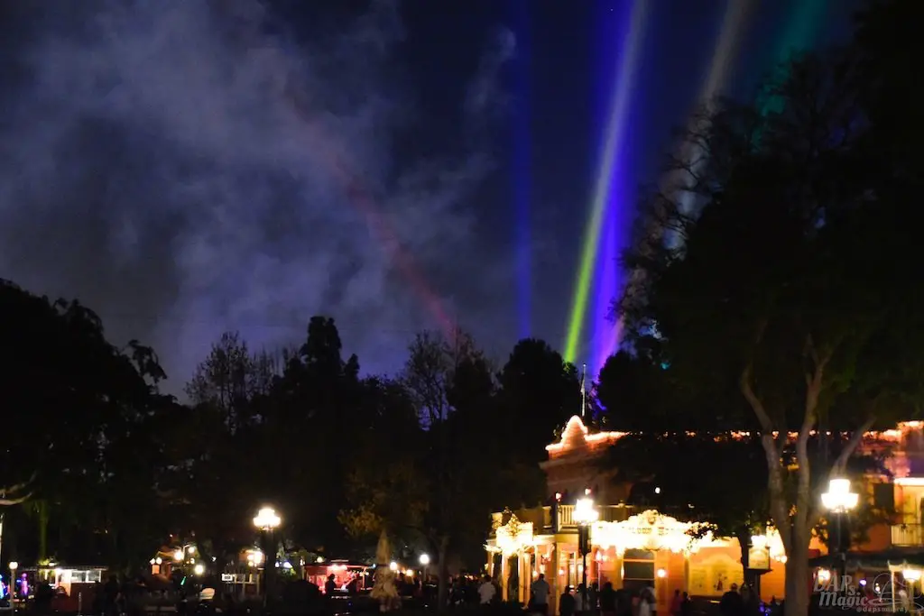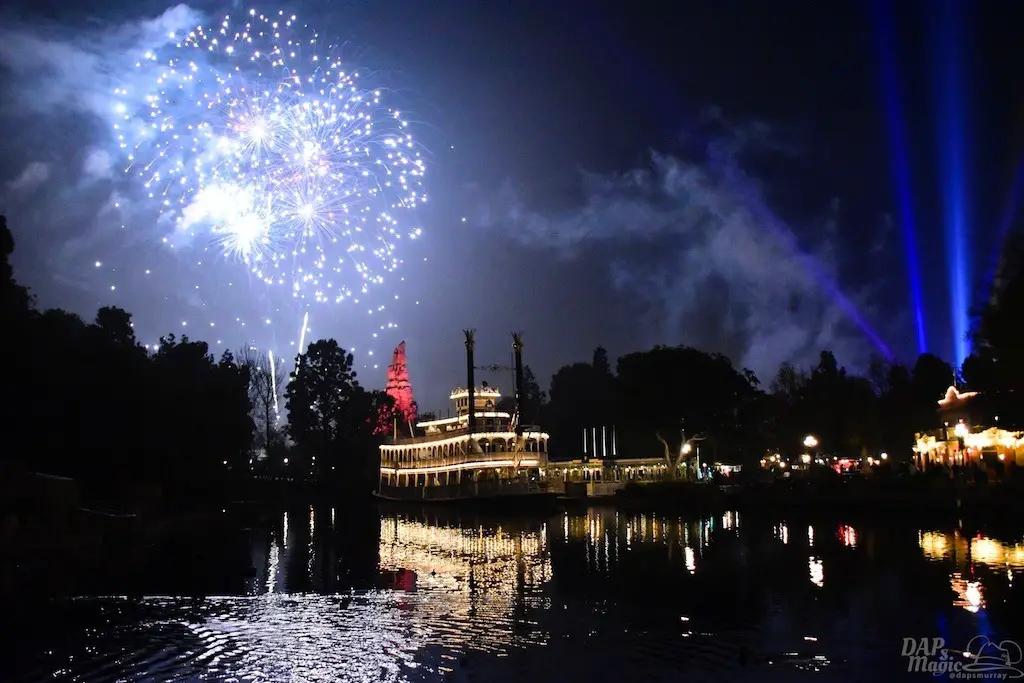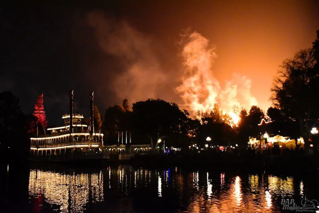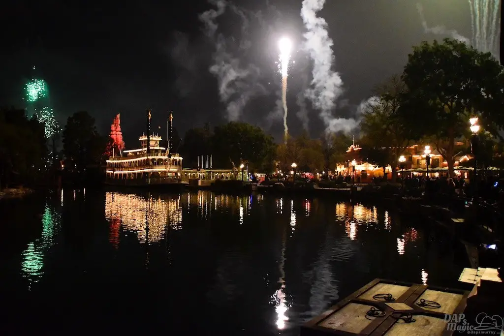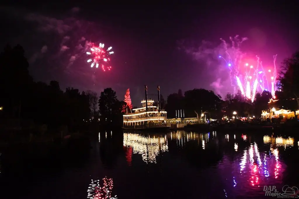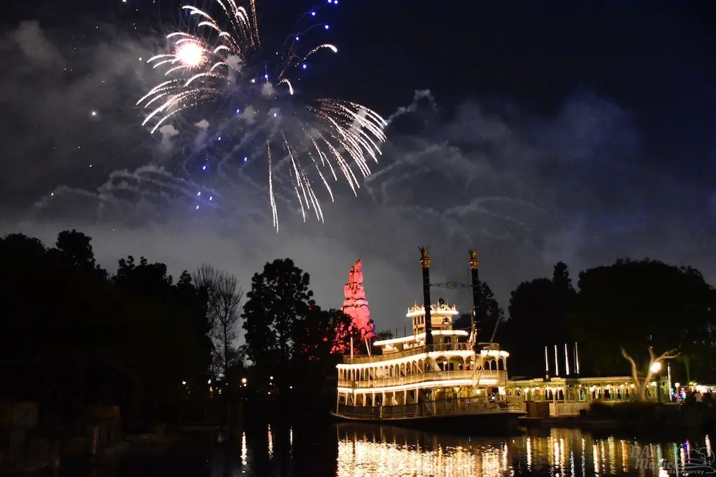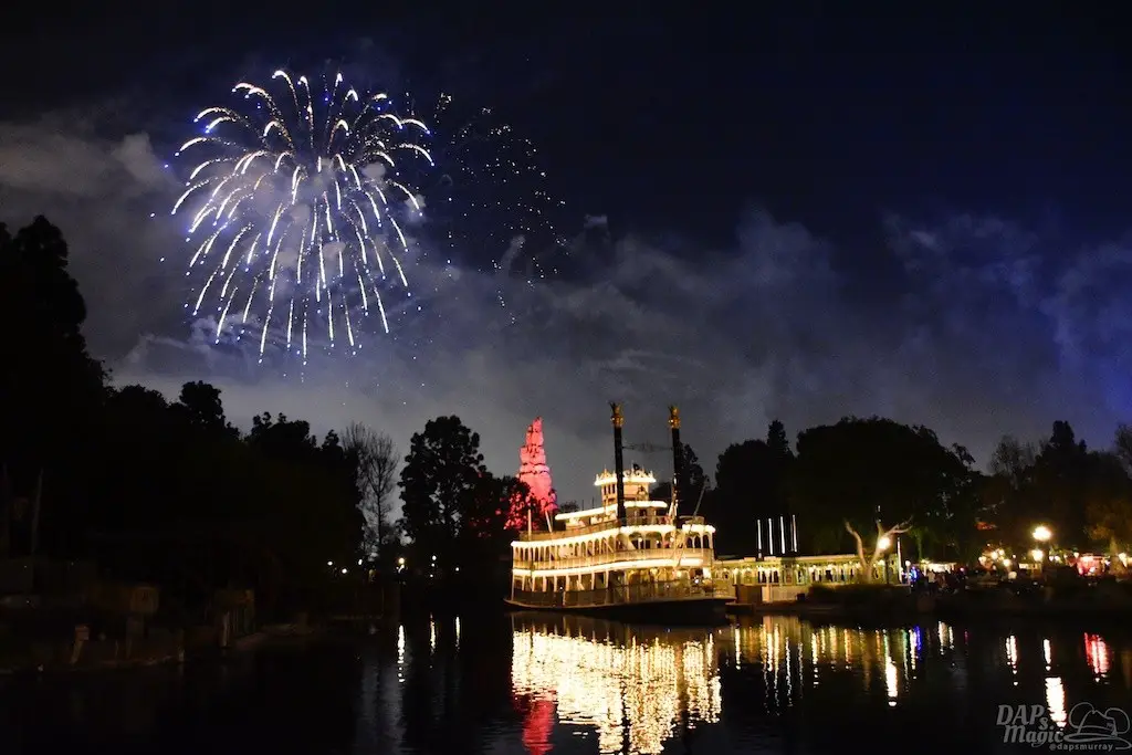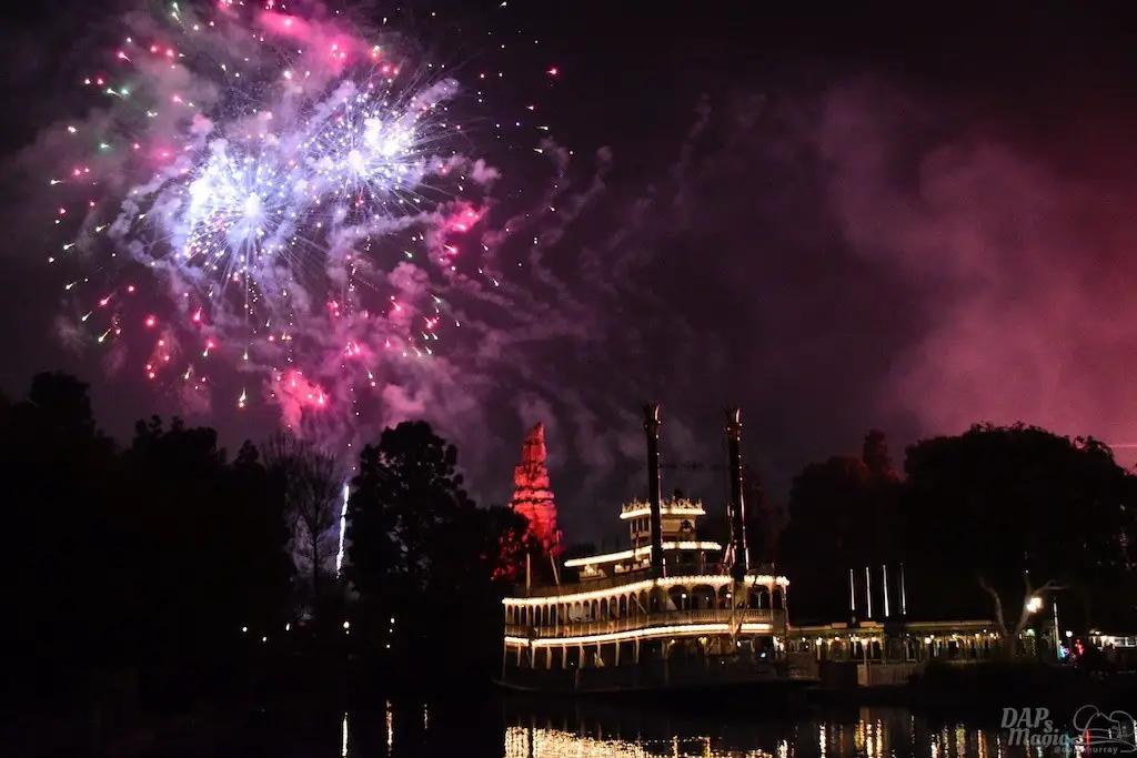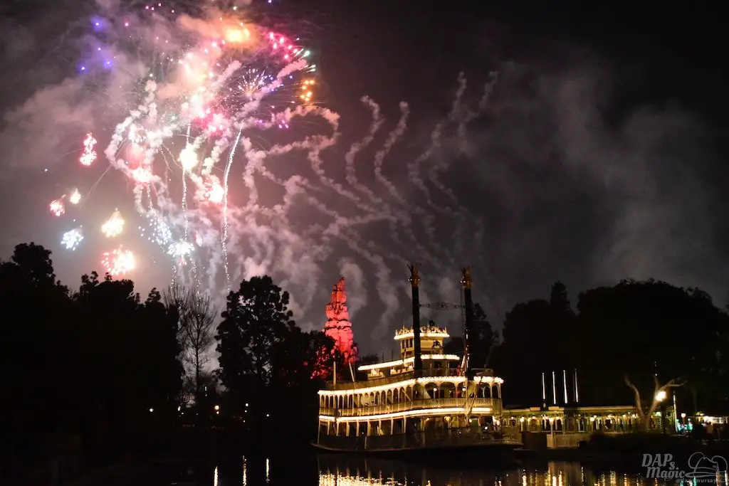 With Remember…Dreams Come True, we decided to go to an area that is rarely observed for the fireworks show. In Frontierland, the Mark Twain and Big Thunder Mountain landscape provided a nice skyline for the night show.