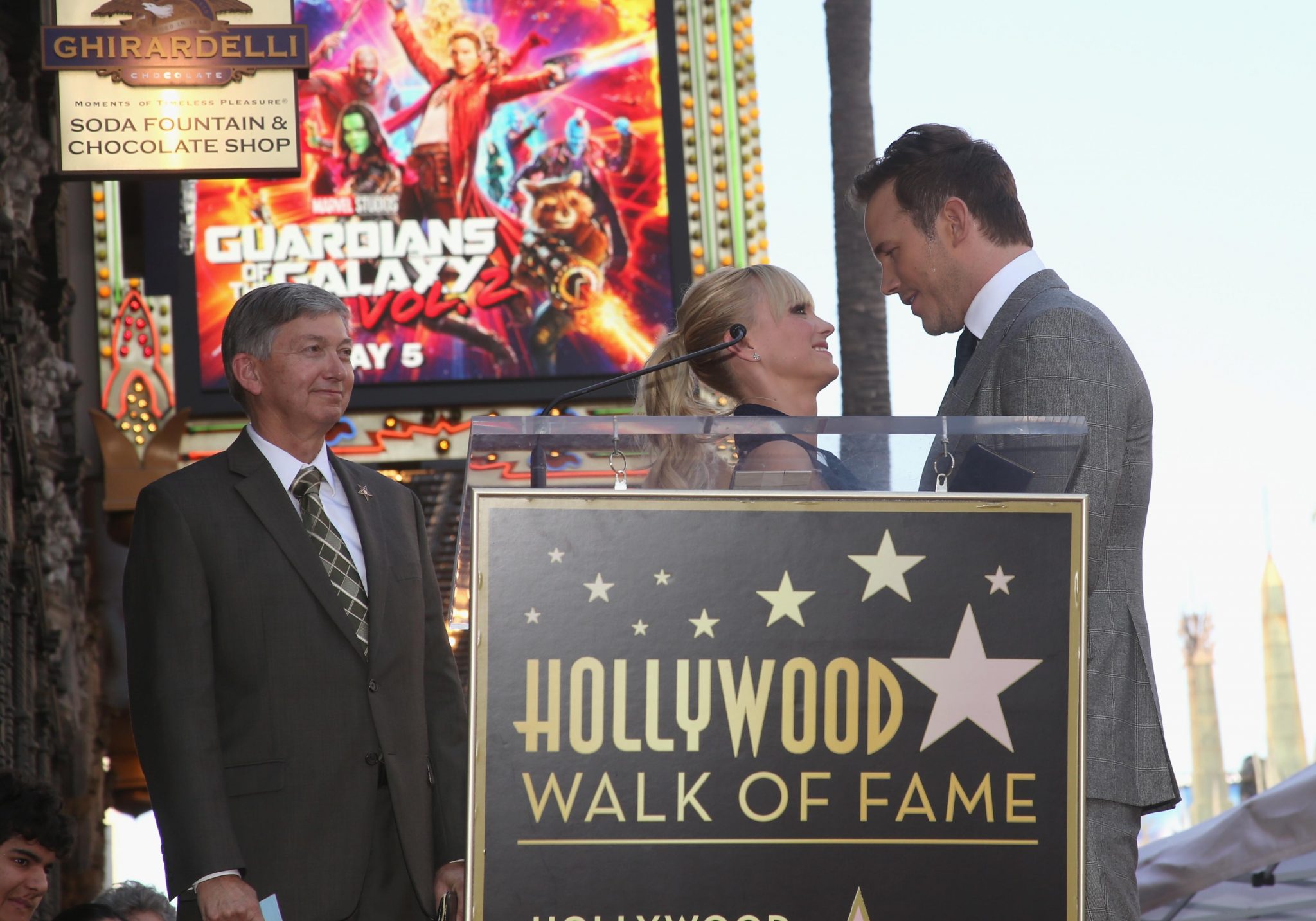 HOLLYWOOD, CA – APRIL 21: (L-R) Hollywood Chamber of Commerce, President/CEO Leron Gubler, actors Anna Faris and Chris Pratt at the Chris Pratt Walk Of Fame Star Ceremony on April 21, 2017 in Hollywood, California. (Photo by Jesse Grant/Getty Images for Disney) *** Local Caption *** Leron Gubler; Anna Faris; Chris Pratt