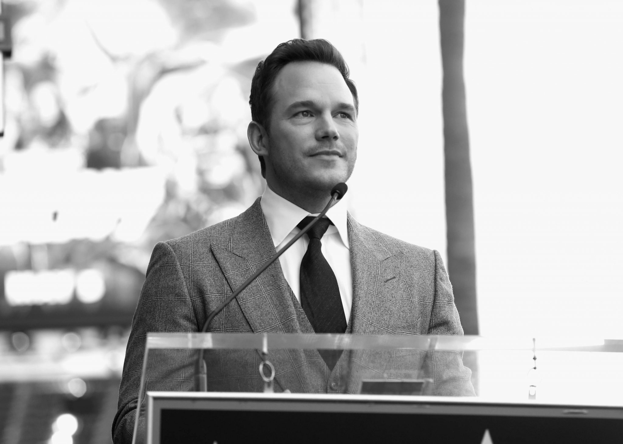 HOLLYWOOD, CA – APRIL 21: (EDITOR’S NOTE: Image has been shot in black and white.) Actor Chris Pratt at the Chris Pratt Walk Of Fame Star Ceremony on April 21, 2017 in Hollywood, California. (Photo by Jesse Grant/Getty Images for Disney) *** Local Caption *** Chris Pratt