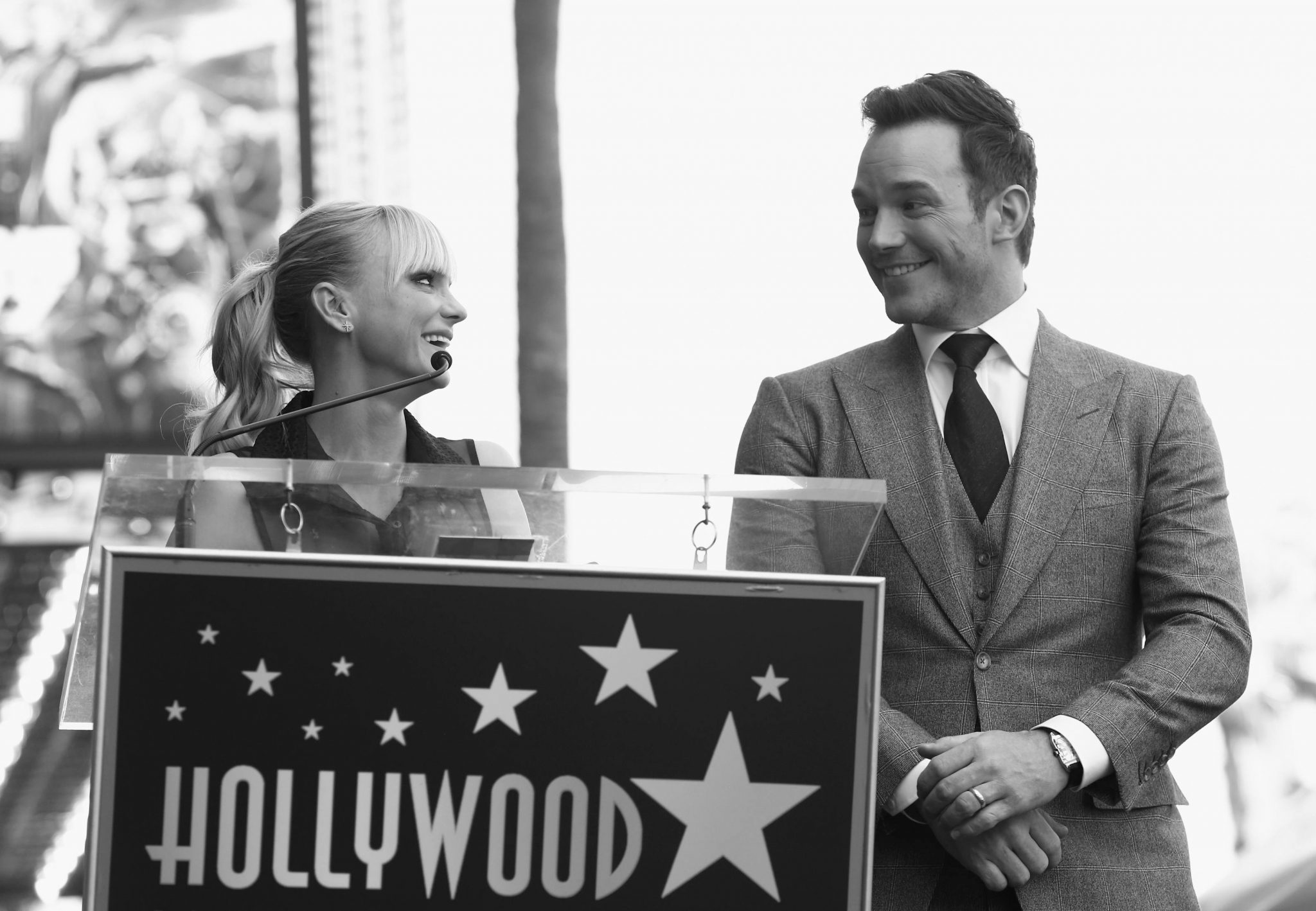 HOLLYWOOD, CA – APRIL 21: (EDITOR’S NOTE: Image has been shot in black and white.) Actors Anna Faris (L) and Chris Pratt at the Chris Pratt Walk Of Fame Star Ceremony on April 21, 2017 in Hollywood, California. (Photo by Jesse Grant/Getty Images for Disney) *** Local Caption *** Anna Faris; Chris Pratt