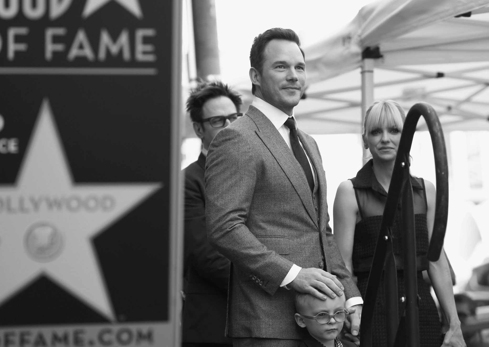 HOLLYWOOD, CA – APRIL 21: (EDITOR’S NOTE: Image has been shot in black and white.) (L-R) Writer/director James Gunn, actor Chris Pratt, Jack Pratt and actor Anna Faris at the Chris Pratt Walk Of Fame Star Ceremony on April 21, 2017 in Hollywood, California. (Photo by Jesse Grant/Getty Images for Disney) *** Local Caption *** James Gunn; Chris Pratt; Jack Pratt; Anna Faris
