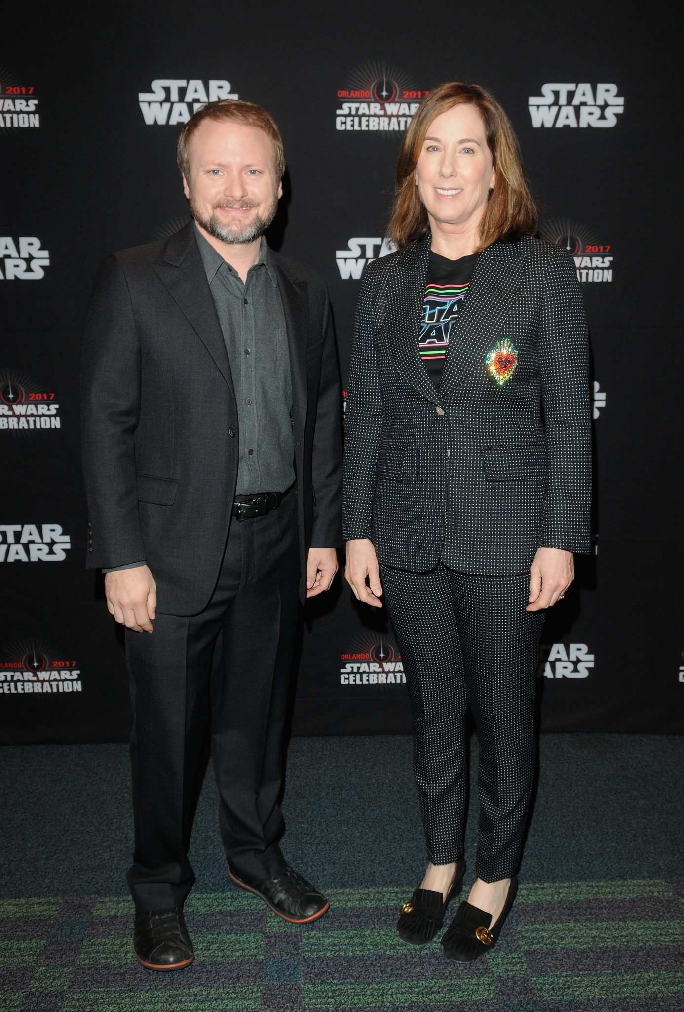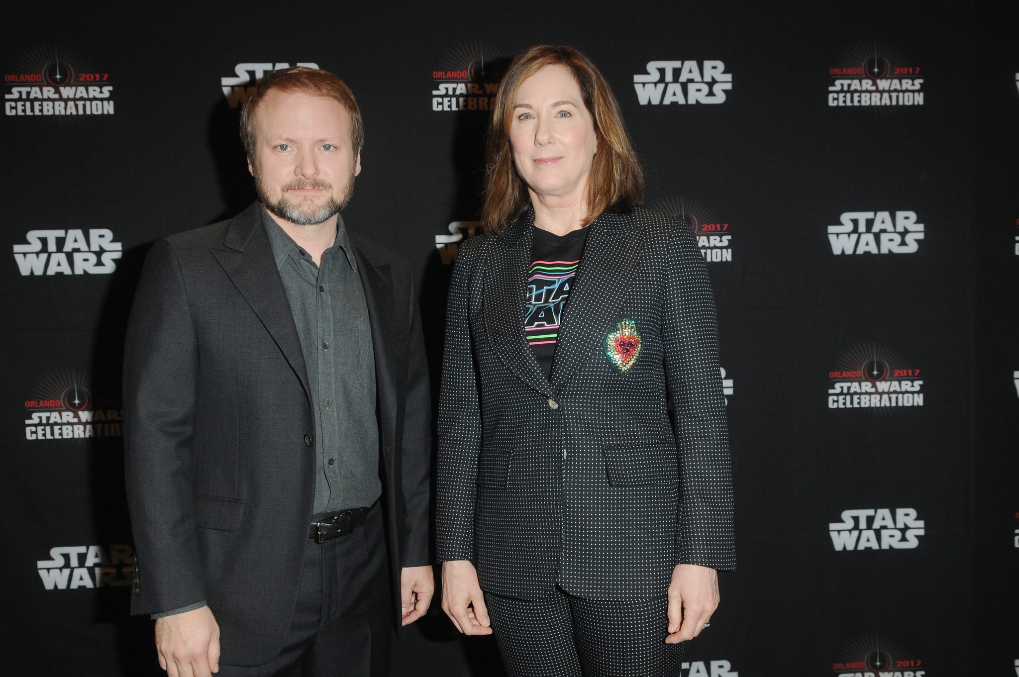 ORLANDO, FL – APRIL 14: Rian Johnson and Kathleen Kennedy attend the STAR WARS: THE LAST JEDI PANEL during the 2017 STAR WARS CELEBRATION at Orange County Convention Center on April 14, 2017 in Orlando, Florida. (Photo by Gerardo Mora/Getty Images for Disney) *** Local Caption *** Rian Johnson, Kathleen Kennedy
